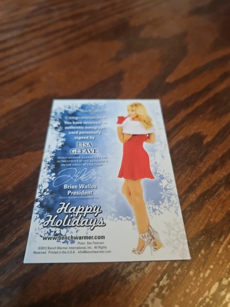 Benchwarmer 2012 Lisa Gleave Happy Holidays Autograph Gold Foil Card Auto Playboy Lisa Gleave was born on November 11, 1976 in Gold Coast, Australia. She is an actress, known for Accepted (2006) , Night of the Templar (2012) and CSI: NY (2004) . During 2005–2009, she was a model on the game show Deal or No Deal , where she always held the number 3 briefcase. She has also had roles in Accepted and CSI: NY . She is an E3 booth babe for Tecmo . Gleave is the cover model for the 2006 Maxim calendar and has been featured in Maxim and FHM . Please, look at all the pictures. Please check out my other eBay accounts... https://www.ebay.com/usr/kimmyrael https://www.ebay.com/usr/matlac99 https://www.ebay.com/usr/lacr6837 https://www.ebay.com/usr/malac9440 https://www.ebay.com/usr/lacr_3567 https://www.ebay.com/usr/lacroki8 https://www.ebay.com/usr/lacroki9 Shipping only to the continental US unless you contact me first. Will combine shipping!!!