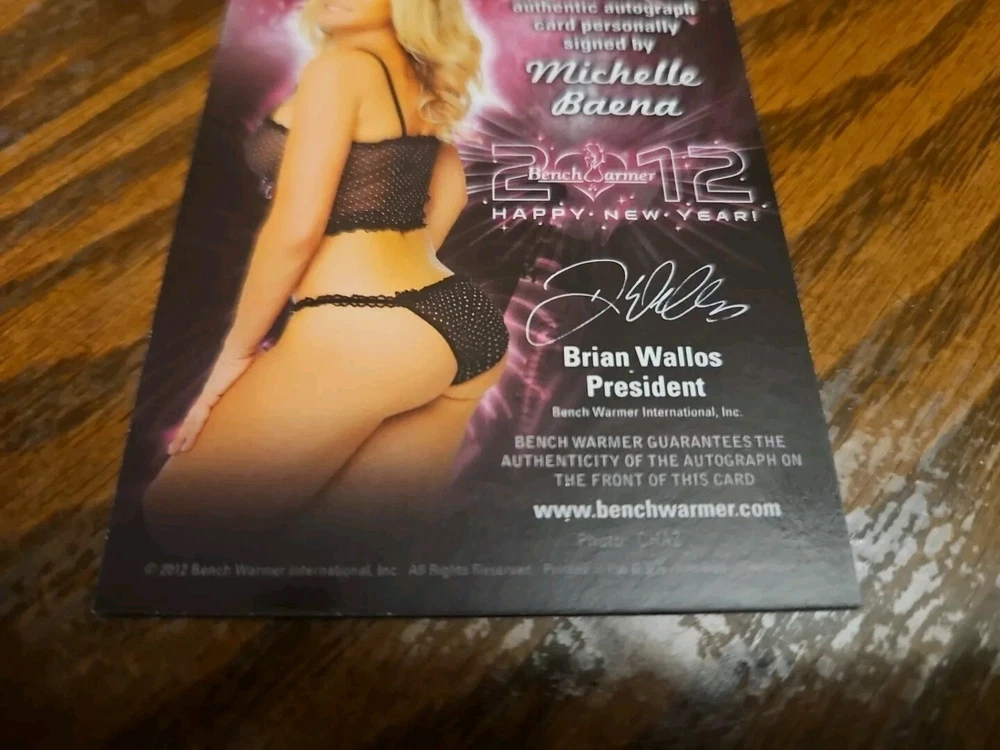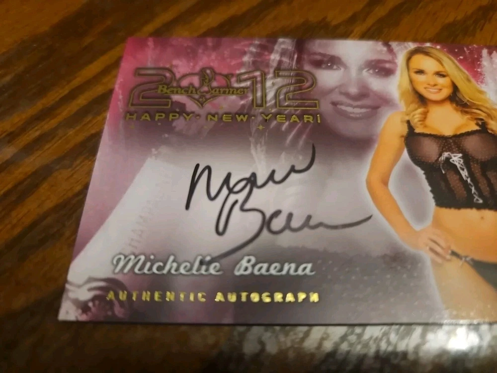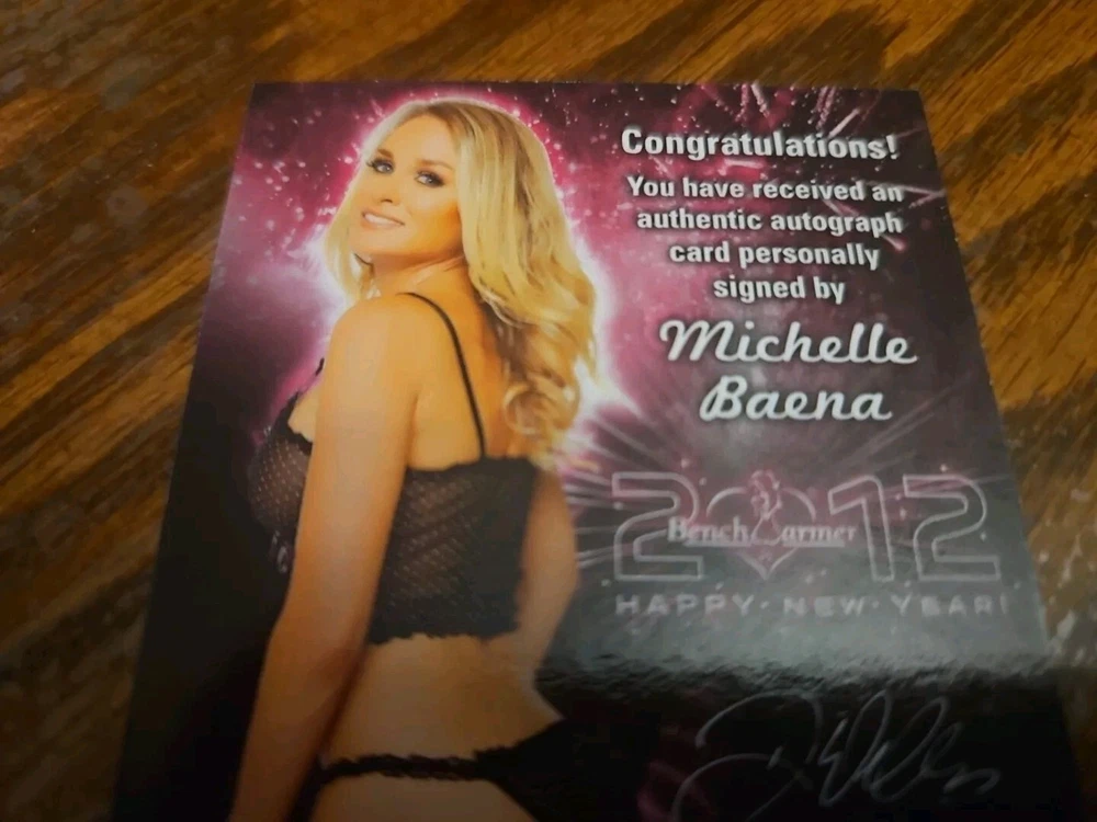Benchwarmer 2012 Michelle Baena Happy New Year Autograph Gold Foil Card Auto Playboy Busty, shapely, and enticing blonde 5'3" bombshell Michelle Marie Baena was born on December 24, 1972 in Muncie, Indiana. Michelle had to travel a lot as a kid because of her father's career: She attended elementary school in Edmond, Oklahoma; resided in Folsom, California in the fifth grade, and lived in Stanley, Kansas when she was in the eighth grade. Baena moved to California at age seventeen. In August, 2004 Michelle decided to pursue a modeling career at age thirty-one. Baena came in fourth place in the Bay City Area Hawaiian Tropic contest. She sent several photos of herself to Playboy.com and was chosen be both grace the cover of and do a pictorial in the May, 2005 issue of the famous men's magazine. Michelle has subsequently gone on to model for Mystique, Mac & Bumble, the USA National Bikini Team, and Benchwarmer Trading Cards. Moreover, Baena has posed for pictorials in such publications as "American Curves," "Rockstar," and "Skateboarder." Please, look at all the pictures. Please check out my other eBay accounts... https://www.ebay.com/usr/kimmyrael https://www.ebay.com/usr/matlac99 https://www.ebay.com/usr/lacr6837 https://www.ebay.com/usr/malac9440 https://www.ebay.com/usr/lacr_3567 https://www.ebay.com/usr/lacroki8 https://www.ebay.com/usr/lacroki9 Shipping only to the continental US unless you contact me first. Will combine shipping!!!