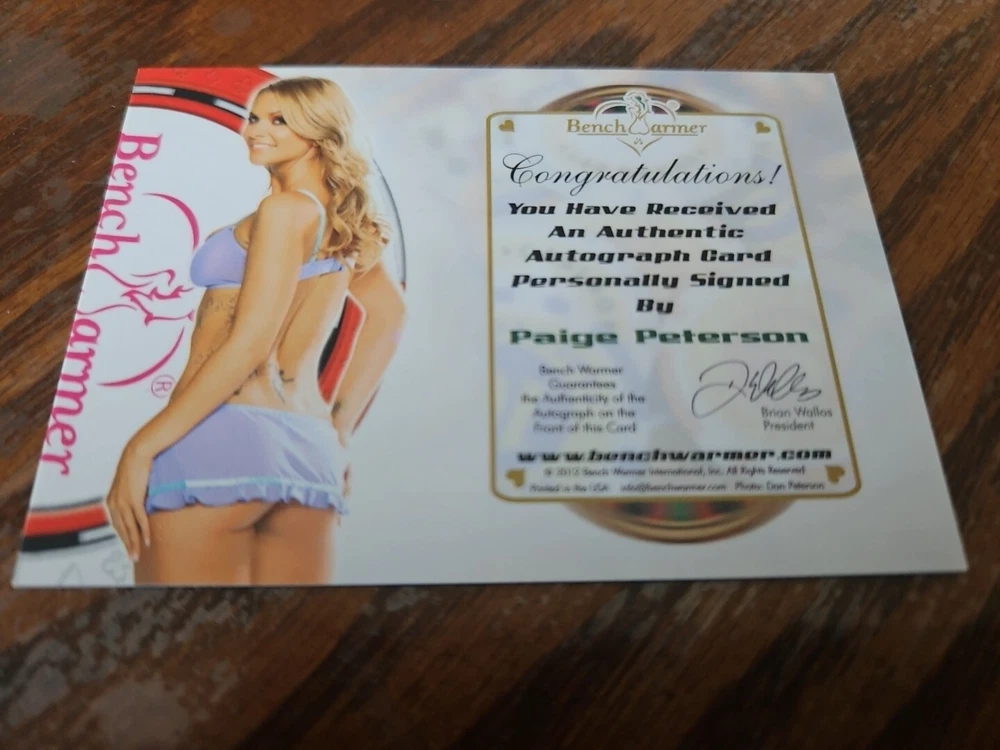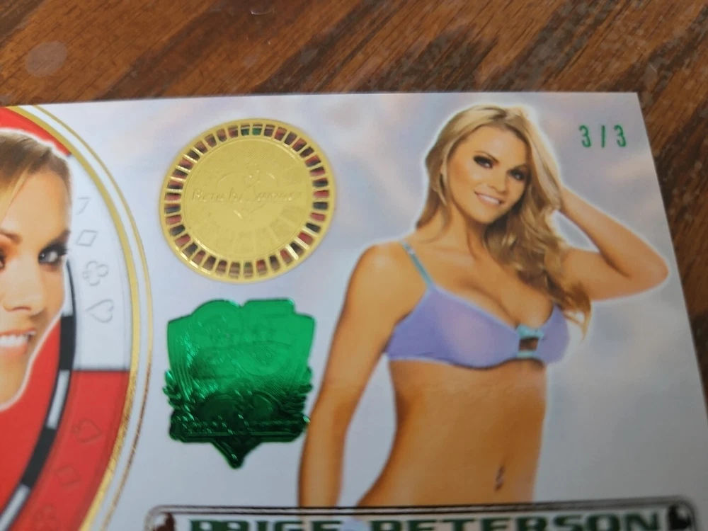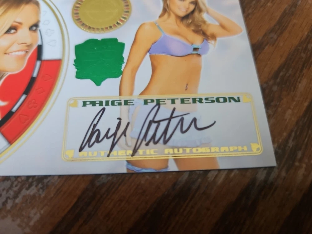 Benchwarmer 2012 Paige Peterson Vegas Baby Autograph Green Foil 25th Anniversary Card #3/3 Playboy Playmate Super Rare card with limited run of only 3. Currently the only one on eBay. Paige Ellen Peterson was born May 2nd, 1980, in Lawrence, Kansas. At an early age she developed a love for the spotlight. First performing in dance competitions and later in community theater productions. By her mid teen years Paige convinced her mother to allow her to leave Kansas and head for the hills of Hollywood. After intense acting lessons she soon landed an agent and then began life as a professional actress. Paige currently resides in the San Fernando Valley but makes plenty of trips home to the midwest each year. Please, look at all the pictures. Please check out my other eBay accounts... https://www.ebay.com/usr/kimmyrael https://www.ebay.com/usr/matlac99 https://www.ebay.com/usr/lacr6837 https://www.ebay.com/usr/malac9440 https://www.ebay.com/usr/lacr_3567 https://www.ebay.com/usr/lacroki8 https://www.ebay.com/usr/lacroki9 Shipping only to the continental US unless you contact me first. Will combine shipping!!!