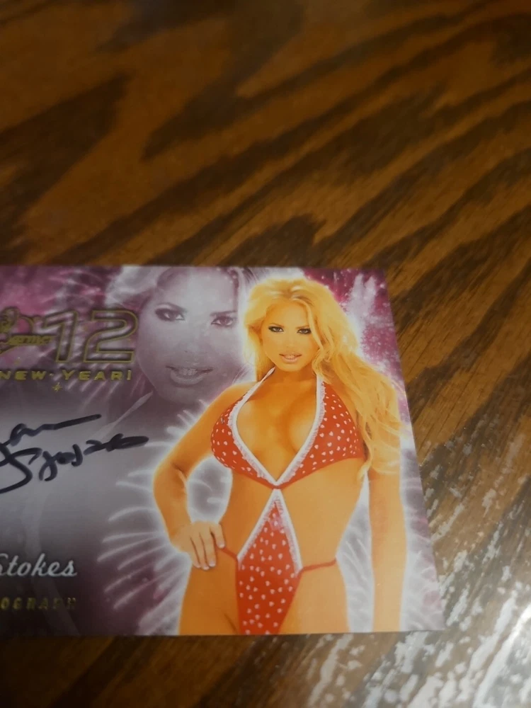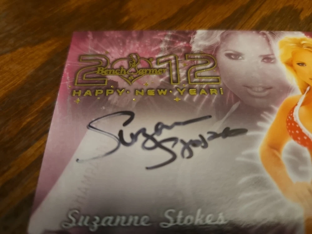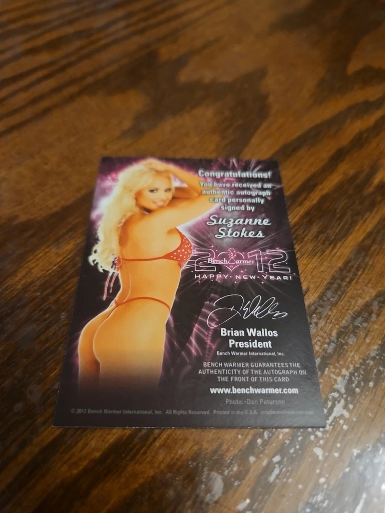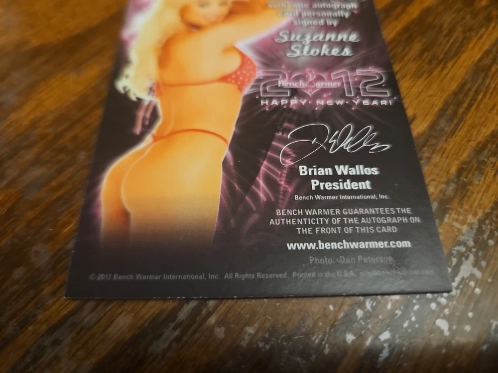 Benchwarmer 2012 Suzanne Stokes Happy New Year Autograph Gold Foil Auto Playboy Luscious and voluptuous blonde bombshell Suzanne Stokes was born on July 9, 1979 in Naples, Florida. Her parents owned an alligator farm and wildlife refuge in the Everglades. At age sixteen Stokes moved out of her parents' home to live with her friend. Following graduation from high school in 1997, Suzanne moved to Miami, Florida to start her modeling career. She appeared on the cover of "Boating" magazine and various swimsuit catalogs. Moreover, Stokes also did TV commercials for foreign companies including Heineken and Ruffles. In 1999 Suzanne went to Paris, France and appeared in the instructional video "Bricol' Girls." In addition, Suzanne was the winner of three beauty pageants; she won the titles Miss Hawaiian Tropic Miami, Miss Hawaiian Tropic United States in 1999 and Miss Photogenic at the international final of Miss Hawaiian Tropic in 2000. Suzanne was named Miss February 2000 Playboy Playmate. Please, look at all the pictures. Please check out my other eBay accounts... https://www.ebay.com/usr/kimmyrael https://www.ebay.com/usr/matlac99 https://www.ebay.com/usr/lacr6837 https://www.ebay.com/usr/malac9440 https://www.ebay.com/usr/lacr_3567 https://www.ebay.com/usr/lacroki8 https://www.ebay.com/usr/lacroki9 Shipping only to the continental US unless you contact me first. Will combine shipping!!!