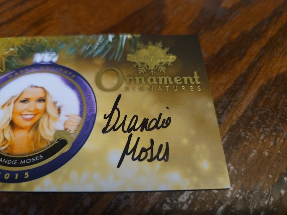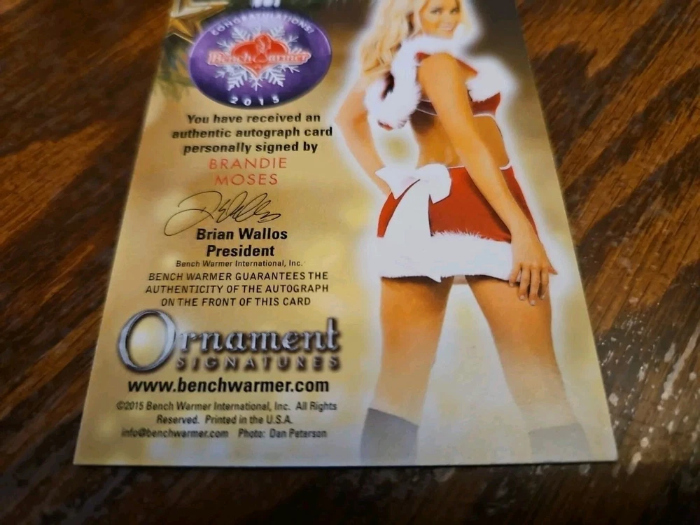 Benchwarmer 2015 Brandie Moses Happy Holidays Ornament Signatures Autograph Card Playboy Playmate Buxom and shapely 5'5' blonde bombshell Brandie Moses was born on July 19, 1979 in Corpus Christi, Texas. Moses first began modeling in 2004 and created her own line of beauty and bath products prior to becoming the Playboy Cybergirl of the Week for September 18, 2006. Moreover, Brandie not only has been featured in a handful of Playboy special editions, but also hosted several episodes of Playboy's Beach House (2010) . Outside of Playboy, Moses has also modeled for such notable clients as Mac & Bumble, Miller Lite Beer, Surfer Magazine, Sex Symbol Jeans, BenchWarmer Cards, Texas Girls Calendar, and Easy Rider Magazine. Please, look at all the pictures. Please check out my other eBay accounts... https://www.ebay.com/usr/kimmyrael https://www.ebay.com/usr/matlac99 https://www.ebay.com/usr/lacr6837 https://www.ebay.com/usr/malac9440 https://www.ebay.com/usr/lacr_3567 https://www.ebay.com/usr/lacroki8 https://www.ebay.com/usr/lacroki9 Shipping only to the continental US unless you contact me first. Will combine shipping!!!