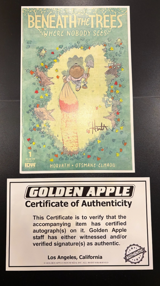 Beneath the Trees Where Nobody Sees #1A – Signed by Patrick Horvath – NM – With COA Condition This comic is ungraded and unread . I am not a professional grader , so please review all photos carefully and judge the condition for yourself. Photos are of the exact item you will receive . If you need additional photos or have specific questions, feel free to ask before purchasing. Includes Certificate of Authenticity (COA) for the signature. Shipping The comic will be bagged and boarded , securely packed, and shipped in a protective box to ensure safe delivery. Ships fast and securely. Additional Info From a smoke-free home. Packed with care for collectors. Open to reasonable offers — feel free to submit one. Questions or Requests for Extra Photos? Just send me a message — I’m always happy to help.