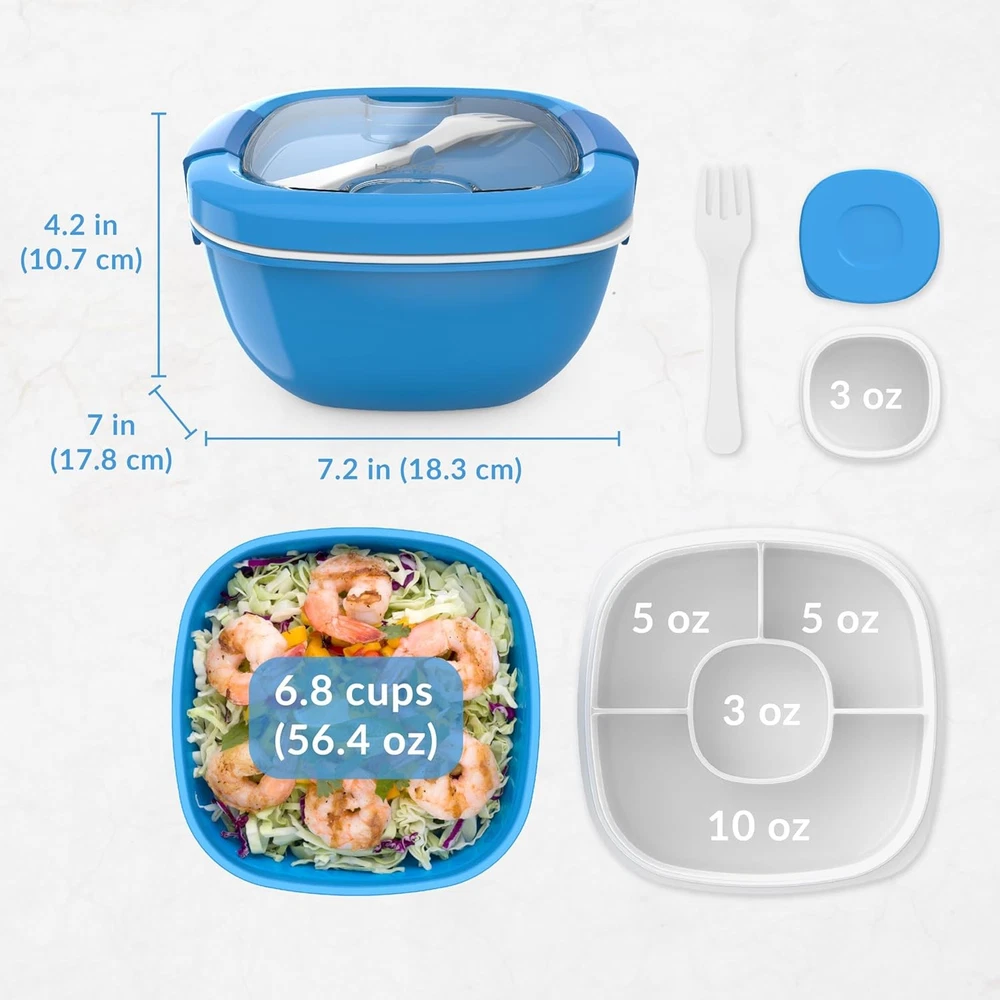 Bentgo Salad Container - 54 oz Bowl with 4-Compartment Toppings Tray, Blue Product Details Color: Blue Material: Food-Grade Safe ABS, PE, PP, Tritan, and Silicone (No BPA, Vinyl, Lead, or PVC) Brand: Bentgo Recommended Uses For Product: School, Work, Sports, Outdoors, On the Go Age Range (Description): Adult Special Feature: Microwave Safe, Airtight, Leak Resistant, Freezer Safe Capacity: 3.4 Pounds Theme: Fruit Pattern: Solid Product Care Instructions: Dishwasher Safe Included Components: Large salad bowl, 4-compartment bento tray for toppings, leak-proof sauce container, reusable fork, cutlery cover, airtight lid Number of Compartments: 5 Closure Type: Snap Style: Transitional Shape: Square Product Dimensions: 7.2"L x 4.15"W x 7"H Unit Count: 1.0 Count Material Type Free: BPA Free Number of Items: 1 Item Form: Box Number of Pieces: 7 Manufacturer: Bentgo Part Number: BGOSAL-B Item Weight: 15.5 ounces Item model number: BGOSAL-B Is Discontinued By Manufacturer: No Item Package Quantity: 1 Special Features: Microwave Safe, Airtight, Leak Resistant, Freezer Safe Batteries Included?: No Batteries Required?: No Color: Blue Material: Food-Grade Safe ABS, PE, PP, Tritan, and Silicone (No BPA, Vinyl, Lead, or PVC) Brand: Bentgo Recommended Uses For Product: School, Work, Sports, Outdoors, On the Go Age Range (Description): Adult Special Feature: Microwave Safe, Airtight, Leak Resistant, Freezer Safe Capacity: 3.4 Pounds Theme: Fruit Pattern: Solid Product Care Instructions: Dishwasher Safe Adult Salad Container for Lunch: Take healthy salads and other nutritious meals on the go with this stackable, all-in-one set, which features a large 6.8 cup bowl, a 4-compartment bento tray for fixings, a leak-proof sauce container, and even a reusable fork! Keeps Salads Fresh: The airtight lid and secure lockings clips seal in freshness, while the compartment tray and sauce container keep lettuce and toppings separated, so everything stays crisp all day long and never gets soggy. Dishwasher & Microwave Safe: Enjoy easy clean-up and heat-up every time you use Bentgo Salad. All parts are easy to clean in the top shelf of your dishwasher, while the bowl can go into the microwave, so you can warm chicken, whole-grain pasta, and other meals. Plus, everything is made of BPA-free materials that are safe, durable, and reusable.
