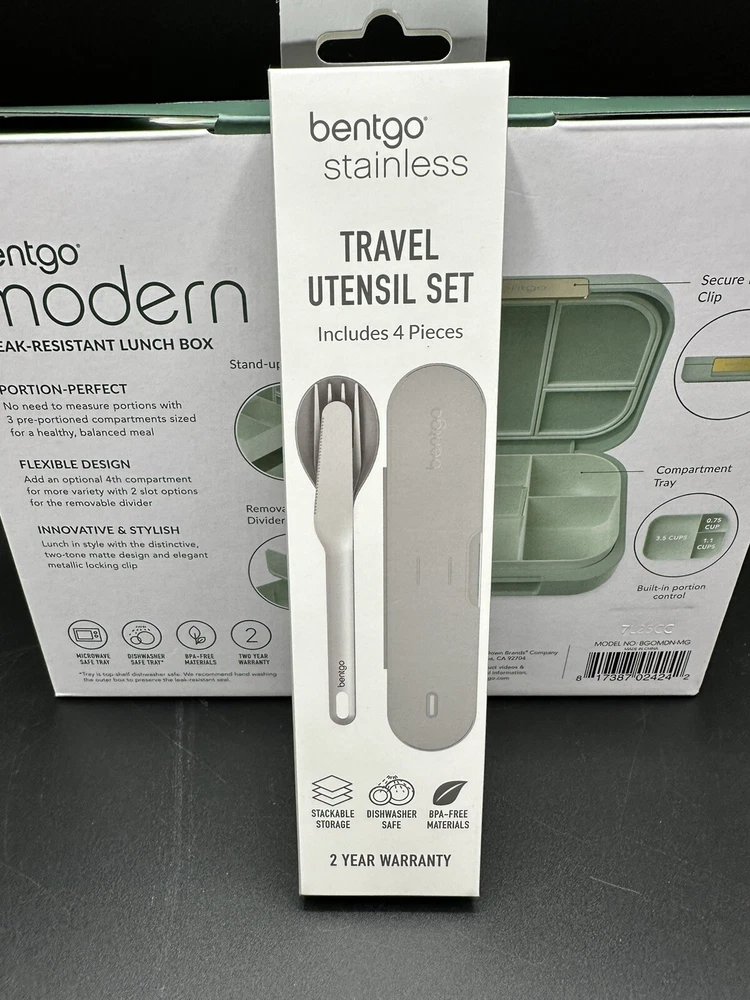 Both items are brand new and never opened This includes the lunchbox and the travel utensil set The utensil set is stainless steel