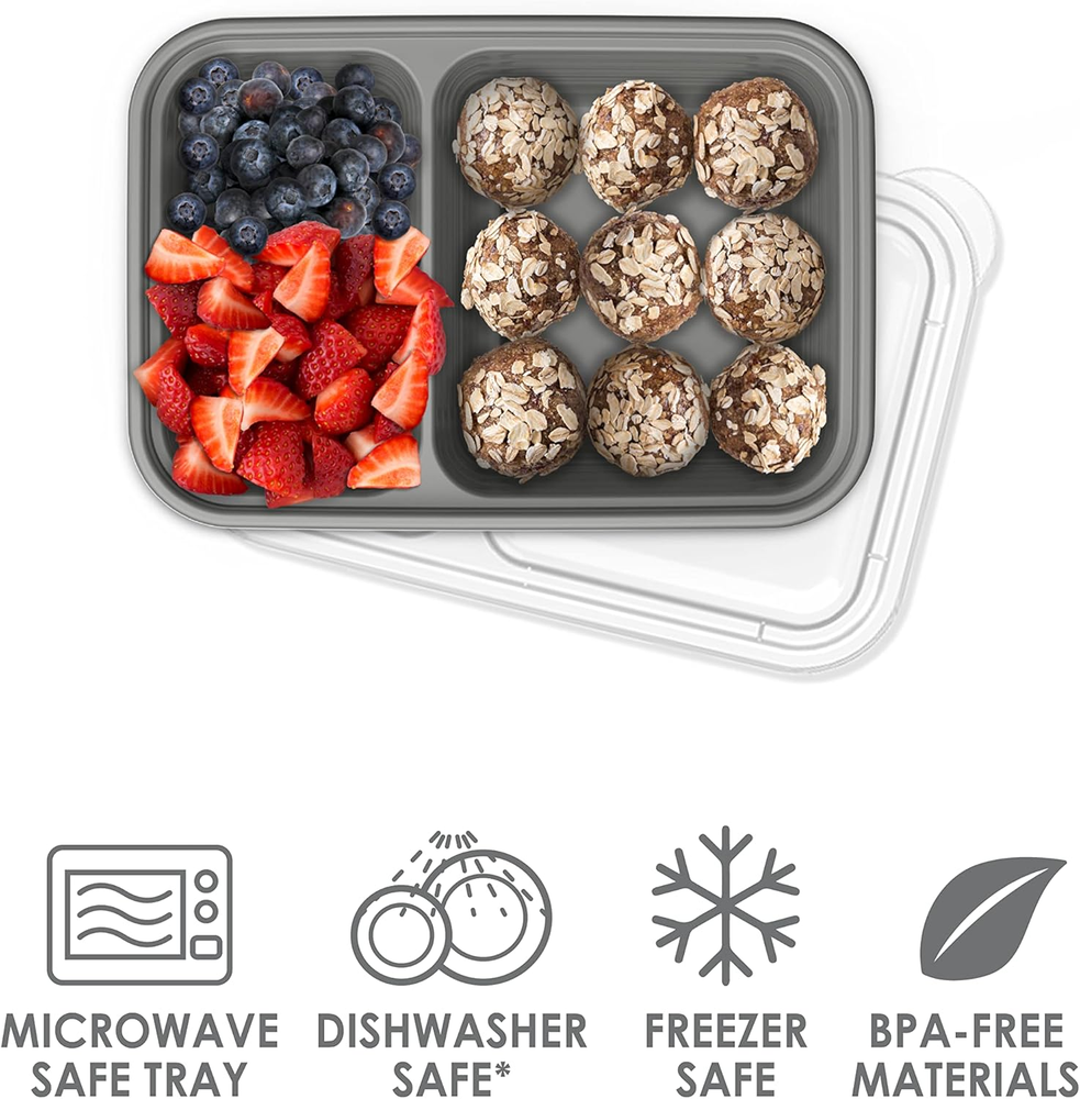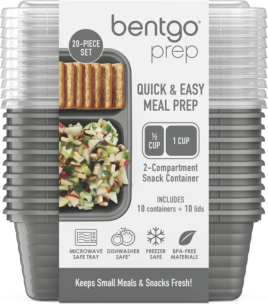 Everyone’s Favorite Meal Prep Pack*: Bentgo is America’s go-to brand for maintaining healthy habits! Pack nutritious snacks with this practical 20-piece set that comes with ten 2-compartment snack containers and ten custom-fit lids that help seal in freshness, so you can enjoy snacks on the go. Portion-Controlled Design: No need to measure your portions—volume is already embossed on the tray to help you with your healthy eating goals, diet, or weight loss plans. The custom-fit lids keep food fresh all day long and stack together neatly to save you space in your pantry. Plus, all the lids are clear, so you can easily identify what food is inside at a glance. Easy to Heat & Clean: Safely heat up your snacks straight from the freezer or refrigerator for warm, delicious meals and leftovers. Each meal prep container is both microwave and top-shelf dishwasher safe. Note: do not microwave lids, only the trays are microwavable. For best results, hand wash to extend the life of the product. Durable & Reusable: Made of tough, but safe, BPA-free materials, Bentgo Prep containers are designed to last meal after meal, so you can ditch single-use plastics with these eco-friendly containers. They are lightweight, portable, and easy to carry to the gym, office, dorm, soccer field, and more. What You Get: 10 trays, 10 custom-fit lids, and caring customer support. Product Description Bentgo Prep Snack Containers Product Specifications: Total Volume: 1.5 cups|12 oz|355 ml; Large Compartment: 1 cup|8 oz| 237 ml; Small Compartment: .5 cup |4 oz | 118 ml; | Size: 10.6 x 15.4 x 5.8 cm; 4.2” x 6.1” x 2.3” Reusable & Durable Reusable up to 10x, our snack prep containers are BPA-Free and easy to clean, freeze, microwave, and serve to save you time in the kitchen. Set of 10 Each set includes 10 lids and 10 containers. That’s enough to pack a work week of snacks for two people or multiple snacks for one. Take It To Go Fits into most bags for on-the-go healthy snacks. Lightweight and portable enough to take them with you to work, school, the gym, or traveling. Perfect Portions Each snack container has the volume embossed on the tray so there’s no need to measure portions. It’s perfect for mixing and matching savory and sweet snacks. Batch Cooking Saves Time Prep healthy snacks for the week all at once and store them in the fridge or freezer to save time and the hassle of daily prep. Fit for the Entire Family Pack delicious and nutritious snacks for everyone with a perfectly sized snack container fit for any appetite and all the snack combinations you can create. Makes Eating Healthy Easy Plan and prepare healthy meals in advance to stay on track with your health and fitness goals.