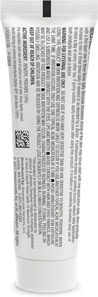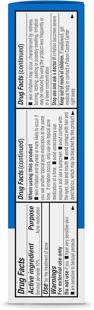 Benzoyl Peroxide Acne Medication 10%, Maximum Strength, 1 Fl Oz Face Gel One 1-fluid ounce tube of benzoyl peroxide acne medication for the treatment of acne Dermatologist tested for Treatment of Acne Compare to Clean and Clear Persa-Gel 10 maximum strength Active ingredient: 10% Benzoyl Peroxide acne medication An Amazon Brand 1.51 inches x 0.99 inches x 4.24 inches. Weight: 1.45 oz Scent Unscented Product Dimensions 0.99 x 1.51 x 4.24 inches; 1.45 ounces Country of Origin USA Product Benefits Anti-Acne Skin Type Sensitive Item Form Gel