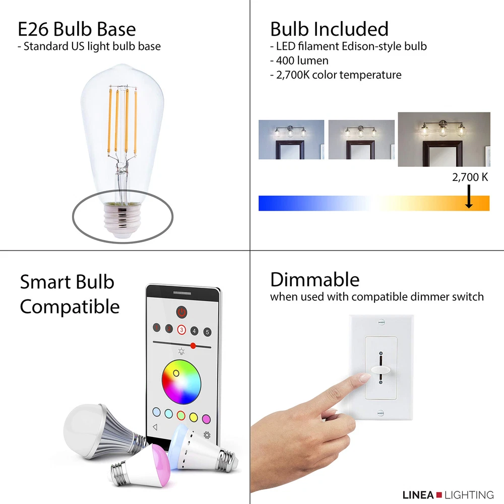 The Berbella single light wall sconce offers an industrial farmhouse design and a clean, contemporary look. The sleek metal finish, combined with dual exposed bulbs results in a stylish wall-mounted light fixture that coordinates beautifully with a wide range of home decor styles, from sleekly modern to farmhouse and beyond. Perfect for bathrooms, corridors, dining rooms, living areas, bedrooms and other spaces. Metal construction, brushed nickel finish Measures 4.5 inches wide by 14.5 inches high; extends 4 inches from the wall Dimmable when used with ELV dimmer Includes 4W 400 lumen, LED filament Edison style bulbs, 2,700K color temperature Works with most bulbs - with smart bulbs or most medium base bulbs up to 60W 1-year manufacturer with US based UL listed LED EDISON BULB INCLUDED - Brushed nickel light wall sconce comes with LED light bulb. Led wall sconce is dimmable and with most standard medium base bulbs EASY INSTALLATION - Farmhouse wall sconce vanity light with 4.5" mounting plate for simple hardwired installation. Can be installed uplight or downlight as bathroom sconces beside mirror MODERN WALL SCONCE LIGHT - Brushed Nickel sconce wall lighting is perfect for modern contemporary and traditional design as wall lights for hallway, living room, foyer, and bedroom wall sconce lighting bathroom vanity UL Listed - Rest assured this brushed nickel bathroom wall sconce light fixture is UL Listed ensuring its safety, performance, and energy efficiency. Indoor wall sconce wall light is dimmable. DESIGNED IN CHICAGO - our American customer support team is here to help