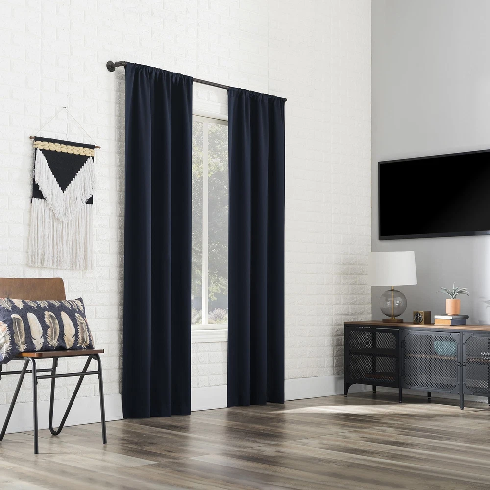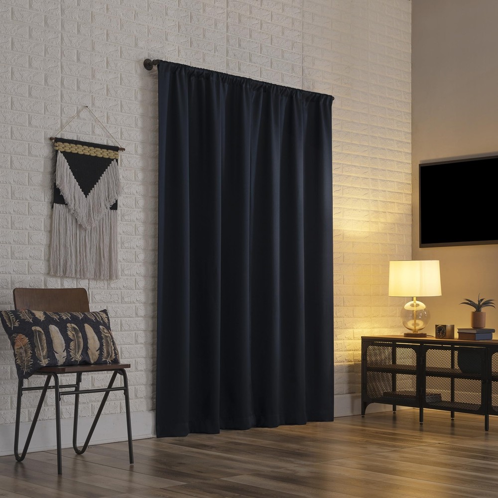 Bergen Theater Extreme 100% Blackout Rod Pocket Curtain Panels provide the ultimate in light blocking technology to keep out even the harshest of light while bringing an elegant urban sophistication to any room of your home. Extreme Blackout technology is laboratory tested to block out 100% of light, reduce outside noise by up to 45%, and decrease energy lost through your windows by up to 50%. Comfort is optimized with thermal properties that help keep summer heat and winter chill out of your home. Built-in rod pocket design allows for easy slide-through installation on curtain rods up to 1.5" in diameter. Hang in your entertainment room to eliminate screen glare and reduce distracting outside noise, or in your bedroom for enhanced privacy and a sounder, more uninterrupted sleep. Sold as individual panels measuring 40" width by 96" length in color navy. Measure carefully before selecting your desired size and quantity. Rod not included. Machine wash cold on gentle cycle. Use non-chlorine bleach when needed. Tumble dry on low heat. Extreme Blackout technology blocks out 100% of outside light Energy Efficient design reduces energy lost through your windows by up to 50% Thermal properties help keep summer heat and winter chill out of your home Noise reduction by up to 45% helps you get a sounder, more uninterrupted sleep Built-in rod pocket fits curtain rods up to 1.5" in diameter Panels sold individually. Measure carefully prior to purchase (Image features 2 panels)
