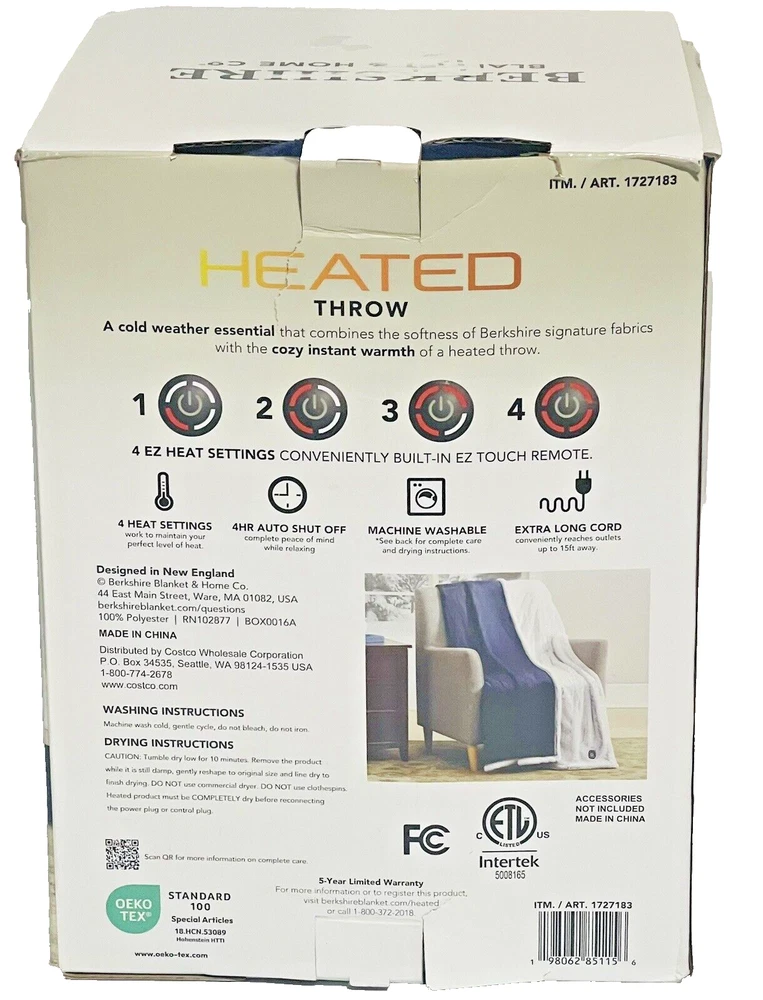 Berkshire Life Heated Throw Blanket, Reversible, 4 Heat Settings, 50" x 60". Condition is pre-owned- Note: Item is a customer return from Costco, Heating has not been tested - FREE SHIPPING Snuggle up on chilly nights with the Berkshire Life Heated Throw Blanket. This cozy blanket comes in a beautiful shade of blue and is perfect for your bedroom. The blanket is reversible and features four heat settings to customize your comfort level. Crafted by Berkshire, a trusted brand in home furnishings, this blanket is made to last. Its size of 50 x 60 inches is perfect for sharing the warmth with a loved one. The blanket is perfect for anyone who wants to add a touch of warmth to their home decor.