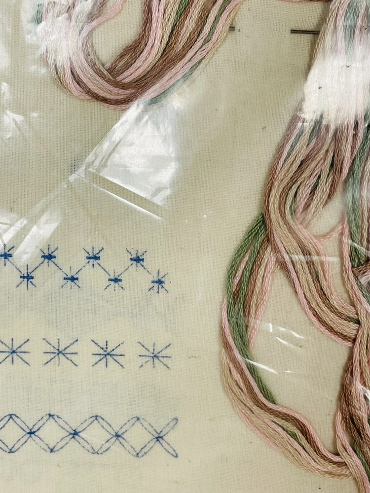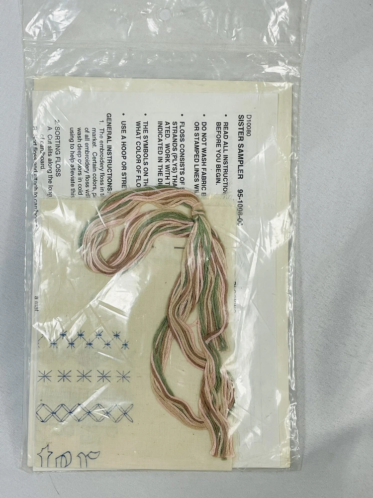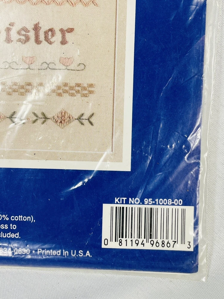 Bernat Stitchery Stamped Sister Sampler Approx 5" x 7" fits 8" x 10" Mat Vintage. NOS- New in package. Package show signs of wear from storage and price tag. Please see pictures for all details.