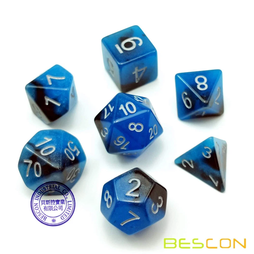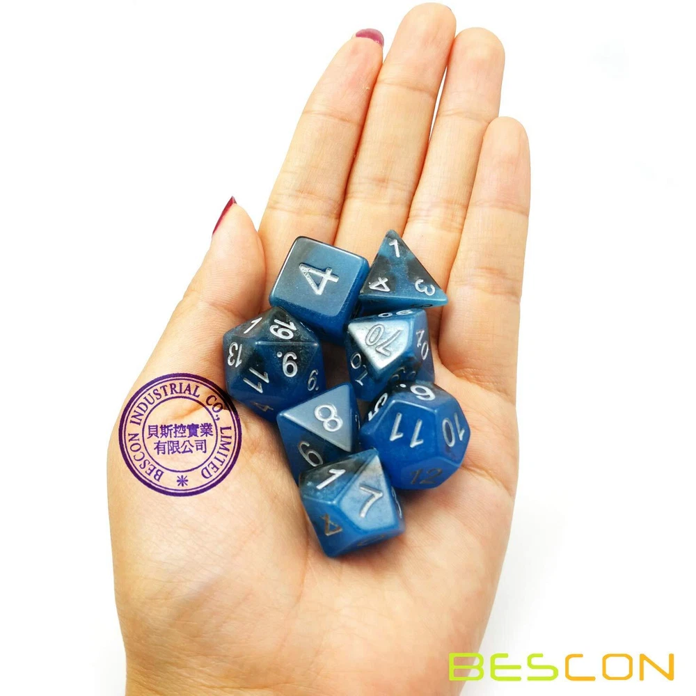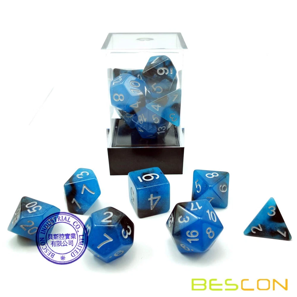 Bescon -Tone Glow-in-the-Dark Polyhedral Dice Set BLUE DAWN, Luminous RPG Dice Set d4 d6 d8 d10 d12 d20 d% Brick Box Pack Bescon's -Tone Glow-in-the-Dark Series from great idea of Hague. This is dice set of BLUE DAWN! Dice color: Pearl black+Blue; The blue part glows in dark (after absorbing light). Each set includes a 4,6,8,10, 12, and 20 sided dice, along with a percentile die. Classtic Brick Box Packaging Quality control: No cracks, chips or damage. Every dice included is inspected before being packaged, ensuring that you'll only get the best dice here! Use as a DND dice set, Pathfinder, the Gathering or any other game where you need lots of dice. Bescon's -Tone Glow-in-the-Dark Series from great idea of Hague. This is dice set of BLUE DAWN! Dice color: Pearl black+Blue; The blue part glows in dark (after absorbing light);Each set includes a 4,6,8,10, 12, and 20 sided dice, along with a percentile die. Classtic Brick Box Packaging Quality control: No cracks, chips or damage. Every dice included is inspected before being packaged, ensuring that you'll only get the best dice here! Use as a DND dice set, Pathfinder, the Gathering or any other game where you need lots of dice.