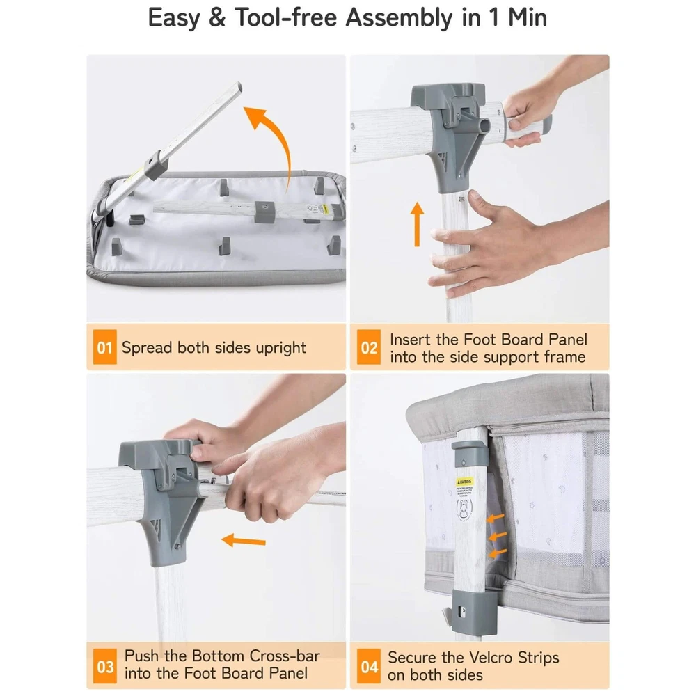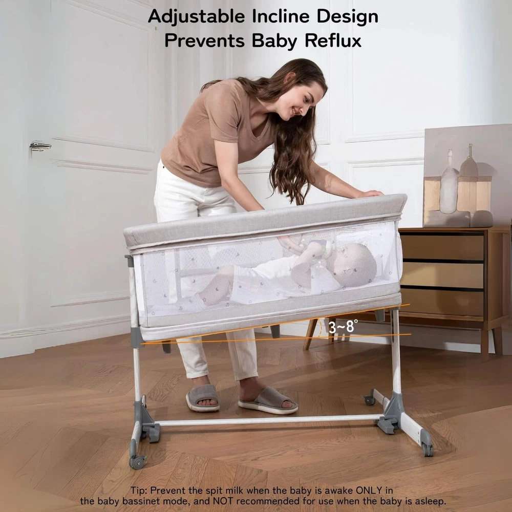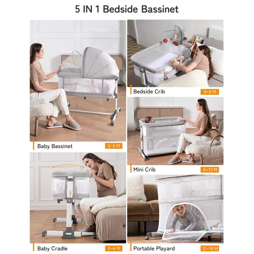 Besrey 5-in-1 Baby Bassinet Bedside Sleeper with Playpen, Mobile Toy Hanger, Hanging Diaper Bag, and Mattress DESCRIPTIONS The Besrey 5-in-1 Baby Bassinet Bedside Sleeper is the ultimate solution that grows with your baby. The crib seamlessly trasitions from a cozy bassinet to a fun playard. From peaceful sleeping environments to engaging playtime, this crib has it all, accompanying your baby from birth to over 1 year old. FEATURES 5 IN 1 Baby Bassinet: Standalone Bassinet (0-6M), Bedside Crib (0-6M), Baby Cradle (0-6M), Portable Crib (6-12M), and even Portable Playard (12-18M) in one Easy Transition: Very easy and quick to transition from the bassinets to the playard/mini crib, suitable up to 18 months 360° Breathable Mesh: Breathable mesh on the top and sides promotes breathability and visibility, allowing your baby to breathe better 5 Adjustable Heights: Adjustable to heights between 29.13" and 33.46" measured from floor to top of bassinet, it’s suitable for varying bed heights 360° Swivel Wheels with Brakes: This bedside sleeper for baby is seated on 4 universal casters each with its own sturdy brake Foldable Mobile Toy Hanger: designed with a mobile toy hanger, providing a source of entertainment for infants and supporting their developmental growth Hanging Diaper Bag: Come with a spacious hanging diaper bag with 4 pockets, 1 large compartment, and 1 shelf, perfect for your baby's essentials Spine Protective Mattress: A spacious shape memory mattress made of skin-friendly 3D vertical cotton is specifically designed for infants (0-6 months) Removable Zippered Mosquito Net: Provides extra protection from mosquito bites both outdoors and indoors Tool-free Assembly: Quick and easy assembly with no tools needed in 1 Min, solving your baby's sleep problems in unfamiliar surroundings or outside home Safety Ensured: The besrey bassinets bedside sleeper is fully compliant with ASTM, CPSIA, and CCPSA standards, keeping your baby safe SPECIFICATIONS Product Dimensions: 37.4"L x 27.6"W x 33.5"H Product Weight: 28 lbs Color: Elegant Grey Materials: Metal, Fabric Includes: Bassinet, Mattress, Mosquito Net, Detachable Sheet, Travel Bag, Storage Basket Manufacture SKU# BRBD003102AMXX Assembly Required: Yes Warranty: 2-year limited manufacture warranty Weight Capacity: 50 lbs Product Care: Hand Wash Only. ABOUT BESREY Besrey, established in 1998, are dedicated to providing parents with thoughtfully designed products built to the highest standards. Our mission is to ensure your baby's safe and healthy growth while easing the stress of being a new parent. We rigorously test our products and use only the best materials to meet the strictest safety criteria. Founded by product engineer and mom, Mirabelle, Besrey was created to address the flaws in existing baby products. Today, Besrey offers a wide range of safe, reliable, and comfortable baby products in over 130 countries, helping parents worldwide solve their parenting challenges with love and care. Besrey 5-in-1 Baby Bassinet Bedside Sleeper with Playpen, Mobile Toy Hanger, Hanging Diaper Bag, and Mattress DESCRIPTIONS The Besrey 5-in-1 Baby Bassinet Bedside Sleeper is the ultimate solution that grows with your baby. The crib seamlessly trasitions from a cozy bassinet to a fun playard. From peaceful sleeping environments to engaging playtime, this crib has it all, accompanying your baby from birth to over 1 year old. FEATURES 5 IN 1 Baby Bassinet: Standalone Bassinet (0-6M), Bedside Crib (0-6M), Baby Cradle (0-6M), Portable Crib (6-12M), and even Portable Playard (12-18M) in one Easy Transition : Very easy and quick to transition from the bassinets to the playard/mini crib, suitable up to 18 months 360° Breathable Mesh : Breathable mesh on the top and sides promotes breathability and visibility, allowing your baby to breathe better 5 Adjustable Heights: Adjustable to heights between 29.13" and 33.46" measured from floor to top of bassinet, it’s suitable for varying bed heights 360° Swivel Wheels with Brakes: This bedside sleeper for baby is seated on 4 universal casters each with its own sturdy brake Foldable Mobile Toy Hanger: designed with a mobile toy hanger, providing a source of entertainment for infants and supporting their developmental growth Hanging Diaper Bag: Come with a spacious hanging diaper bag with 4 pockets, 1 large compartment, and 1 shelf, perfect for your baby's essentials Spine Protective Mattress: A spacious shape memory mattress made of skin-friendly 3D vertical cotton is specifically designed for infants (0-6 months) Removable Zippered Mosquito Net : Provides extra protection from mosquito bites both outdoors and indoors Tool-free Assembly: Quick and easy assembly with no tools needed in 1 Min, solving your baby's sleep problems in unfamiliar surroundings or outside home Safety Ensured: The besrey bassinets bedside sleeper is fully compliant with ASTM, CPSIA, and CCPSA standards, keeping your baby safe SPECIFICATIONS Product Dimensions: 37.4"L x 27.6"W x 33.5"H Product Weight: 28 lbs Color: Elegant Grey Materials: Metal, Fabric Includes: Bassinet, Mattress, Mosquito Net, Detachable Sheet, Travel Bag, Storage Basket Manufacture SKU# BRBD003102AMXX Assembly Required: Yes Warranty: 2-year limited manufacture warranty Weight Capacity: 50 lbs Product Care: Hand Wash Only. ABOUT BESREY Besrey, established in 1998, are dedicated to providing parents with thoughtfully designed products built to the highest standards. Our mission is to ensure your baby's safe and healthy growth while easing the stress of being a new parent. We rigorously test our products and use only the best materials to meet the strictest safety criteria. Founded by product engineer and mom, Mirabelle, Besrey was created to address the flaws in existing baby products. Today, Besrey offers a wide range of safe, reliable, and comfortable baby products in over 130 countries, helping parents worldwide solve their parenting challenges with love and care. × × 