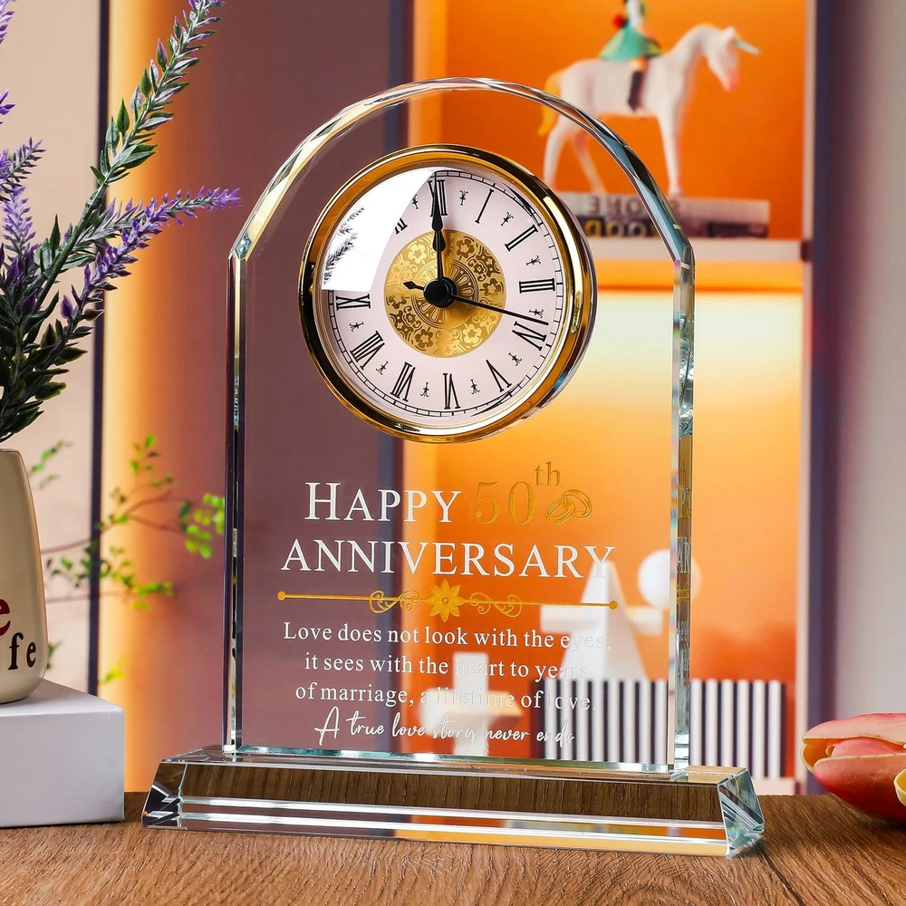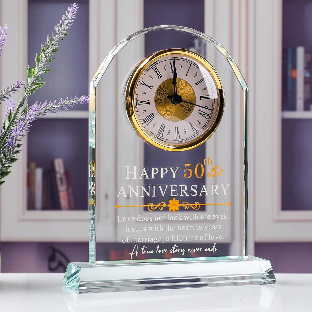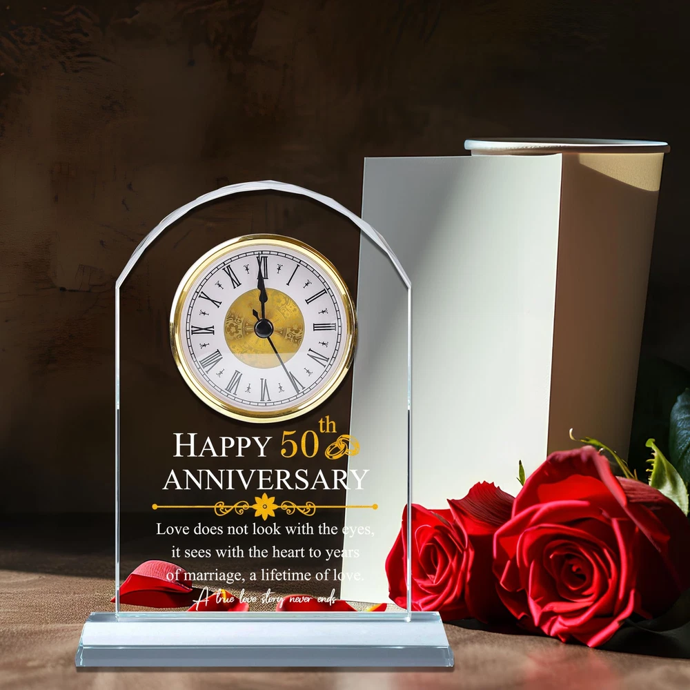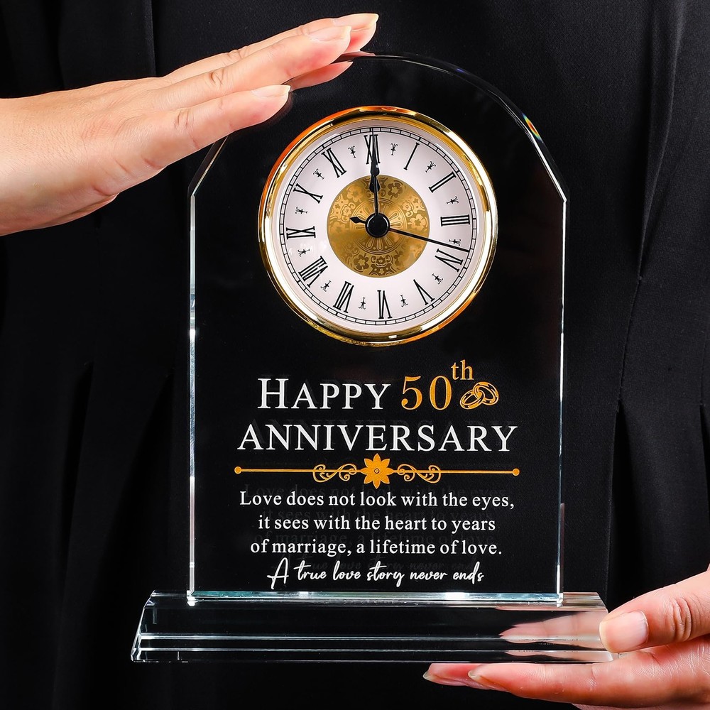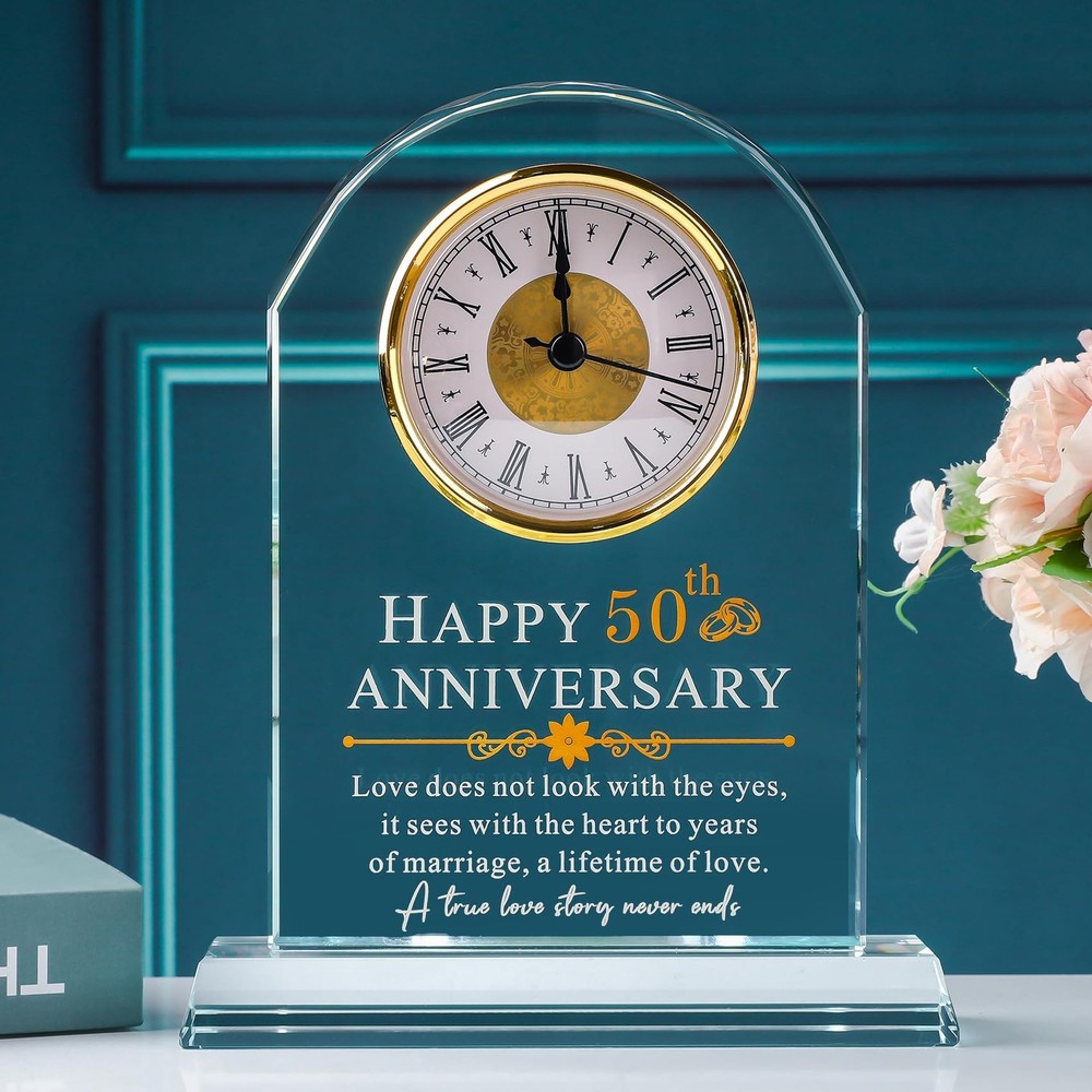 50th Wedding Anniversary Gifts for Couples: If you are looking for a gift for who is celebrating 50 year wedding anniversary, this glass clock will be you a great choice,all of words are engraved on this glass clock,it will never fade which make it a excellent gift to celebrate 50th anniversary Anniversary Gifts for 50 Years of Marriage: This clock engraved "Happy 50th Anniversary,love does not look with the eyes, it sees with the heart to years of marriage,a lifetime of love. A true love story never ends.",it's unique and beautiful as a anniversary gift,you could give it to your husband,wife,friends High Quality 50th Anniversary Quartz Clock: This glass quartz clock is made of high quality glass instead of acrylic,it's very clear and a little heavy, the inscription is perfectly clear and extremely sturdy,you could put it on the desk,table,livingroom,bedroom or anywhere you want to see it Ready As a Gift: Every clock will come with a gift box,a blank gift card and a cleaning cloth,it's ready as a amazing anniversary gifts for who you love Unique 50th Anniversary Gifts: Look no further than our glass clock, whether you are looking for anniversary, valentines day gifts for husband and wife or an couple gift with a sentimental message. Ideal gift for boyfriend, husband, romantic I love you gifts for her, or even a date night gift for couples.