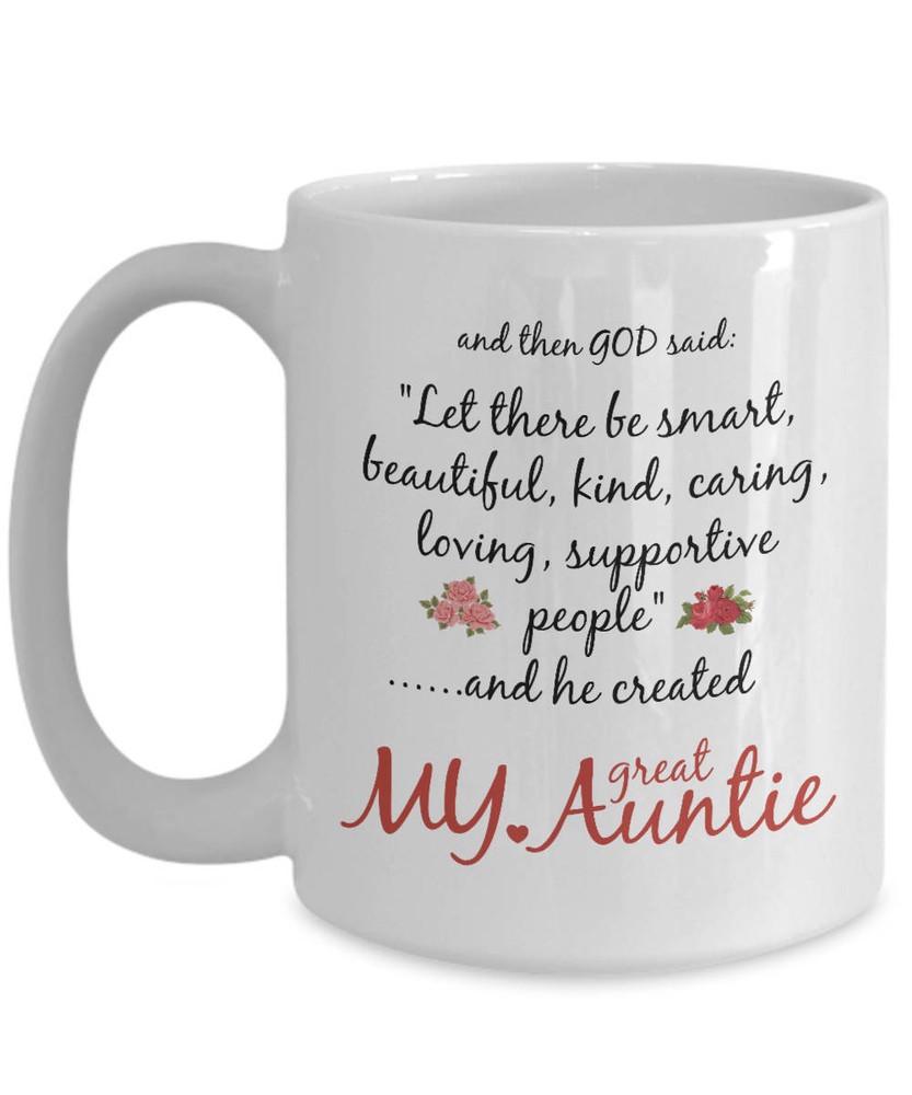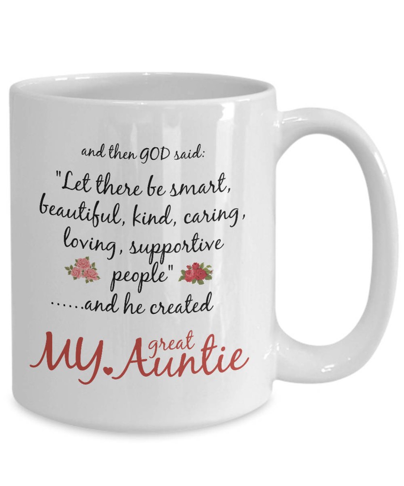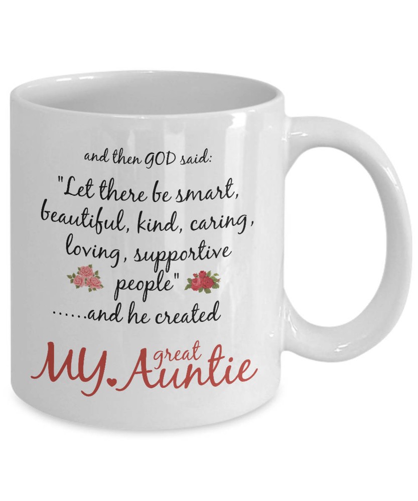 Great Auntie Mug Auntie Gift God Created My World's Best Funny Novelty Coffee Product Details.. This high quality 11oz. ceramic white mug has a premium hard coat that provides crisp and vibrant color reproduction sure to last for years. Perfect for all hot & cold beverages. The highest quality printing possible is used. It will never fade no matter how many times you wash it. Material: 100% Ceramic. Print both sides. Dishwasher and Microwave Safe. High Gloss + Premium White Finish. Printed in the U.S.A. Personalized & Custom. We support personalized and custom mug to add custom, when placing an order, you can add notes to the "order note" in shipping address section. Also you can contact us directly via message. Shipping Info. Ready to ship in 1 to 2 business days, All products are made-to-order and proudly printed in the United States. Shipped by USPS and DHL, You will receive your order in 5-7 days. Replace & Refund. All products are defective during shipping broken, chipped will be replaced free of charge. You are not satisfied with the product, we will refund 100% money to you. If any other issues arise, please do not hesitate to message, we would be more than happy to assist you.