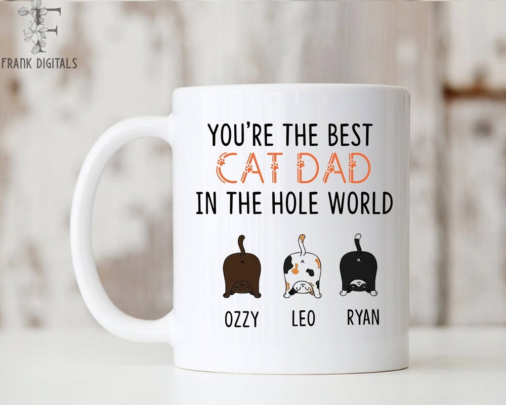 Personalized Cat Dad Mug Best Cat Dad In The Hole World Personalized Mug Funny Cat Dad Mug Funny Fathers Day Gift Funny Gift For Dad Mug Product Details.. This high quality 11oz. ceramic white mug has a premium hard coat that provides crisp and vibrant color reproduction sure to last for years. Perfect for all hot & cold beverages. The highest quality printing possible is used. It will never fade no matter how many times you wash it. Material: 100% Ceramic. Print both sides. Dishwasher and Microwave Safe. High Gloss + Premium White Finish. Printed in the U.S.A. Personalized & Custom. We support personalized and custom mug to add custom, when placing an order, you can add notes to the "order note" in shipping address section. Also you can contact us directly via message. Shipping Info. Ready to ship in 1 to 2 business days, All products are made-to-order and proudly printed in the United States. Shipped by USPS and DHL, You will receive your order in 5-7 days. Replace & Refund. All products are defective during shipping broken, chipped will be replaced free of charge. You are not satisfied with the product, we will refund 100% money to you. If any other issues arise, please do not hesitate to message, we would be more than happy to assist you.