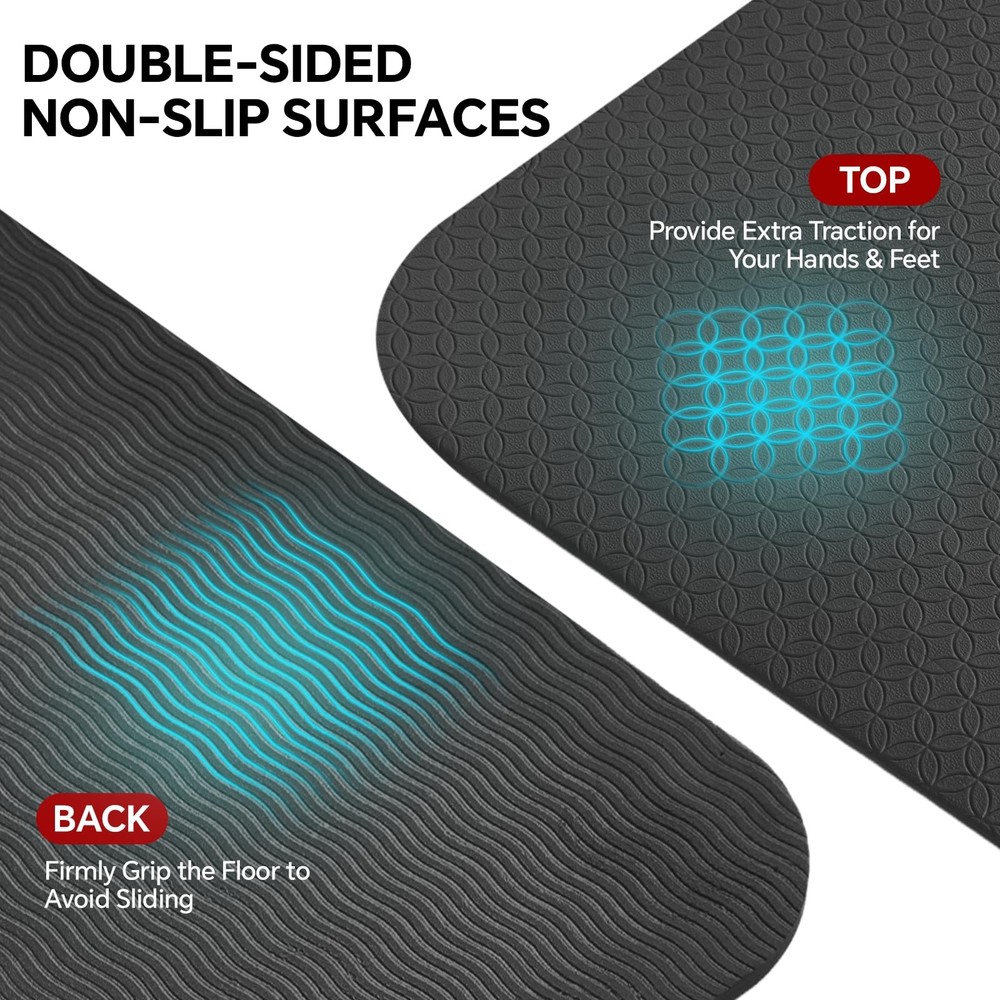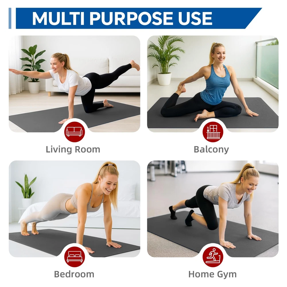 Our thick workout mat is designed to enhance your yoga experience. with features of gym mats for home gym, exercise mat thick is for practitioners of all levels. 3-layer Design: Our exercise mats for home workout features a 3-layer system that ensures optimal performance. The wear-resistant top of floor mats for gym guarantees longevity. The shock absorption mid-layer of gym floor mats minimizes joint impact. The anti-slip bottom of thick exercise mats for home workout ensures stability. Meet Various Needs: Our gym flooring for home gym is designed to cater to various fitness needs. Gym floor mat is suitable for barefoot training and can adapt to different yoga styles. Double-sided Anti-slip Texture: The non-slip texture of workout floor mats for home gym firmly grips the floor, offering traction and preventing slips. 2 Sizes Available: Our gym matt for home gym comes in two size options, ensuring ample room for various fitness activities. We have the size to accommodate your needs on exercise mats for home gym. 【Spacious & Designed for Movement】 large yoga mats come in large dimensions: 6'×3', 6'×4', providing up to 120% more space than standard yoga mats. Suitable for various barefoot exercises such as yoga, Pilates, stretching, meditation, planks, push-ups, squats, and cardio workouts
