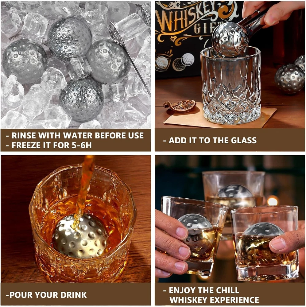 40 mm Large Extra Cool:The full 40 mm XL Large stainless steel golf ice ball has a larger cooling surface area than ordinary whiskey stones. The chilling stones chill the whiskey bourbon cooler and longer while without watering down the drink. Roll in a whiskey glass to bring out the aroma and flavor while quickly cooling them Whiskey Gifts for Golf Lovers:Stainless chilling stones bring undiluted pure whiskey, a perfect gift set for discerning whiskey lovers. The golf ball whiskey chillers are reusable and can be washed easily, perfect for sharing with your family and friends on party. This Whiskey Gift is also suitable for men dad husband grandpa brother uncle coworker boss for birthday, anniversary, wedding, bday, housewarming, Christmas stocking stuffers, and valentines day Golf Shape Designed:Innovate the Golf Shape Whiskey Balls for Golfer and Whiskey Lovers, made of 304 stainless steel, good thermal conductivity, can cool your whiskey faster. The ice cubes are safe for use and are non-toxic, contain no plastic, and are BPA-free. They have good thermal conductivity and cool drinks faster than ordinary ice Christmas Gifts for Men Golfer:The whiskey balls that won't melt work better than ice cubes with dilution. This whiskey gifts for men is ideal gifts for whiskey lovers. It is also a perfect gifts choice for your dad, husband, brother, uncle, boyfriend who love golf. So this balls chiller accessory can maintain the good taste of drink and provides the greatest enjoyment for you Perfect Experience:If you are looking for a unique Father's Day gifts or stocking stuffers, this golf accessories with exquisite gift box will stand out in a dazzling array of gifts. A fine whiskey is best enjoyed slowly, so that its aged perfection can be appreciated. The reusable golf balls is an investment that you will never regret. If you are not satisfied with our cool gadgets, please contact us and we will resolve it to make sure you are satisfied with your purchase