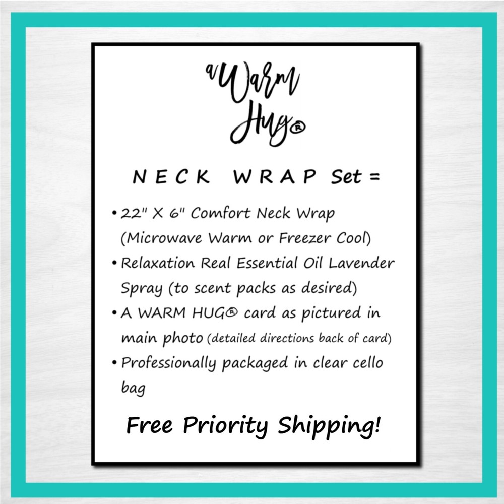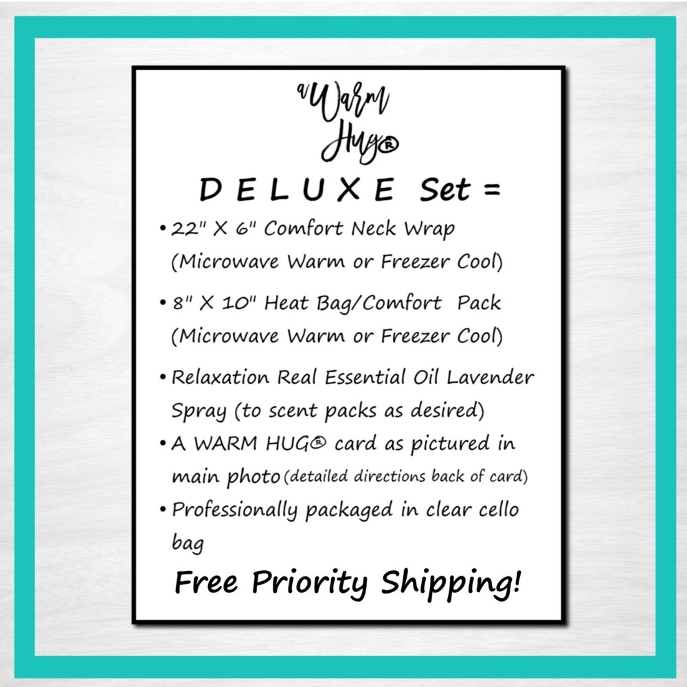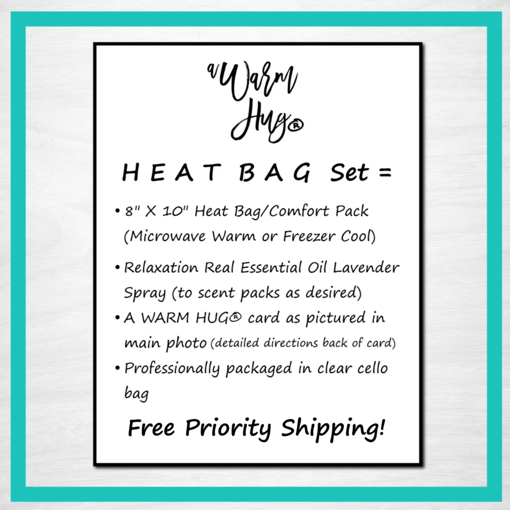 Send A Warm Hug ® to Dad for Fathers Day, Birthday or any day! Microwavable heating pads are the perfect, relaxing and useful gift! Set combinations of hot or cold packs, essential oil relaxation spray to scent packs, and A Warm Hug ® card as pictured. Choose Set Options in Drop Down Menu Heat Bag Set = Medium 8" x 10" Hot/Cold Pack, Essential Oil Spray, A Warm Hug® Card as pictured Neck Wrap Set = Double channeled Neck Wrap / 21" x 5.5", Essential Oil Spray, A Warm Hug® Card as pictured Deluxe Set = Medium Pack, Neck Wrap, Essential Oil Spray and A Warm Hug® Card as pictured Materials: Sturdy cotton fabric on one side with soft fleece on the other. Filled with rice and flaxseed. Real Essential Oil Relaxation Spray to scent packs as desired. Gift card included. Directions: Warm in the Microwave for relaxing moist heat or chill in the freezer for mild, soothing cool. Detailed directions on packaging. Sending as Gift: Please change address during checkout if sending as a gift. We're happy to include a note from you inside the A Warm Hug® card. Packaging: Professionally packaged in frosted, reusable gift bag with A Warm Hug card as pictured included. Detailed directions are on the back of gift card. Construction: Handmade in USA by our small family owned business. Double stitched for durability. Cleaning: Use a very damp cloth to spot clean the outside. Spray laundry cleaners are fine but do not submerge in water. Packs automatically sanitized each time they are microwaved. Scents: We use real lavender essential oil for our aromatherapy pack sprays Customer Service : We are a small family owned business committed to 100% customer satisfaction. We value our customers and repeat business more than a single sale and will bend over backwards to make your experience with us a positive one. If for any reason you need to return (though we sure hope not!) just let us know because if you don't love it, we're not happy either.