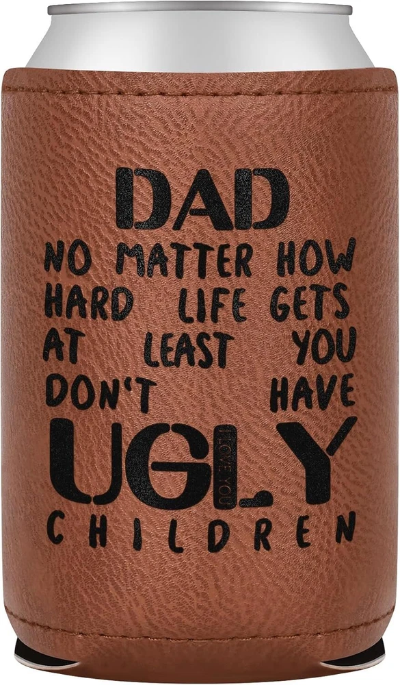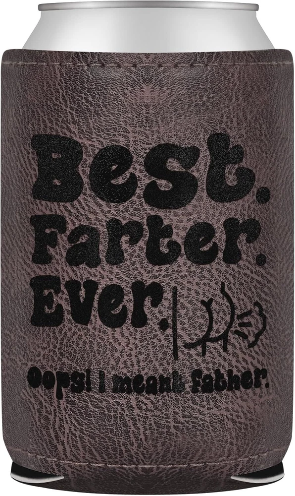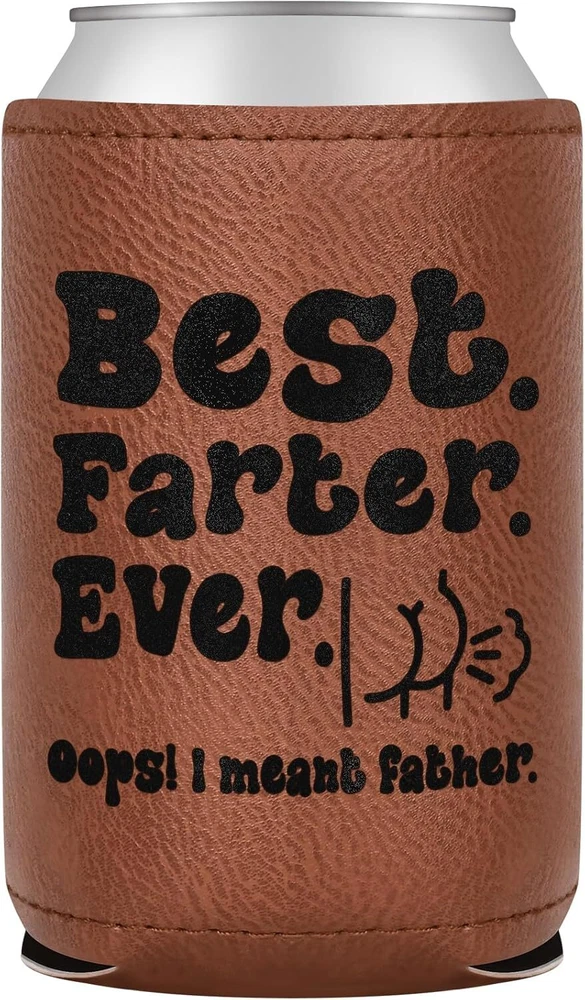 Gifts for Dad from Daughter, Son, Fathers Day Gifts for Men, Husband, Grandpa, 12oz Leather Beer Can Cooler Sleeves, Insulated Beverage Holder, Funny Birthday Gifts About this item FUNNY GIFTS FOR MEN:This leather insulated can cooler which “Best Farter Ever”, is a practical and fun gift that is definitely the best gifts choice for men, fathers, grandfathers, and husbands. It features cute phrases that add vitality and fun to their lives. MEN GIFTS FOR ANY OCCASIONS: This funny gift is suitable for any occasions where love needs to be expressed to them. Great Father's Day gifts,and fathers birthday gifts; get a raise and promotion gifts, retirement gifts, 40th, 50th, 60th, 70th, 80th, 90th birthday gifts, Christmas men's gifts, everything worth celebrating, commemorating, unforgettable, warm moments, this leather can sleeves will help him remember these moments, reminding that they are always appreciated, respected, and loved. KEEP DRINKS COLD LONGER: This leather can coolers, loved by men; keeps their favorite drinks and beer cool for longer and keeps hands warm and dry. It allows men to enjoy their favorite drinks and cold beer while hiking, camping, picnicking, barbecuing, gathering, cycling, fishing outdoors. Its size design is suitable for various 12 ounce standard cans, 16 ounce high cans of drinks or beer bottles, etc. HIGH-QUALITY MATERIALS & EXCELLENT QUALITY: This cute phrase beverage drink holder is made of synthetic leather on the outer layer and 4mm thick insulation chloroprene rubber on the inner layer. And craftsmanship is exquisite, the leather texture are excellent. Our leather can cooler can withstand the test of time, achieving long-lasting durability and elegant appearance. We also come with an exquisite gift box, which is definitely a very dignified and thoughtful gift. COOL DAD GIFTS FROM DAUGHTER/SON: leather beer can cooler, featuring a humorous and relaxed slogan, is the perfect way to showcase his, his father's, men's, and husband's sense of humor and relaxation, conveying his love for life. It is a very commemorative gift for men. From the brand Being a man is never easy, whether as a boyfriend, husband, or father, it means that he bears significant responsibilities. Men worth having special and interesting gifts to remind them that they have always been loved, which will make them feel loved and appreciated, He must feel warm when he receives the gift. Product Description