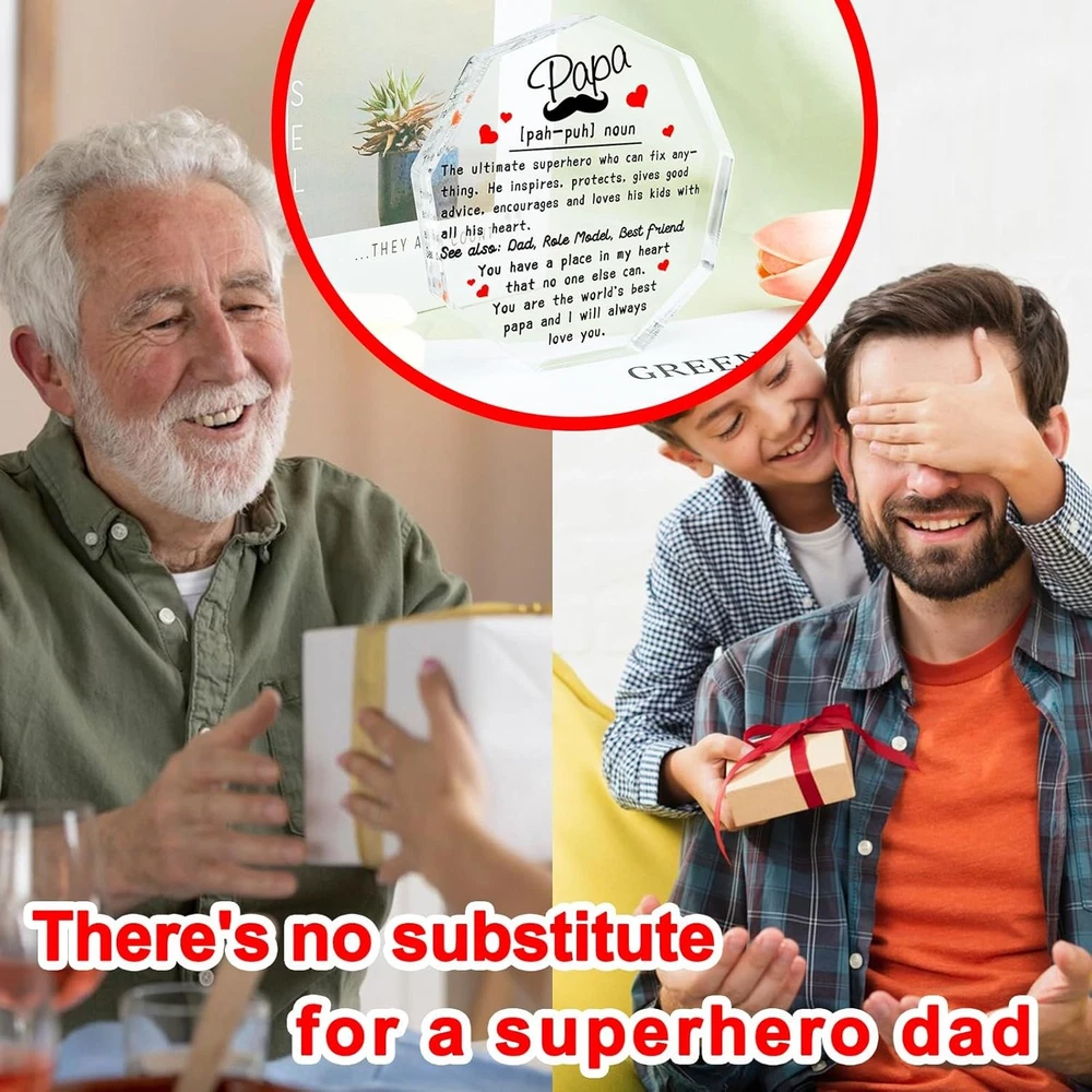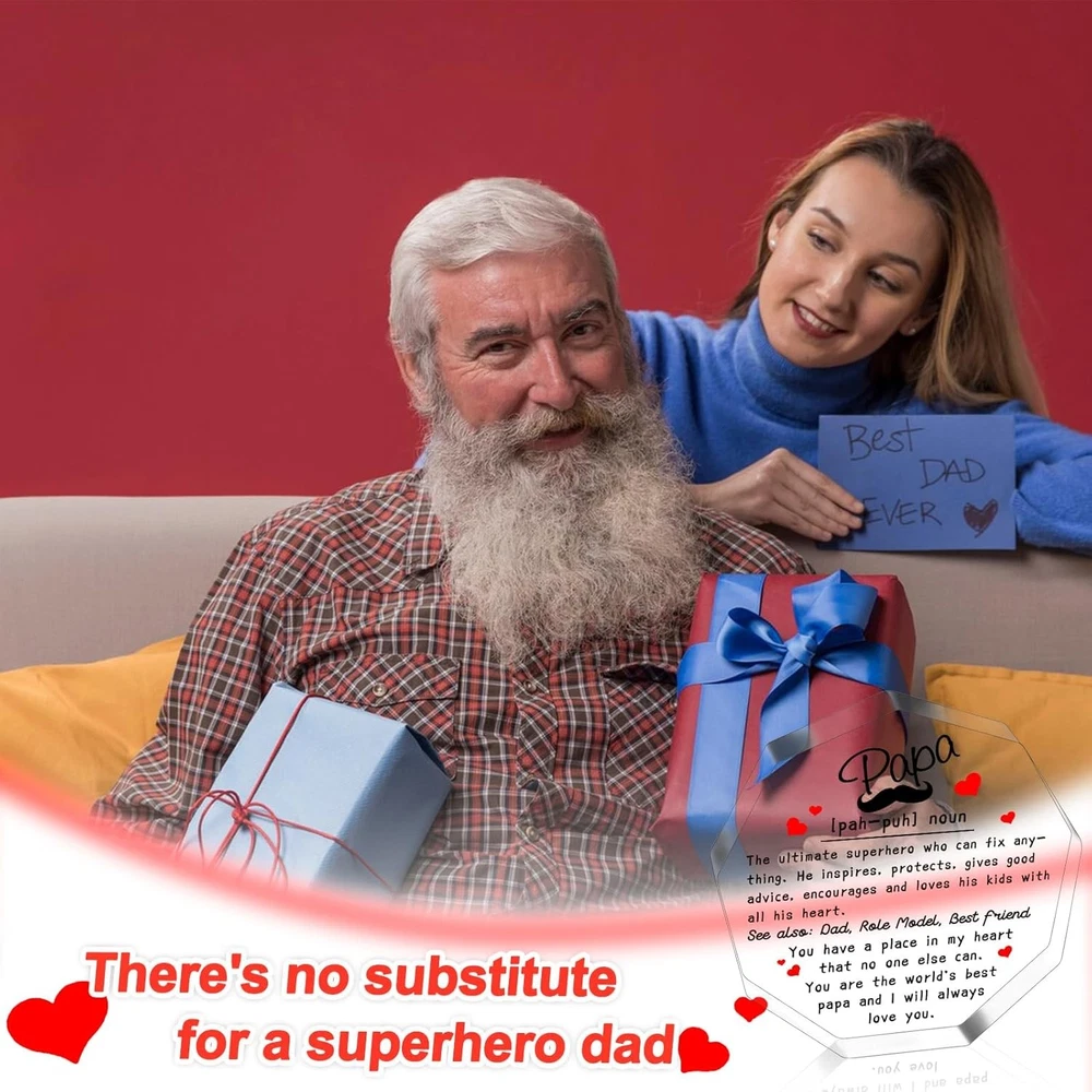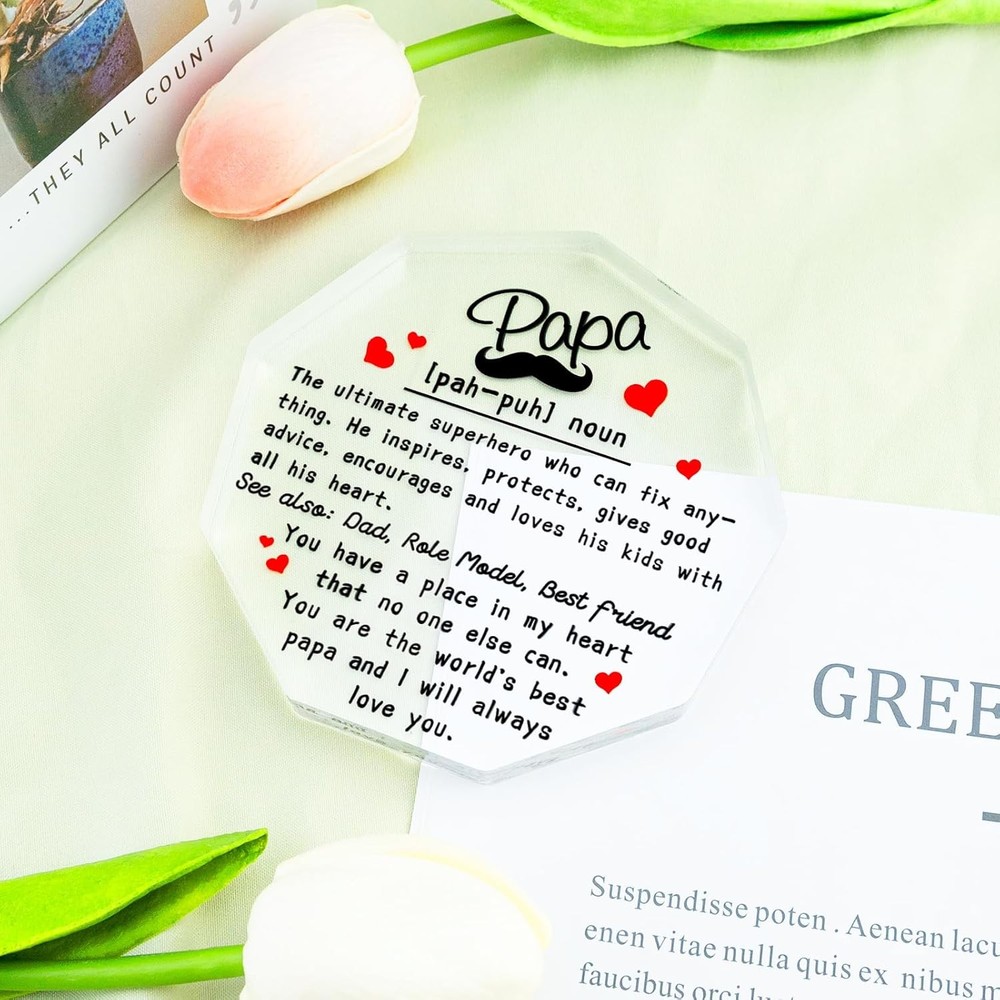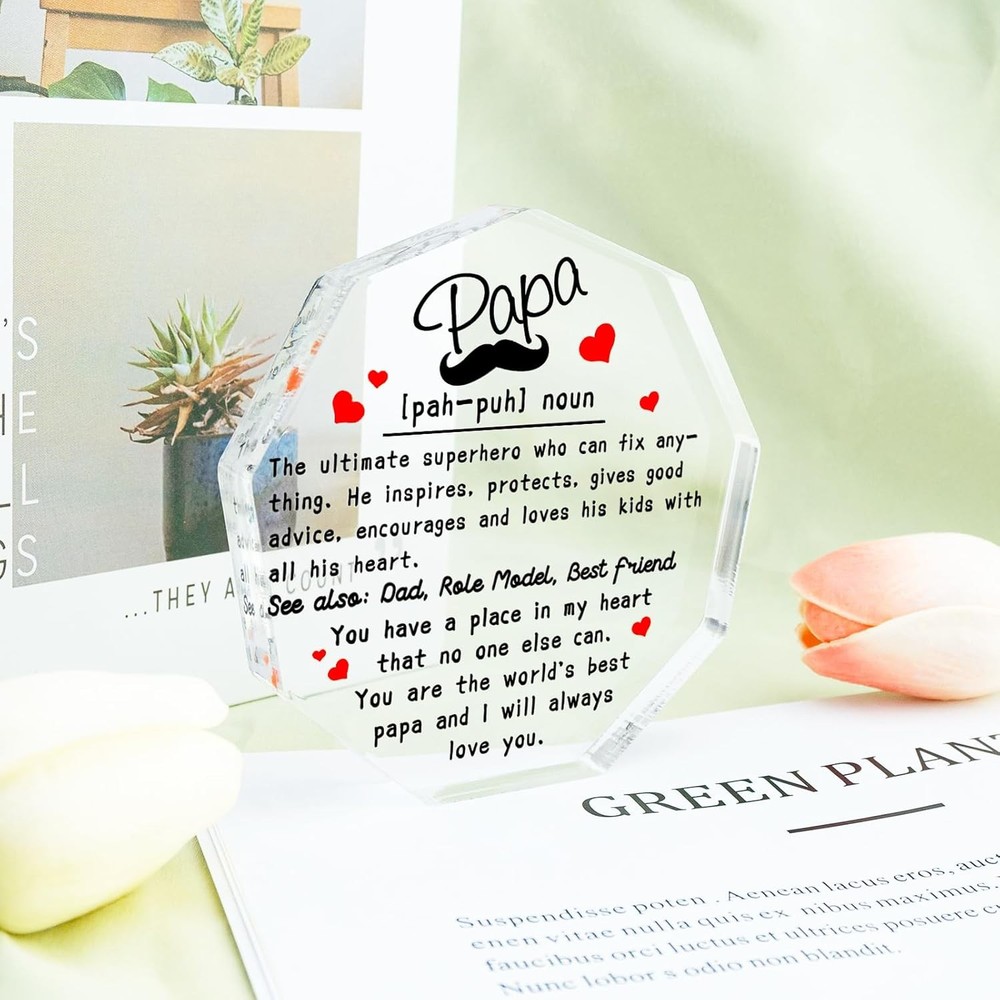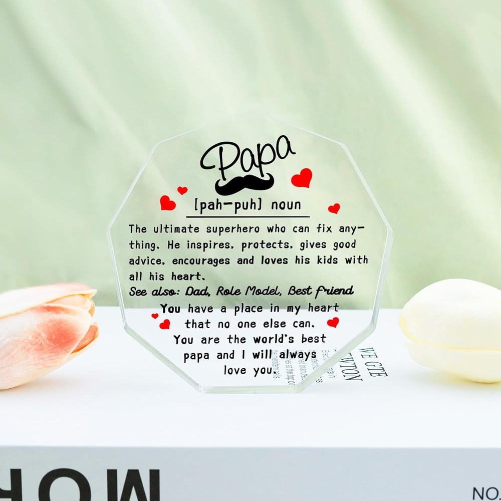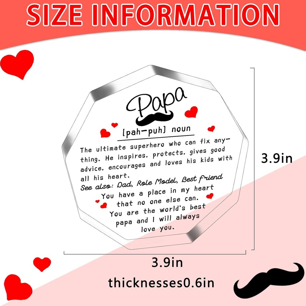 Fathers Day Papa Gifts from Grandkids Birthday Papas Product Details Shape: Nonagon Style: Modern Product Dimensions: 3.9 x 3.9 x 0.1 inches Item Weight: 0.211 ounces Manufacturer: Sugchairo Country of Origin: China Color: Papa Brand: Sugchairo Material: Acrylic Theme: Love, Papa Product Dimensions: 3.9"L x 3.9"W Fathers Day Gifts for Papa/Papa Gifts from Grandkids: This is not just an object, it is a reward for the papa's years of hard work and love, it is a thank you for the silent guard. To choose such a gift is to choose an emotional connection that transcends time and space and tells him, "Papa, you will always be the most important thing in my heart." Gifts for Fathers Day/Papa Birthday Gifts: It's a perfect gift for not only Father's Day, but also birthday, Christmas, and Valentine's Day. It is not only desk decor, but also emotional sustenance, so that love around him all the time. Father's Day Gift Ideas/Papas Gifts: This acrylic table decoration for papa is not only a touch of beautiful scenery on the desktop, but also a bridge connecting the heart and the heart. Every time my papa's eyes passed, he could feel the love and gratitude of my family everywhere. Material - Crafted in high-quality acrylic. Whether it is placed on the desk at home, or the coffee table in the living room, this table decoration can be perfectly integrated, adding a touch of personalized decorative style. Friendly Service - The side with the protective film is the front of the product, remove the protective film to clearly see the text on the product. If you have any questions or concerns, please feel free to contact us.