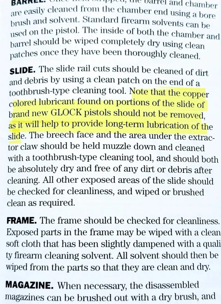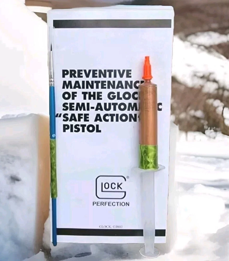 5cc 5ML SIZE The perfect gift for the one who has everything GLOCK. Sure will be a surprise! "The copper colored lubricant found on portions of the slide and trigger connector should not be removed...After cleaning...Apply the copper colored lubricant to portions of the frame, slide and trigger connector..."-Glock Inc 2003 GLOCK COPPER GUN GREASE: 5cc The spirit of the age is to make you forget. To forget the genius of Gaston Glock. To not remember the copper colored lubricant found on portions on the inside of new glock pistols. To not remember the instructions of "Should Not Be Removed " To not remember the Glock endurance test of one million rounds fired from a single Glock 17 pistol.