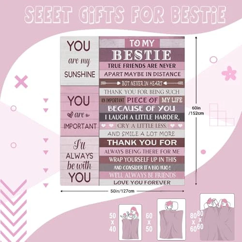 Menu 1. We require immediate payment. 2. We currently accept payment via eBay managed payments only. 3. Once payment is cleared, we will dispatch your shipment within 1-3 business days. Please refer to the "Shipping" tab for more information regarding shipping speed to your destination. Best Friend Birthday Gifts, Gifts for Best Friend Woman, Friendship Gifts for Women, Bestie Gifts for Women, Funny Gifts for Female BFF, Soul Sister Gifts Ideas Blanket (60x50 Inches) Product description Sweet Bestie Gift: Looking for a special gift for your Bestie? This meaningful gift shows your love for her. 'true friends are never apart - maybe in distance, but never in heart.' expresses your everlasting friendship. Moderate Size: Our warm and cozy Bestie blanket can accompany your Bestie on many occasions, which is great for napping, watching TV, reading, and snuggling. 50" x 60" just the right size for use in a bed, sofa, or car. Occasion: Whether it's for a birthday, Christmas, Thanksgiving, graduation or other special holidays, send a thoughtful gift to your friends. I'm sure whoever receives it will be delighted. Soft Material: This blanket is soft, warm, and lightweight. No pilling and no fading. It's very soft and durable to feel like a warm hug. The pattern is visible, Even in cool weather, it keeps you warm on a cold night. Cleaning Method: Wash separately in cold water and it is better to wash the blankets in a mesh laundry bag. Tumble dry on low heat. Do not iron or press with heat PLEASE MESSAGE US IF YOU HAVE ANY OTHER QUESTIONS, AND MANY THANKS FOR READING ALL OF THIS. Copyright ©#. All Rights Reserved.