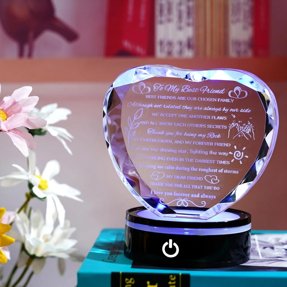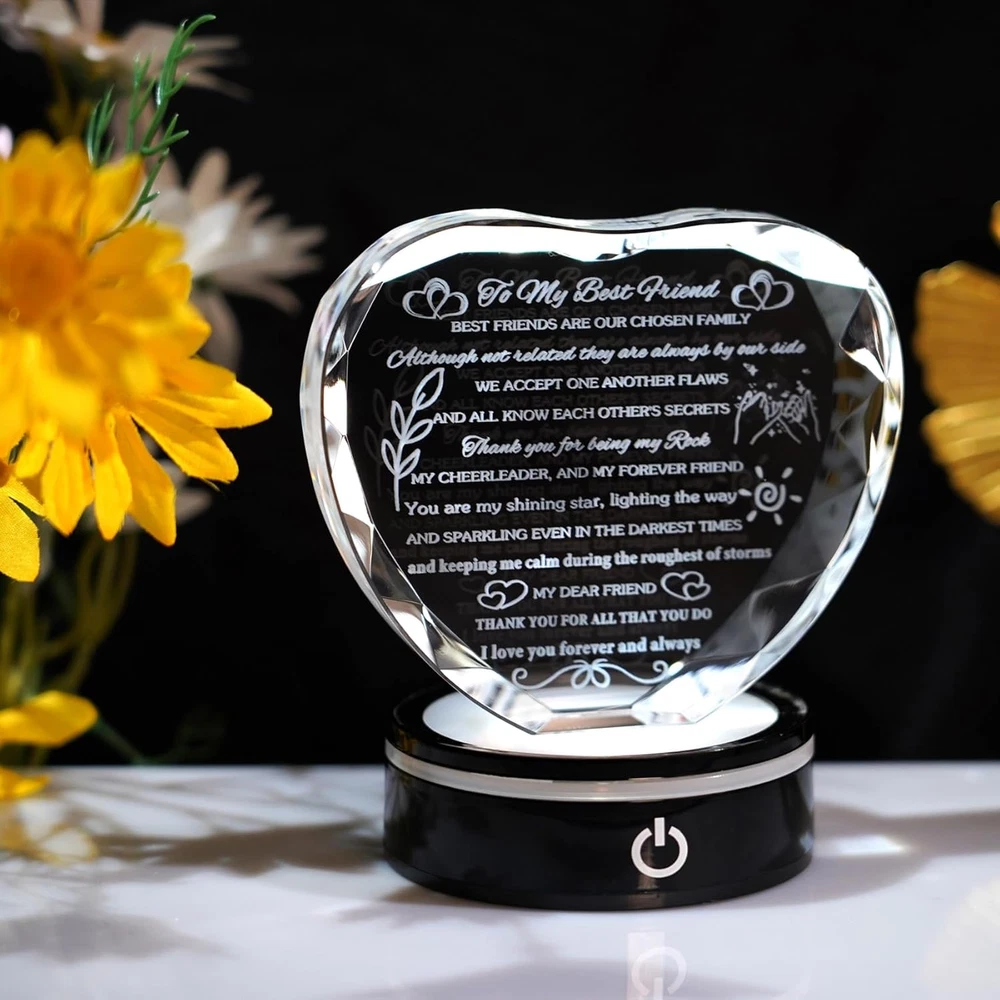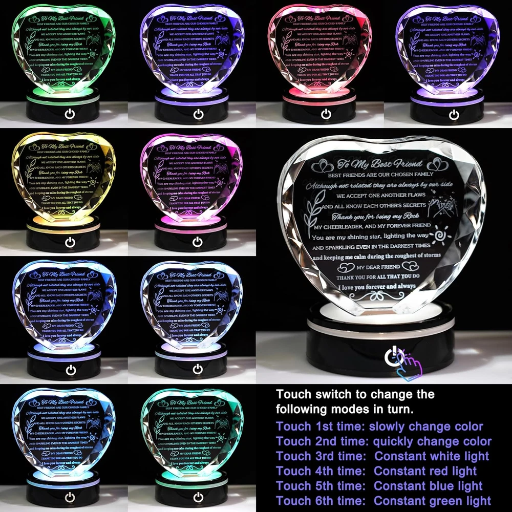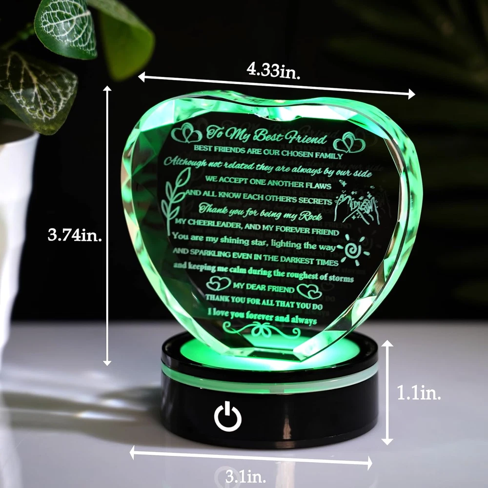 Menu Other Items Feedbacks About Us Contact Us Add To Favorites Best Friend Birthday Gifts with LED Base Crystal Heart Keepsakes Gifts for Friend Friendship Gifts for Women Best Gift Ideas for Friends Female BFF Gift for Her, Bestie Gifts 💎High-Quality Best Friend Birthday Gifts💕 - The best gift for female friends is made of high-quality K9 crystal. It is clearer, more transparent, and shiny. Cut k9 crystal into a heart shape with many facets and has good transparency and a refractive index. Using laser engraving technology to engrave quotes "To My Best Friend" that moved the best friend into the interior of a faceted heart crystal has a special meaning 🎁Gifts for Best Friend💕: Thank you for being my rock, my cheerleader, and my forever friend. You are my shining star, lighting the way. Every word is full of friend's love. It is a compliment and encouragement at the same time and let her know how much she means to you. Crystals and words will not fade in a . It is a gift for a . Your friendship will last a like this crystal gift 🎁Best bestie gifts for women: Unique gift idea, suitable for any occasion as a gift for your best female friend, such as a birthday gift, Christmas gift, or a romantic Valentine's Day gift, Mother's Day, or Friendship anniversary graduation present. Your best friend will be full of warmth and surprise when she receives this gift, helping to make your friendship stronger ✨GREAT HOME DECOR: This crystal heart keepsake is equipped with an LED light base. This colorful LED base has a variety of colors of lights, which can be adjusted according to your preferences (six working modes), creating a romantic atmosphere in a darker space. It will be a good home decoration when you put it on the table, wall shelf, fireplace GIFT BOX PACKING: The crystal gifts come in a stylish gift box with a small clean cloth, led light with a USB, and a blank gift card (You can write whatever words you want), you can send the gift directly, no need repacking TO MY BEST FRIEND Best friends are our chosen family. Although not related they are always by our side. we accept one another flaws and all know each other's secrets. Thank you for being my rock, my cheerleader, and my forever friend. You are my shining star, lighting the way. And sparkling even in the darkest times. And keeping me calm during the roughest of storms. My dear friend, thank you for all that you do. I love you forever and always ❤[Want To Put A Smile On The Face Of Your Best Friend?]❤ ☀ Look no further because the romantic gift-ready are ensured to make her surprise! ☀ We promise, the look on her face will be priceless! ☀ Your bestie and best friend will be very touched and love the moving quotes on the keepsakes. 🎁[Best friend Gifts From Bestie]💕 ☀ You will receive so many compliments when you bring this keepsake to her. ☀ It is an awesome gift that makes her a unique keepsake. ★[Let The Surprise Moment Leave A Good Memory]: ☀ Our specially-unique keepsake is engraved with funny & meaningful words, and conveys your love fully. ☀ She will remember your surprise gift when she sees it on the desk. 💖[The Details Of Keepsake]💖 ★ Measures: 4.33" x 3.94"x 1.18. ★ Premium quality heart-shaped crystal with delicate cut facets for sparkling brilliance ★ Stands freely on its own, also can with led base ❤【Shopping NO RISK】❤ ☀ Special process to ensure that the engraving does not fall. ☀ We back our Motivational Gift with 100% Money Back , friendly Customer Service, to help you buy with confidence. Item Specification Light Source Type LED Item model number XXQM-Friend-LED Style Best Friend Gifts+LED Style 2 Number of Items 1 Power Source Battery Powered Number of Light Sources 1 Country of Origin China Is Electric Yes Lighting Method LED Lamp Type Table Lamp Controller Type Touch Room Type Usb Product Dimensions 1.18"D x 4.33"W x 4.43"H Material Crystal Installation Type Freestanding Finish Type Crystal Specific Uses For Product Decorative, Ambient Indoor/Outdoor Usage Indoor Control Method Touch Water Resistance Level Not Water Resistant Item Weight 1.6 Pounds Connectivity Technology USB Special Feature Color Changing, LED Shade Height 4.33 Inches Shade Color Multicolor Mounting Type Free Standing Color Clear Is Cordless? Yes Base Material Plastic Is Waterproof false Shape Heart Voltage 3 Volts (DC) Recommended Uses For Product Decoration Shade Material Crystal Switch Type Touch Dimensions Shipping Returns Additional Info Product Dimensions: 4.33 "h x 1.18 "h x 4.43 "h. Weight: 1.6 lb Fast shipping is very important for us. Our standard shipping service is FREE. Your order will be shipped within 1-3 business days upon full payment received. Most items are delivered within 3-5 business days, however, please allow 3-10 business days. We are shipping only to USA. We only ship to the confirmed Paypal address. We reserve the right to cancel any order for any reason at any time. We are not responsible for undeliverable addresses. We offer a 30 day return policy from checkout winning date. Your satisfaction is guaranteed! If for any reason you are unhappy with your item, just return it within 30 days for a full refund, minus shipping cost. Please contact us prior to initiating a return so that we can issue you a refund authorization. Items defective upon receipt must be packaged in their retail packaging as if new and returned with a detailed description of the problem. Return shipping fees are not refundable. We reserve the right to decline any returns if the above guidelines are not followed. All of our items, unless otherwise stated, will only run on 120 volts. Please check to make sure your country complies with these specifications. If you have a problem or question regarding your transaction please contact us before leaving any type of feedback. We will work with you to resolve any problem you may have.
