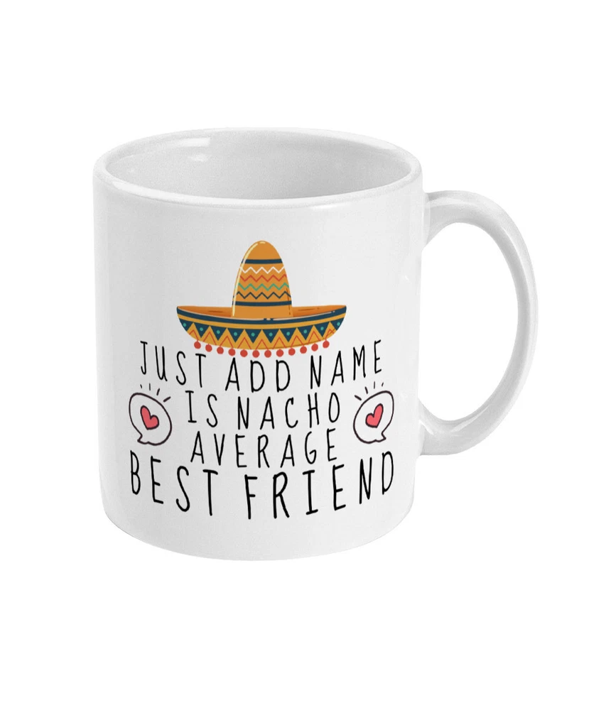 Best Friends Gift Personalised Best Friends Mug Friendship Gift Nacho Average Product Details.. This high quality 11oz. ceramic white mug has a premium hard coat that provides crisp and vibrant color reproduction sure to last for years. Perfect for all hot & cold beverages. The highest quality printing possible is used. It will never fade no matter how many times you wash it. Material: 100% Ceramic. Print both sides. Dishwasher and Microwave Safe. High Gloss + Premium White Finish. Printed in the U.S.A. Personalized & Custom. We support personalized and custom mug to add custom, when placing an order, you can add notes to the "order note" in shipping address section. Also you can contact us directly via message. Shipping Info. Ready to ship in 1 to 2 business days, All products are made-to-order and proudly printed in the United States. Shipped by USPS and DHL, You will receive your order in 5-7 days. Replace & Refund. All products are defective during shipping broken, chipped will be replaced free of charge. You are not satisfied with the product, we will refund 100% money to you. If any other issues arise, please do not hesitate to message, we would be more than happy to assist you.