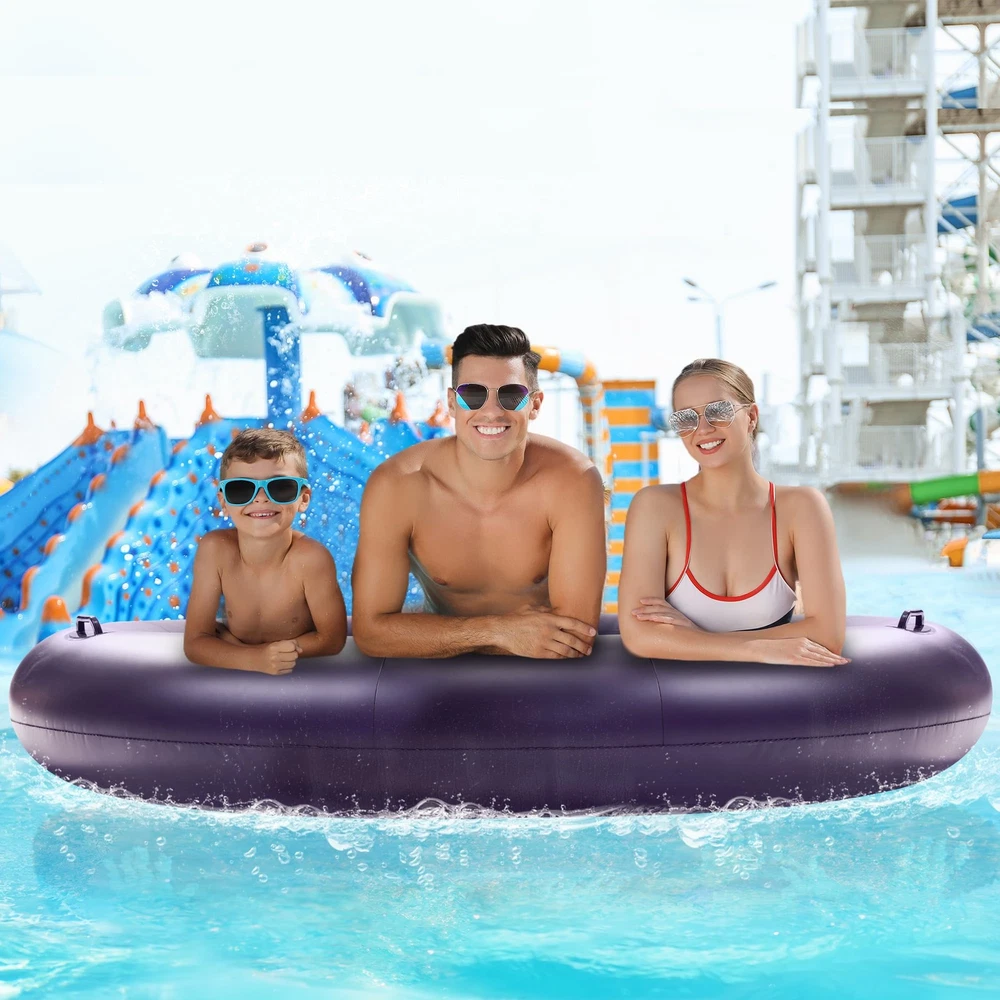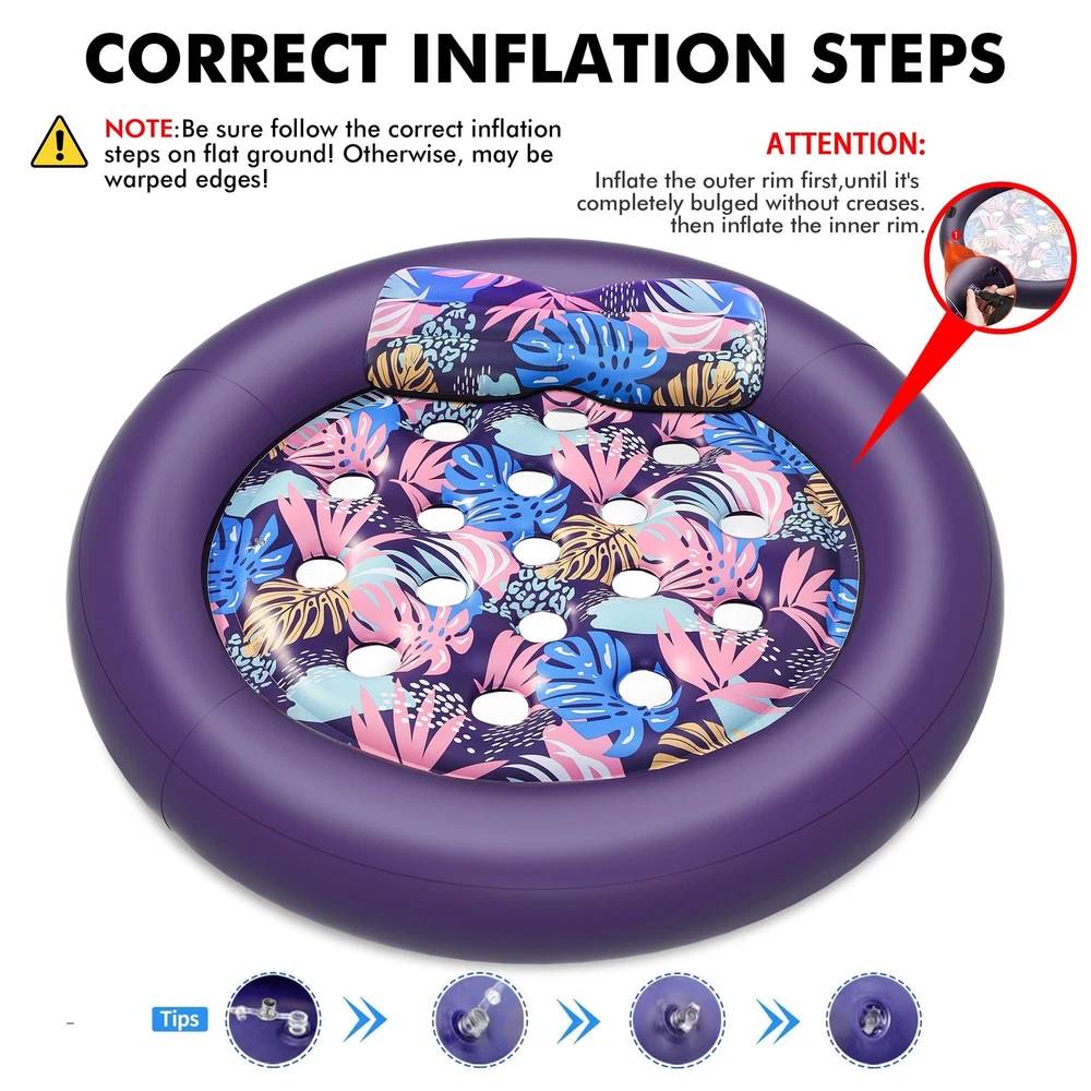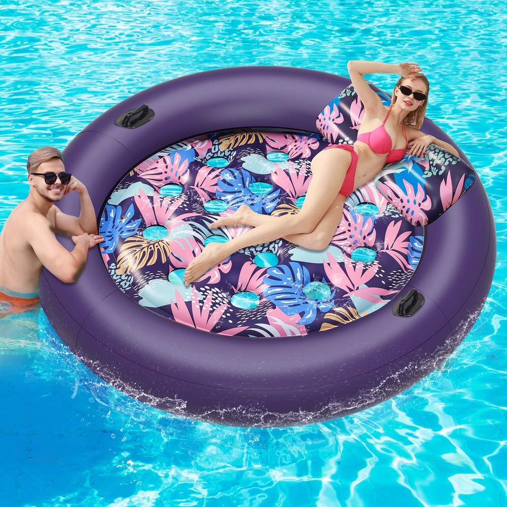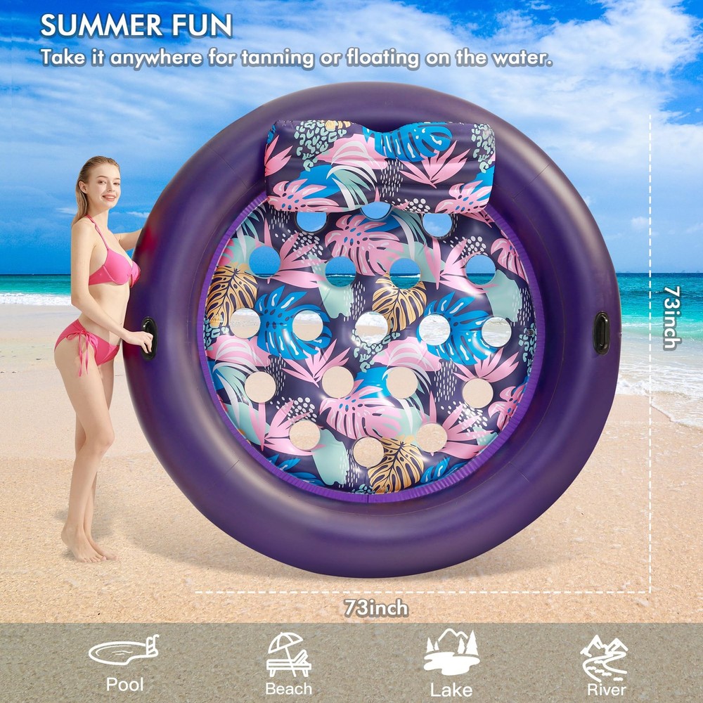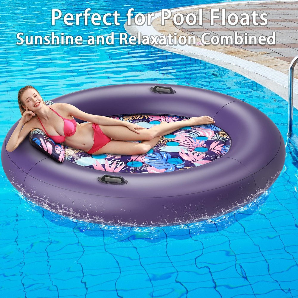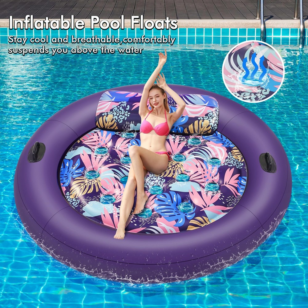 This is the new Tropical Design Pool Lounger Float, which can be a lake float, inflatable pool floats, 2 person pool floats for adults, pool floats adult heavy duty, giant pool float, tanning pool lounger float, etc., and can be used in pools, lawns, beaches, backyards, lakes, and other scenarios to cool down comfortably on your inflatable pool floats while keeping it aesthetically pleasing and enhancing your tanning experience! Ultimate Comfort-Support: Relax in style with our oversized inflatable pool floats. It features a detachable ergonomic headrest and ribbed air cushion base for superior neck and back support. With maximum buoyancy, it feels like floating on a soft bed Oversized Pool Float: At 73" x 73", this pool floats adult heavy duty supports up to 350 lbs, perfect for 1-2 adults or more. Extra width ensures stability and safety, inflates easily with a household pump (not included) for hours of shared comfort Cooling and Balance: With 19 cooling holes for optimal water contact, this float keeps you cool and comfortable all day. Two grab handles ensure easy mobility and balance, offering a stable and relaxing sunbathing experience in the pool, lake, etc Premium Vinyl Pool Float: Made from high-quality Vinyl, this thick, soft float provides prime comfort. Pool float is equipped with a double-layer air valve to prevent leaks, it ensures safe,long-lasting fun and ultimate relaxation while soaking up the sun Versatile Pool Lounger: Perfect for pool parties, beach trips,and relaxation, this pool floats adult heavy duty is lightweight, quick-drying, and easy to carry. Its vibrant design makes it a standout gift for family and friends this summer ATTENTION: Be sure to fully inflate the outer chambers first before inflating the inner chambers, otherwise it may cause warping! The float's center base has cooling vents – please keep feet clear during use to avoid the foot from getting stuck Special Feature: Inflatable, Heavy Duty, Circle, Removable Pillow, Two grab handles, Travel, Lounge, Cooling Holes; Age Range Description: Adult; Product Dimensions: 73"L x 73"W; Weight Limit: 350lb; Material: Vinyl; Color: Purple; Size: X-Large