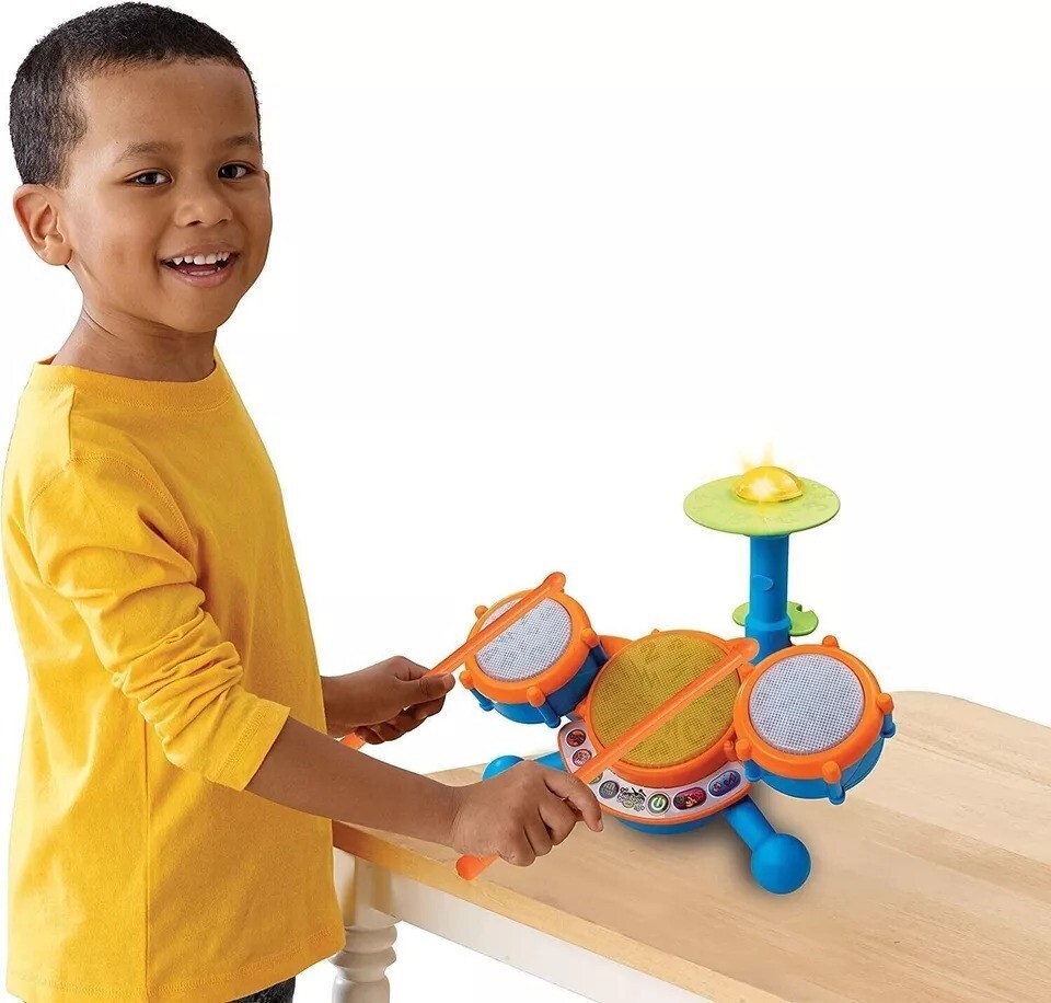 Make Learning Fun: The KidiBeats Drum Set comes with three drum pads and a cymbal to help develop your little one's sensory development through each unique sound Rock Out and Learn: Toddlers can play along to 9 melodies in styles like rock, dance and pop; the drum set also sings about letters, numbers, and music Multiple Ways to Play: Toddlers will be entertained for hours with the 4 modes of play including free play, letters, numbers, and follow-along; each drum features a unique LED light Feel The Music: The KidiBeats Drum Set comes with a set of 2 drumsticks; your toddler can play and dance to their own beat on the attached drums and cymbals Ages 2 to 5 years old: This musical toy makes a great toddler birthday gift; 3 AA batteries are included for demo purposes only; new batteries recommended for regular use