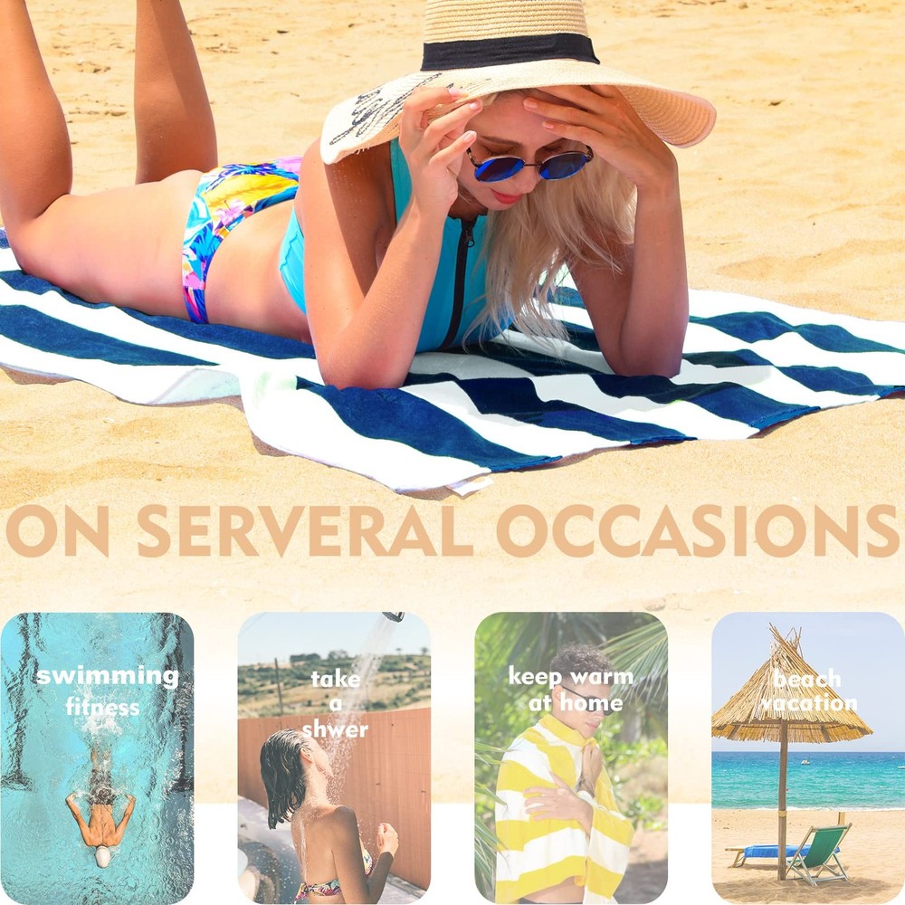 Absolutely love these oversized beach towels! The 35x70 size is perfect for lounging, and the thick, soft cotton feels amazing. Super absorbent and dries quickly, making them great for the pool or beach. The cabana stripe design is stylish and vibrant, standing out without being too loud. They’re sturdy, well-made, and hold up well after washes. Perfect for travel, picnics, or even as a cozy throw. The dark navy color stays rich and doesn’t fade easily. Definitely worth it—highly recommend!