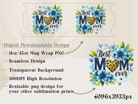 Best Mom Ever Mug Wrap PNG – 11oz & 15oz Sublimation Design – Blue Flower Gift → WHAT YOU GET AFTER PURCHASE • You will be able to instantly download high quality sublimation designs in PNG format. → Files will not contain watermarks → 300DPI Resolution → Design Dimensions: – For 11oz mug – 8,5 x 3,5 inches (2550x1050px) Transparent Background – For 15oz mug – 9 x 4 inches (2700x1200px) Transparent Background – For your other sublimation prints: 13,6×13,1 inches (4096x3933px) Transparent Background