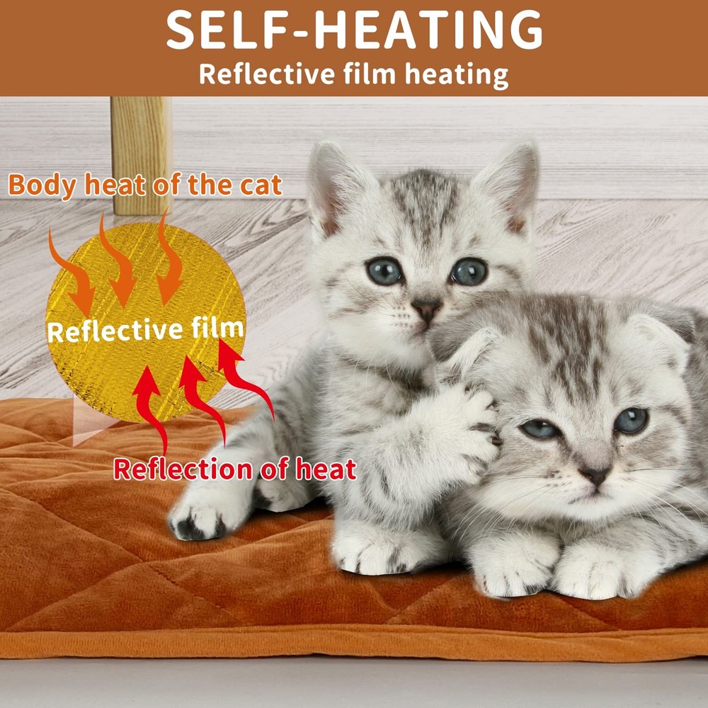 Self-Warming Cat Bed Indoor/Outdoor Super Soft Self Heating Pet Mat Washable Thermal Pad for Cat & Dog 21x15.7 inch… 【SELF-WARMING TECHNOLOGY】---Unique self-warming plush material captures your pet's body heat and radiates the warmth back to your dog or cat for a cozy self heating pet mat 【NO ELECTRICITY NEEDED】---The built-in reflective film reflects heat through the pet itself.Safely and naturally keeps your pet warm using their own comfortable and cozy body temperature 【Two Sizes to Choice】---Available in two sizes 21.6x 16inch / 29 x 19.6 inch. The self-heating pad is ideal for kittens, cats, puppies, dogs, aging and arthritic pets (up to 25 pounds). 【 More application areas】---The thermal mat is lightweight and portable; it's perfect for crates and kennels, and makes for an ideal bedding accessory for traveling, hiking, camping, picnics, and other outdoor activities 【CUSTOMER SERVICE】---If you are at all unhappy for any reason (even after return window), please reach out to us and we will be more than happy to assist you!