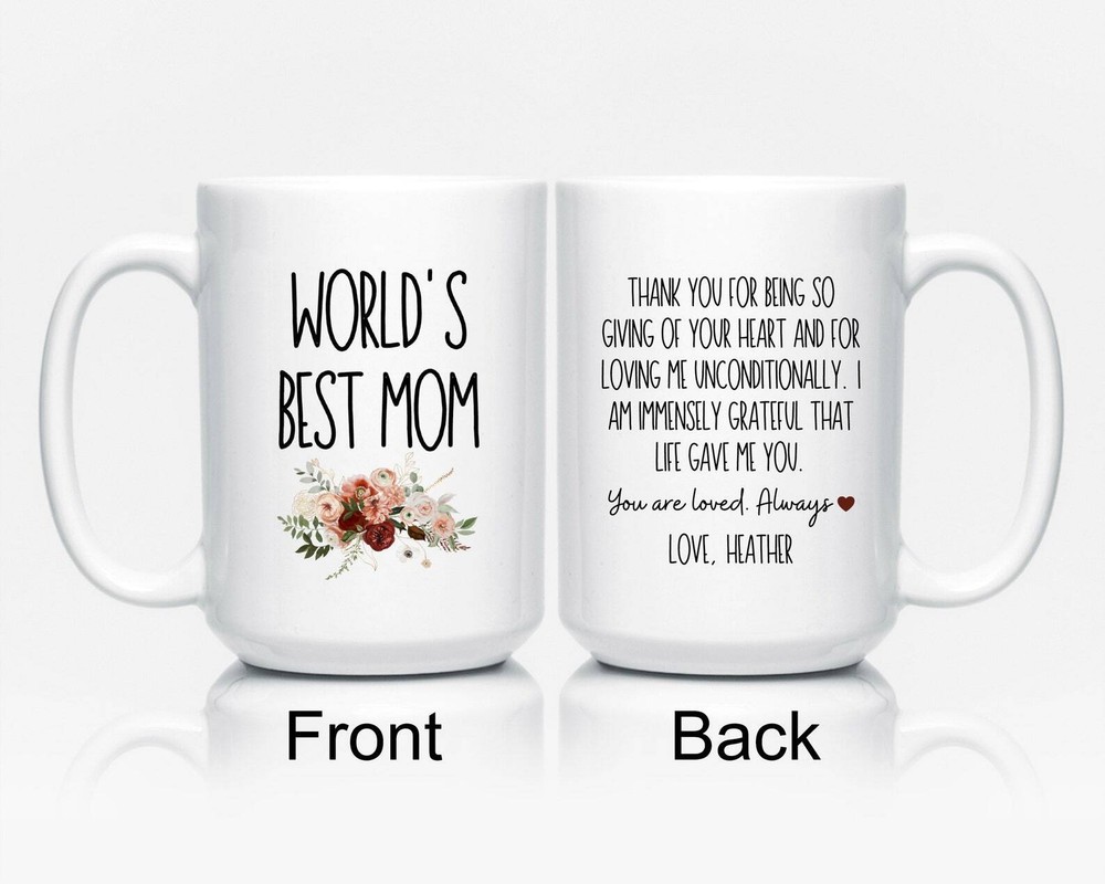 Worlds Best Mom Mug Presents For Mom Personalized Gift For Mom Mothers Day Gifts Product Details.. This high quality 11oz. ceramic white mug has a premium hard coat that provides crisp and vibrant color reproduction sure to last for years. Perfect for all hot & cold beverages. The highest quality printing possible is used. It will never fade no matter how many times you wash it. Material: 100% Ceramic. Print both sides. Dishwasher and Microwave Safe. High Gloss + Premium White Finish. Printed in the U.S.A. Personalized & Custom. We support personalized and custom mug to add custom, when placing an order, you can add notes to the "order note" in shipping address section. Also you can contact us directly via message. Shipping Info. Ready to ship in 1 to 2 business days, All products are made-to-order and proudly printed in the United States. Shipped by USPS and DHL, You will receive your order in 5-7 days. Replace & Refund. All products are defective during shipping broken, chipped will be replaced free of charge. You are not satisfied with the product, we will refund 100% money to you. If any other issues arise, please do not hesitate to message, we would be more than happy to assist you.