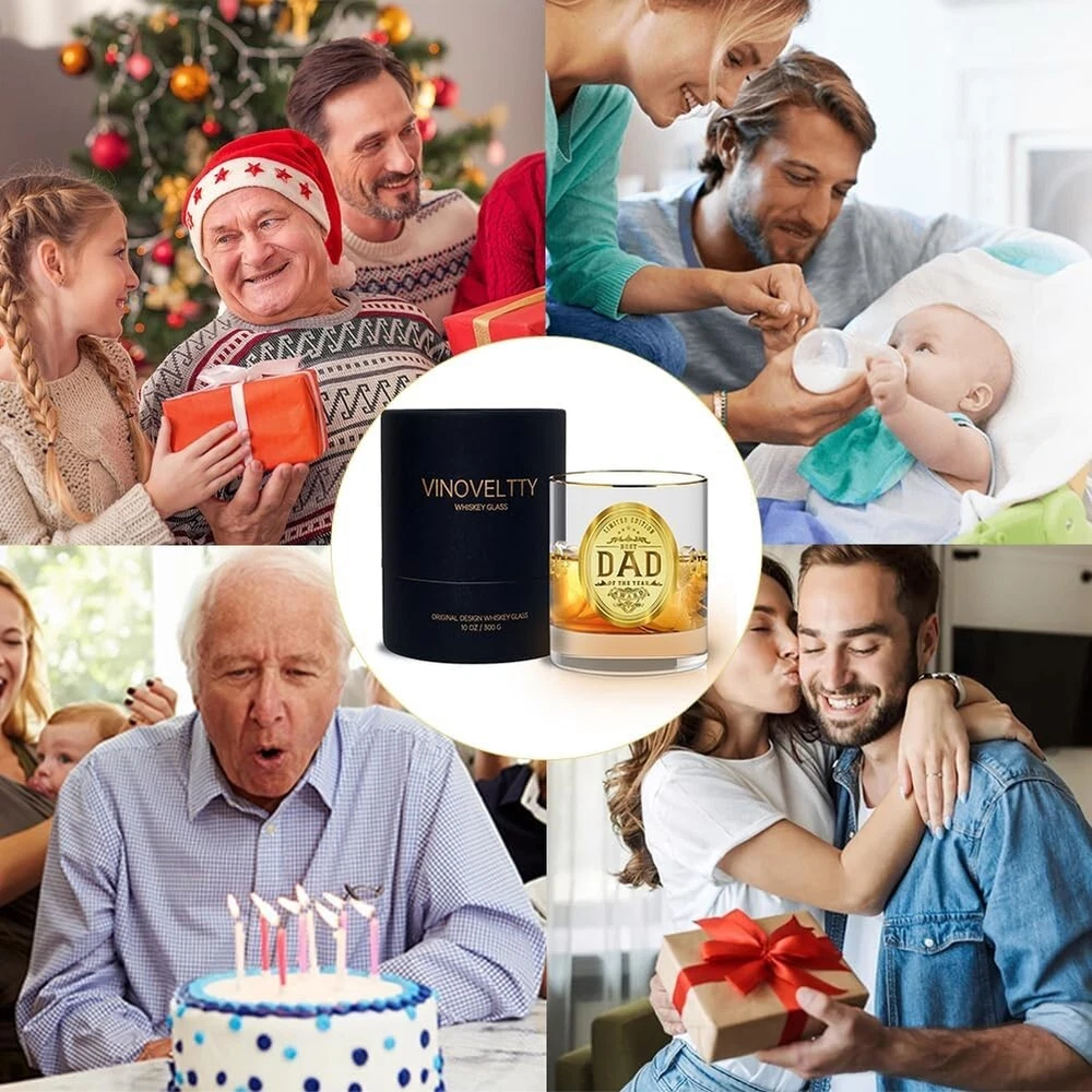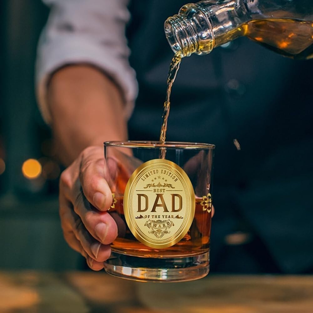Best Dad of the Year Whiskey Glasses, Personalized Whiskey Gifts for Dad, Father Description : UNIQUE DAD GIFT FOR MEN: For new dads, to-be dads, or current fathers, this ‘Best Dad of the Year’ whiskey glass is the ultimate gift for Father’s Day, birthdays, Thanksgiving, Christmas, New Year and more. It’s a fun and memorable gift that will make them laugh and cherish the moment. GORGEOUS DESIGN: Our funny gifts for dad combine whiskey glass and real gold craftsmanship. The cup mouth and medal patterns use a lot of gold, making the entire design luxurious and noble, and it is very suitable as a Father's Day or other special occasion gift. PREMIUM GIFT BOX: Our best dad ever gifts come in an elegant black cylindrical packaging, with gold accents used in parts. The interior uses EVA material to ensure the product is not easily broken. SUPERIOR QUALITY: Our personalized whisky glass is produced from lead-free crystal. Using most advanced firing technique, not only enhances the vibrancy of the design but also ensures that the pattern will not fade during use. SIZE:This best dad bourbon glass has a diameter of 7.5 cm, a height of 9.2 cm, and can hold up to 300 ML. It’s perfect for adding whiskey ice cubes and stones to your preferred beverages like scotch whiskey, bourbon whiskey, vodka, old-fashioned cocktails, etc. INSTRUCTION:To ensure the glossiness of the pattern, it is best to hand wash and do not put in the dishwasher.