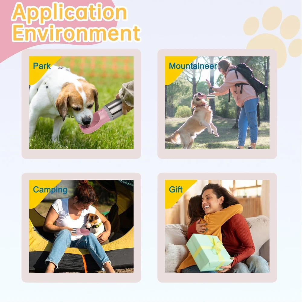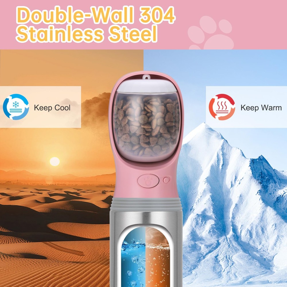 Portable Dog Water Bottle Best Travel Companion: A portable dog water bottle is a must-have item for pet owners on the go! The unique design is both user-friendly and dog-friendly. It's perfect for long-time drives, road trips, hikes, walks, and outdoor activities. 2-in-1 Design Dog Water Bottle and Food Container: This pet water bottle can not only hold water, but also store 100 grams of food. Here is a 100g food container closely attached to the bowl of the water bottle. It provides both clean water and fresh food when you go out with your pets. Durable Material: Made of durable stainless steel, LEAD-free, BPA-free, safe and durable. This portable water bottle for dogs is durable and a reliable companion. Leak-proof & Sturdy: It is designed with a silica gel seal ring that efficiently prevents water leakage. Even if you shake it hard, the water will not overflow, so you can put it in your backpack without worrying about it leaking. Quick & Easy to Use: One-key Open / Lock water, press the water key to fill the water, and release to stop the water. This dog water bottle features a convenient one-hand operation and the built-in bowl makes it easy for your dog to drink. Add a button lock to ensure no accidental touch.