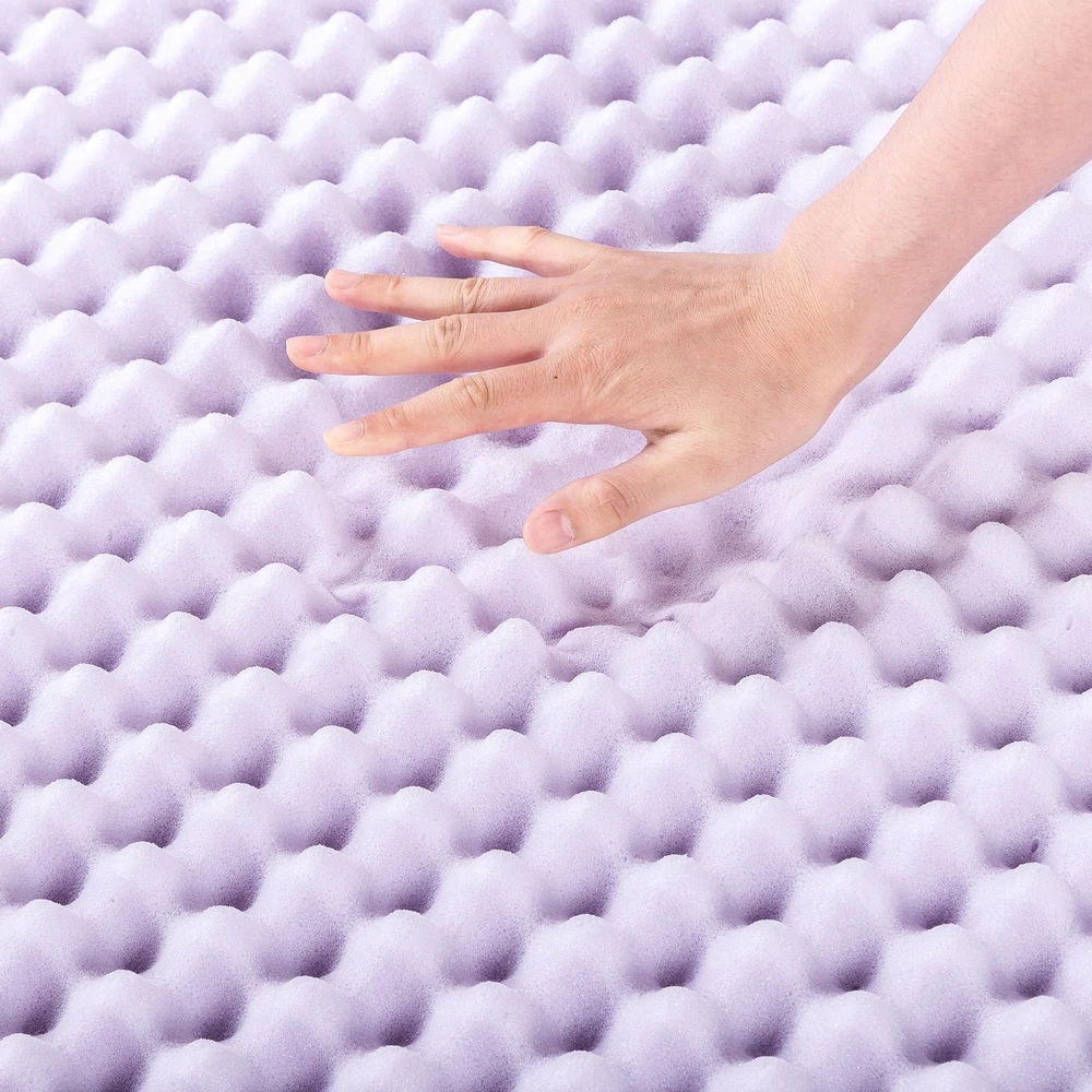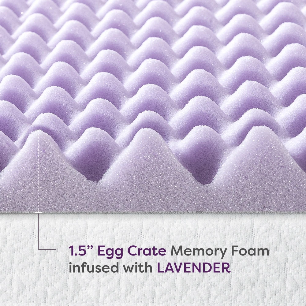 Best Price Mattress 1.5-inch egg crate memory foam mattress topper will ease you into a soothing night with a lavender infusion. It's the body conforming memory foam you love infused with lavender to provide naturally soothing benefits and ultimate comfort. Memory foam is well known for its body contouring features and pressure relief comfort throughout your whole body. Once you lay down, our memory foam toppers will start reacting to the temperature of your body and begin to mold itself to your shape, evenly distributing your weight. The egg crate memory foam structure is designed for better airflow while providing a customized level of support. Combined with our pressure relief system, enjoy total relaxation with ultimate support in key areas including the head, shoulders and hips. 1.5-inch memory foam mattress topper with an egg crate design for increased airflow Soothing lavender infusion in the memory foam is ready to slip you into a relaxing dream Responsive memory foam relieves pressure points and isolates motion to provide undisturbed sleep for you and your partner Compactly rolled and delivered to you along with a 3-year manufacturer's warranty Made with CertiPUR-US certified memory foam to meet high standards for content, emissions and durability