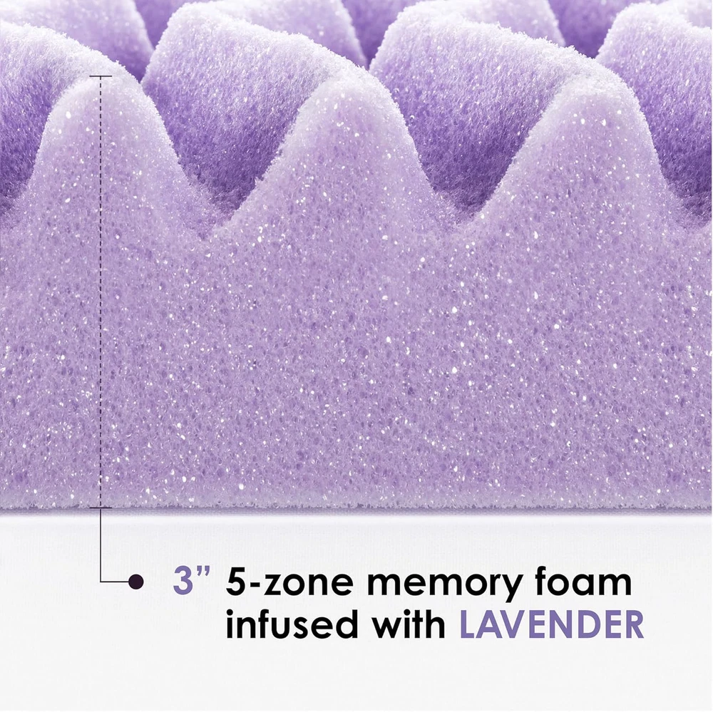 Made with premium quality CertiPUR-US certified memory foam 3 Inch Breathable Memory Foam Pad with 5 Body Zone Layer for Maximum Comfort Different Point of Contact to Prevent Tossing and Turning for Better Sleep Lavender Infused Memory Foam Layer for Calming and Relaxing Scent Product Dimension: (L) 74 inches x (W) 38 inches x (H) 3 inches (3 year manufacturer warranty) Best Price Mattress' New 5-Zone Lavender Bed Topper is a 3 Inch CertiPUR-US certified, premium memory foam mattress topper for maximum comfort and better sleep. Product features a 5 Body Zone with different point of contact to better prevents tossing and turning. Its breathable memory foam layer is also infused lavender for calming and relaxing scent.