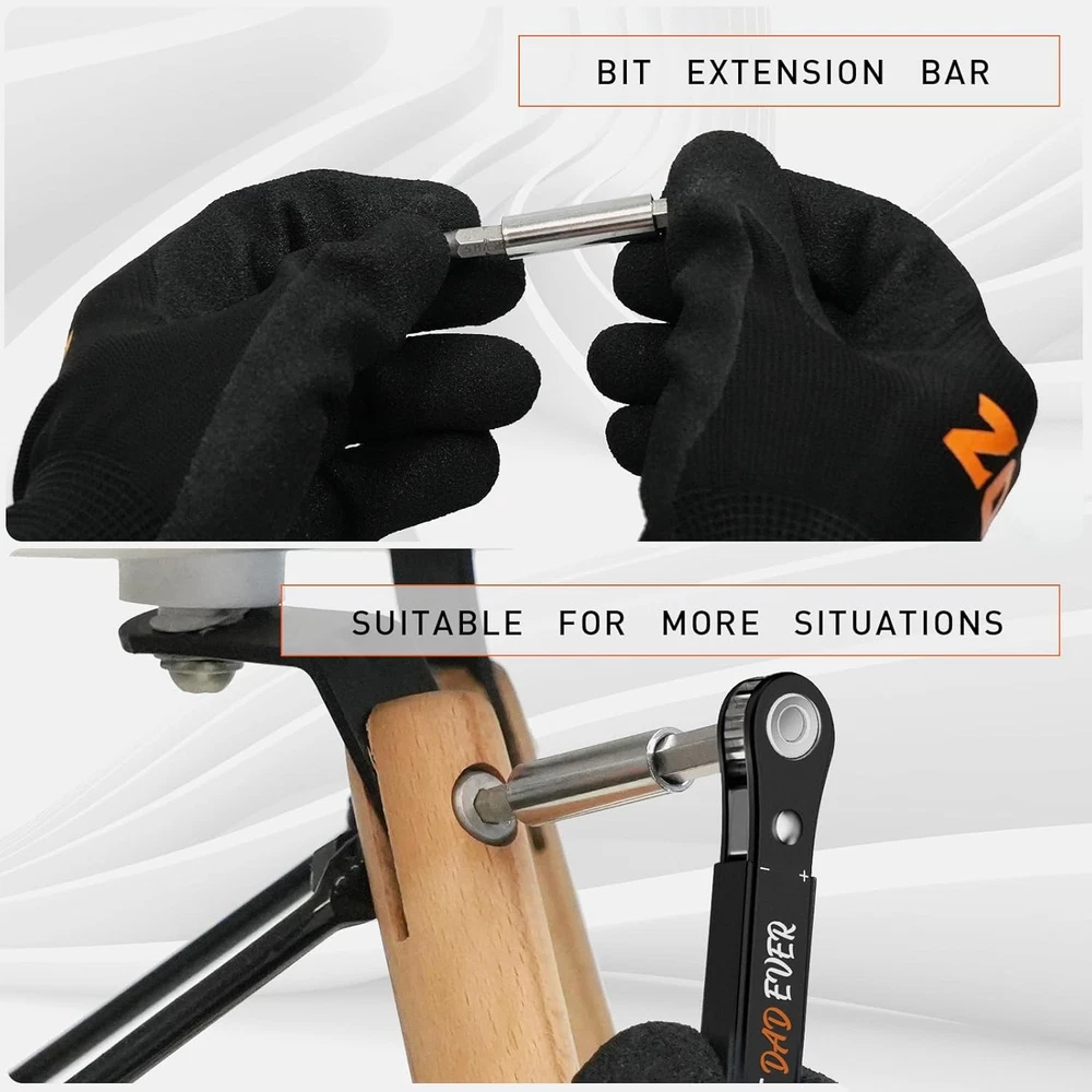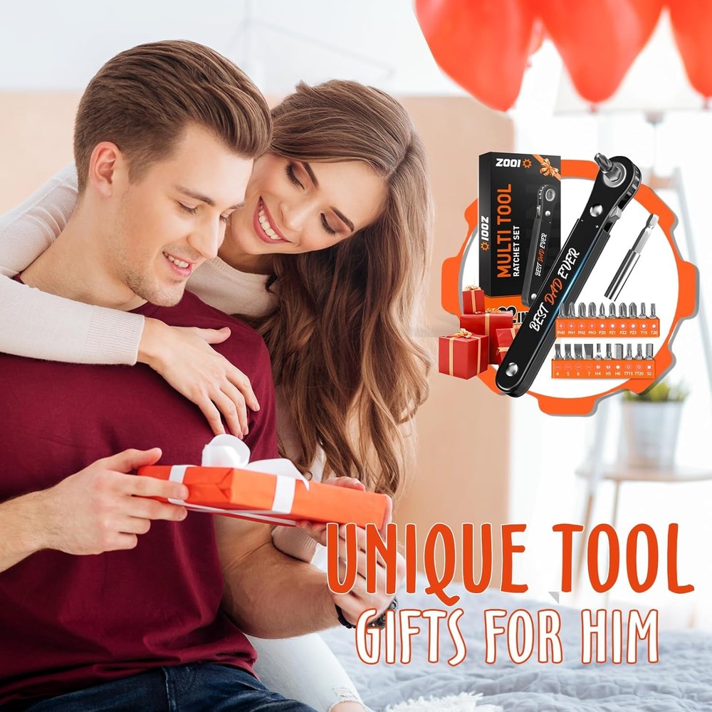 Fathers Day Dad Gifts for Husband Ratcheting Pocket Best Ever Product Details Brand: ZOOI Number of Items: 1 Head Style: Torx Material: Chrome Vanadium Steel, Alloy Steel Color: Best Dad Ever Recommended Uses For Product: Hand Tools Special Feature: Magnetic Tip Model Name: GJ0129-BK-SET Manufacturer: ZOOI Item Weight: 6.7 ounces Package Dimensions: 7.2 x 2.64 x 0.67 inches Item model number: GJ0129-BK-SET Finish: Powder Coated Item Package Quantity: 1 Special Features: Magnetic Tip Batteries Included?: No Batteries Required?: No Brand: ZOOI Number of Items: 1 Head Style: Torx Material: Chrome Vanadium Steel, Alloy Steel Color: Best Dad Ever 【Fathers Day Gifts from Daughter Wife Son】Offset screwdriver features a ratchet mechanism andcarbon steel with satin chrome, all screwdriver bits are constructed of CRV Steel and built to last for years. ZOOI Right Angle Screwdriver Set packaged in a unique gift box, it makes an excellent choice for Farthers Day Gifts. Suitable for dad, husband, grandpas, handymen, car mechanics, DIY enthusiasts.They will love receiving such a practical gift from wife or son on Father’s Day. 【Dad Gifts for Fathers Day】Upgraded strength control and magnetic-like clamp - makes repair work smoother and more efficient! This 90-degree screwdriver drill has an upgraded and optimized directional control button that produces a crisp "click" sound for precise control, flexible tightening and loosening of screws, and ease of use. The ratcheting screwdriver with magnetic clip holds the drill bit tightly and speeds up the work, making it the best gift for dad! 【Gifts for Dad Who Wants Nothing】At only 1.06 inch, this compact ratchet screwdriver is perfect for all kinds of tight Spaces that a regular screwdriver can't reach. Its mini design means that the torque wrench can get into all the hard to reach places, making repairs easier and faster than ever! The ratchet screwdriver set is ideal for repairing door handles, computers, cars, bicycles, blinds, washing machines. Portable and powerful gifts for dad who wants nothing. 【22- in-1 Tool Kit for Every Task】Right angle screwdrivers replace bulky toolboxes for a wide range of situations. With 20 drill bits and a drill extension adapter included, you'll have all the necessary tools at your fingertips to tackle various repair tasks. The offset screwdriver set includes Slotted Bit: 3.5mm, 4.5mm, 5.5mm, 7mm, Phillips Bit #0 #1 #2 #3, Pozidriv Bit #0 #1 #2 #3, Torx Star T15 T20 TT15 TT20, Hex allen bits H4 H5 H6, Square Screwdriver S2. 【Useful Tools for Men】Mini-size low profile ratchet driver handle is only 0.25” thick and 4" long, making it perfect for tight and awkward spaces. Essential tools for daily maintenance work, unique Edc Gear tools gifts for men.