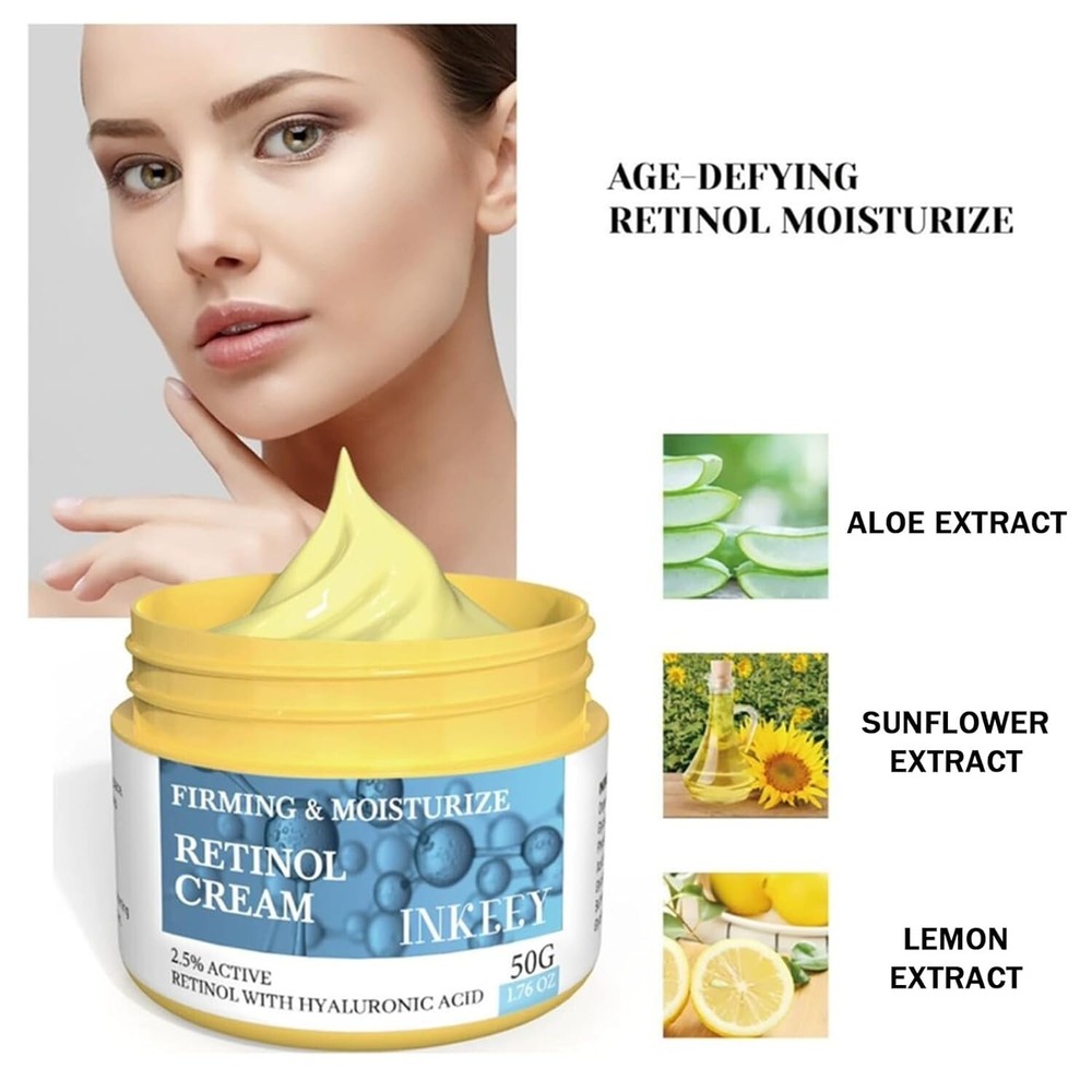 Retinol Moisturizer Anti Aging Cream for Face with 2.5% Retinol Cream, Collagen Retinol Hyaluronic Acid cream, Face Wrinkle Cream for Women Men, Reduce Fine Lines, Deep Hydration Cream 50gm/1.7 fl oz (pack of 1) 【Active Retinol】: This retinol cream for face fights the signs of aging with 2.5% active retinol and super-hydrating hyaluornic acid, leaving the skin smooth, soft, and glowing, retinol night cream for face helping the skin retain moisture for plumped look 【Hydrating and Nourishing】: Anti aging face cream with Hyaluronic Acid deep into the dermis for 16+ hours of hydration, plumps your skin for a healthier, fuller, and younger. Replenish moisture with a bit of help from Aloe Vera, Lemon and Chamomile. Nourish your skin while improving your skins elasticity all at once. Combination of ingredients make this retinol moisturizer for face non-irritating and effective 【Effective Anti-Aging Ingredients】: Face moisturizer for women visibly restore volume to areas prone to sagging and wrinkles. Aloe Vera defends against visible redness and irritation. Sun flower extract and lemon against environmental damage and reduces puffiness. Mens retinol face cream promote a more youthful look and show off a more radiant skin by breaking up the look of sun damage and wrinkles 【Firm Skin, Glow Skin】: Retinol for face helps to improve glow skin and texture, and reduce fine lines, acne, dark circles, wrinkles and sun damage. Anti aging night cream for women Improve the skin texture around the face, eyes and neck, while reducing acne, sunburn and other marks. Retinol collagen face cream increase the firmness and elasticity of the skin 【Light & Non-greasy】: Our anti age face cream for women has a light texture and gets easily absorbed into your skin without feeling sticky or greasy. Anti wrinkle face cream leaves the skin feeling refreshed and non-greasy Note: This Product is designed to deliver optimal results, offering high-quality performance and satisfaction. Please note that individual experiences and outcomes may vary based on personal use, preferences, and unique circumstances. For best results, we recommend following the provided guidelines and ensuring the product is used as intended. Product result may vary for every individual.