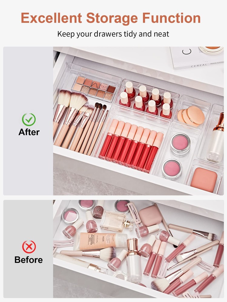Size: 8.9 x 6 x 2 inches (1 pack), 5.9 x 5.9 x 2 inches(2 packs), 8.9 x 3 x 2 inches(2 packs), 5.9 x 3 x 2 inches(5 packs), 3 x 3 x 2 inches(6 packs) Multiple Sizes - 5 different sizes and 16 pieces trays offer you customize combinations to store stuff and organize drawer for your specific needs. Size: 8.9 x 6 x 2 inches (1 pack), 5.9 x 5.9 x 2 inches(2 packs), 8.9 x 3 x 2 inches(2 packs), 5.9 x 3 x 2 inches(5 packs), 3 x 3 x 2 inches(6 packs). Durable and Non-Slip Material - The drawer organizers made by unbreakable plastic, ensure the long life of use. Silicone non-slip pads at the bottom of the bin prevent the box from moving freely when dragging the drawer. Drawer Space Organizer - Absolutely fit different size drawers, it’s able to use in dresser, office, kitchen and bathroom. Ideal for arranging your toiletries, makeup tools, cosmetic, office supplies, kitchen utensils, jewelry and more. Customize and Stackable Trays - Individual organizer cases can be stacked and sorted out your space easily. Save your Times - Clear drawer organizers can save your time to organize and find your stuff, it’s easy to find and use your items in the drawer, keep your space neat, help you get a neat lifestyle and enjoy more.
