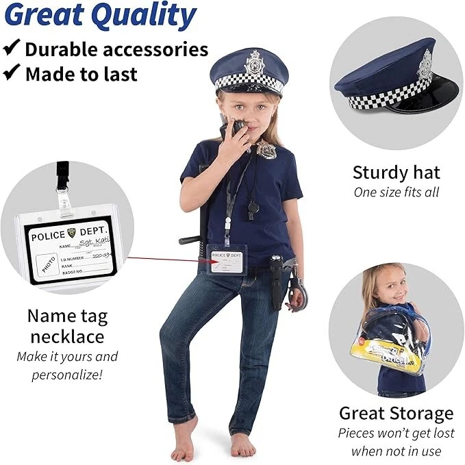 Kids Fireman and Policeman Role Play Costume Set, Firefighter Suit, Police Vest, Hats, Accessories DURABLE AND PERFECT FOR KIDS: The police costume for boys and girls is made from washable durable fabric suitable for an exciting toddler dress up police officer pretend playset IDEAL GIFT: This police officer costume for kids is useful for realistic, harmless, educational games which keeps children entertained & happy! Our inclusive policeman kids costume includes an 11 pcs police toy set. Ideal kids dress up clothes for play perfect for Christmas, Halloween, Birthday Party EXCELLENT QUALITY: Our kids police costume has the highest quality & has the safety standards your child deserve. This police costume for kids comes with kids police hat, police whistle, toy handcuffs, flashlight and walkie talkie w/ batteries, police baton, toy gun, police badge toy, name card and storage bag SUITABLE FOR KIDS AGES 3 & UP: This complete police dress up for boys and girls is made suitable for ages 3 and above. Make your little officer ecstatic with this toddler dress up clothes!