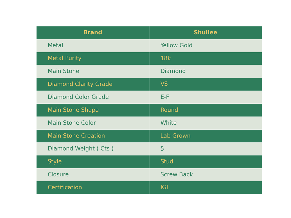 eBay Listing Template About Shop Sale Feedback Contact ❮ ❯ Brand Shullee Metal Yellow Gold Metal Purity 18k Main Stone Diamond Diamond Clarity Grade VS Diamond Color Grade E-F Main Stone Shape Round Main Stone Color White Main Stone Creation Lab Grown Diamond Weight ( Cts ) 5 Style Stud Closure Screw Back Certification IGI Free Next Day Delivery 30 Days Return Policy See our return policy Online & Phone Support 100% Buyer Satisfaction Product Description About Us Shipping Payment Return Welcome to Shullee Welcome to Shullee — where timeless beauty meets refined craftsmanship. We are proud to offer a thoughtfully curated collection of exquisite Jewelry and Watches, designed for those who appreciate elegance, individuality, and style. At Shullee, every piece tells a story. Whether you’re looking for a bold statement necklace, a pair of delicate earrings, or a classic timepiece, our diverse selection has something for every occasion and taste. Our passion lies in helping you express your unique style through pieces that blend artistry with sophistication. We also bring you the brilliance of shullee — a line dedicated to finely crafted diamond jewelry that radiates elegance and emotional depth. From timeless solitaires to intricate rings, pendants, earrings, and luxury bracelets, each design is crafted to celebrate moments both big and small. Quality is at the heart of everything we do. We use only ethically sourced diamonds and high-grade metals, ensuring each item reflects the highest standards of beauty and excellence. Our jewelry is more than an accessory — it’s a symbol of love, legacy, and self-expression. At Shullee, we’re dedicated to creating a memorable and seamless shopping experience. From personalized recommendations to secure and prompt delivery, we ensure every step is exceptional. Discover the allure of Shullee — where every piece is a masterpiece waiting to be part of your story. Discover elegance redefined. Explore the brilliance of Shullee today. Shipping Information We’re pleased to offer free standard shipping on all orders—both domestic and international—through trusted and reliable courier services. Every order is carefully packaged using durable materials and protective cushioning to ensure your products arrive in perfect condition. Once your package is shipped, you’ll receive an email with full tracking details so you can monitor your order every step of the way. If you need your items delivered faster, expedited shipping options are available at checkout for an additional fee. For international orders, please note that items may be subject to customs processing depending on their declared value. Import duties, taxes, and brokerage fees are not included in the item price or shipping cost and are the buyer’s responsibility. We recommend checking with your country’s customs office for details before placing your order. Sellers are required to declare the correct customs value and comply with all applicable declaration laws. As the buyer, you should be aware that customs inspections may cause delays, and additional charges such as import taxes or delivery fees may be due at the time of receipt. If you have any questions about your shipment or customs policies, your local customs office or international shipping resources (such as eBay’s page on international trade) can provide helpful guidance. Payment Information All payments are handled exclusively through eBay’s Global Payment System, offering a safe and hassle-free transaction process for every buyer. Your order will be processed and shipped once payment has been confirmed by eBay. This secure system ensures that your payment details remain protected throughout the transaction. If you have any questions regarding payment methods or need help with your transaction, feel free to reach out to our customer support team. Return Policy We provide a 30-day return window on all products to ensure your complete satisfaction. To qualify for a return, items must be unused, in their original condition, and packaged in their original box. Our return process is simple and customer-friendly. If you're not completely satisfied, just reach out to our support team within 30 days of receiving your order to initiate the return. After we receive and inspect the returned item, we’ll notify you of the refund status. Approved returns will be processed back to your original payment method. If your item arrives damaged or defective, please contact us immediately so we can assist you. Please note: Customized or personalized products are not eligible for return. About Us Welcome to Shullee Welcome to Shullee — where timeless beauty meets refined craftsmanship. We are proud to offer a thoughtfully curated collection of exquisite Jewelry and Watches, designed for those who appreciate elegance, individuality, and style. At Shullee, every piece tells a story. Whether you’re looking for a bold statement necklace, a pair of delicate earrings, or a classic timepiece, our diverse selection has something for every occasion and taste. Our passion lies in helping you express your unique style through pieces that blend artistry with sophistication. We also bring you the brilliance of JewelXpress-Diamonds — a line dedicated to finely crafted diamond jewelry that radiates elegance and emotional depth. From timeless solitaires to intricate rings, pendants, earrings, and luxury bracelets, each design is crafted to celebrate moments both big and small. Quality is at the heart of everything we do. We use only ethically sourced diamonds and high-grade metals, ensuring each item reflects the highest standards of beauty and excellence. Our jewelry is more than an accessory — it’s a symbol of love, legacy, and self-expression. At Shullee, we’re dedicated to creating a memorable and seamless shopping experience. From personalized recommendations to secure and prompt delivery, we ensure every step is exceptional. Discov