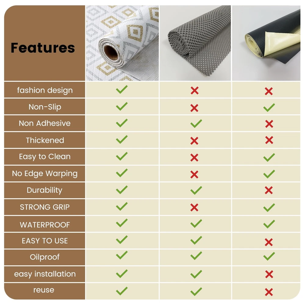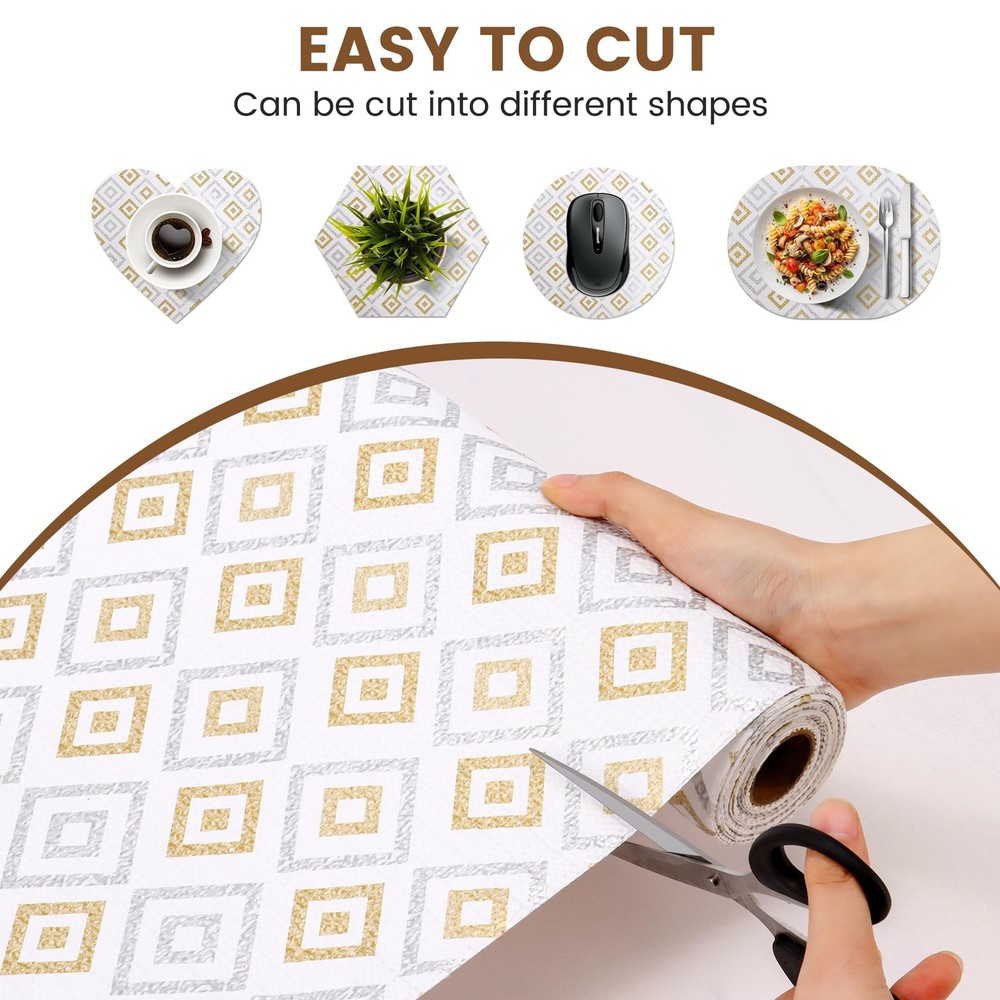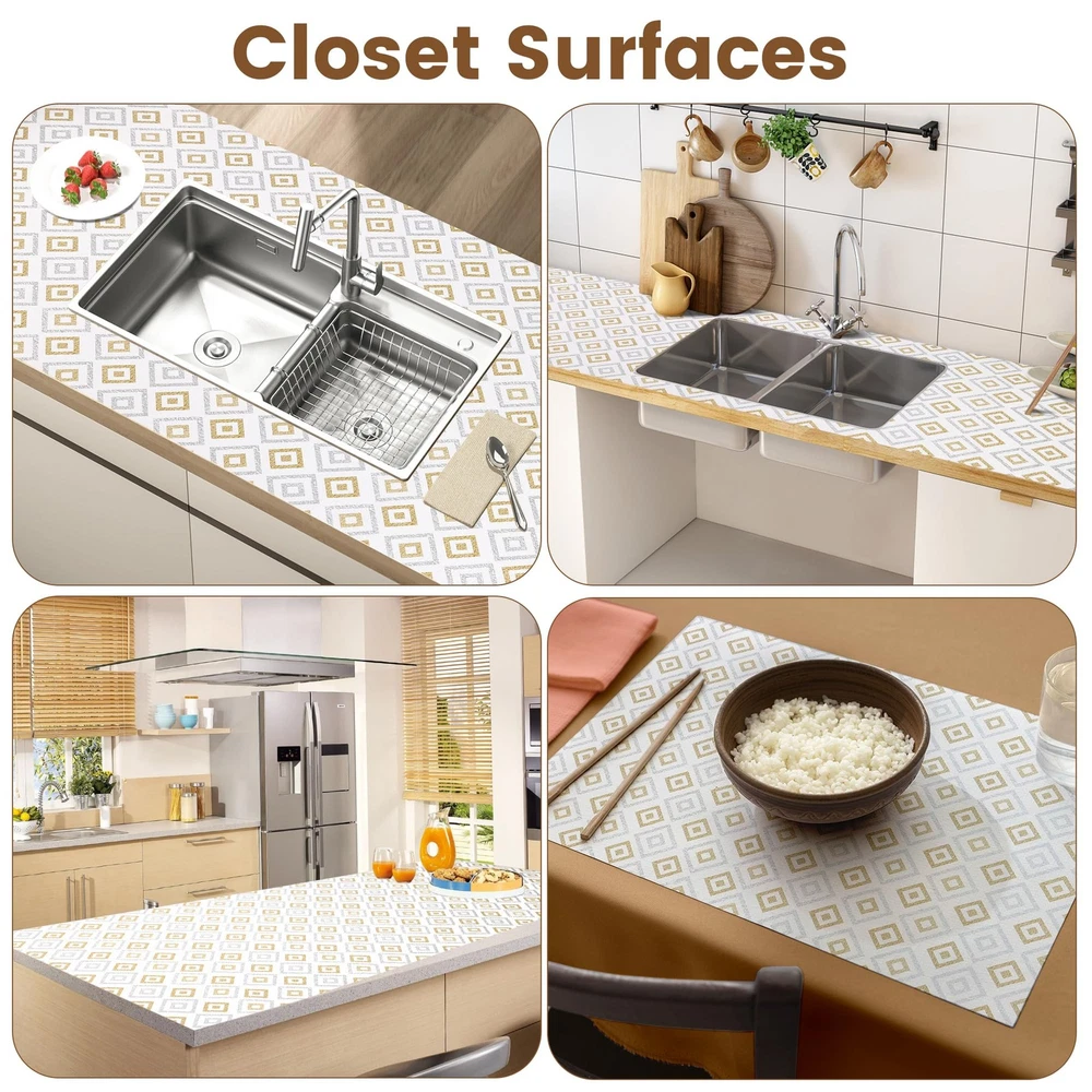 Shelf Liners for Kitchen Cabinets Non-Adhesive, Cabinet Liners for Shelves, Drawer Liners for Kitchen Cabinets,10" X 120" Strong Grip Waterproof Thick Washable Mat For Cupboard Bathroom Dresser Pantry, Gold Geometry Transform your shelves with this elegant gold and silver geometric pattern. Keep your precious items safe from scratches, stains, and spills while adding a touch of style to your space. Say goodbye to messy cabinets with these non-slip liners that provide a strong grip for all your pots, pans, and dishes. Keep everything in place and protect your cabinets from damage effortlessly. Give your drawers a makeover with these washable mats that are easy to clean and maintain. Enjoy organized and neat drawers without the hassle of constantly rearranging items. Upgrade your cupboards, bathroom cabinets, shelves, dresser, or pantry with these waterproof liners that offer durable protection against moisture and dirt. Keep your storage spaces looking fresh and new for longer. Save time and effort by simply washing away any spills or stains on these thick liners. Enjoy a low-maintenance solution to keeping your drawers and shelves clean and beautiful at all times. Shelf Protector liner : The thick shelf liner is made of top quality PVC material, BPA FREE, durable to protect the surfaces from scratches, spills, and general wear and tear, order in your living spaces. Ease of Cutting and Installation: shelf liners for kitchen cabinets non-adhesive, Can be cut into desired shapes and size, easy to use and install. The cabinet shelf liner perfect solution for organizing your shelve, drawer, cupboard, refrigerator, countertops,closet. Double-Sided Non Slip Design: Strong Grip kitchen Shelf Liner enhances the friction between shelf liners and other items. Keeps items in your kitchen cabinets,kitchen drawer,shelving,bedroom dresser drawer,toolbox drawer,bathroom,fridge,shoes shelf in place. Non-Adhesive & No Edge Curling: shelf and drawer liners non adhesive, Allowed you to easily position and reposition the liner without leaving any sticky residue on your cherished furniture surfaces. non adhesive shelf liners has non-curling edges to ensure a neat and attractive finish for any surface. Waterproof & Ease of Cleaning: Kitchen cabinets liner waterproof,Oil proof. Waterproof shelf liner providing the ultimate protection for furniture against stains.Removable and washable,easy to wipe down, keep shelves and cabinets clean and dry.