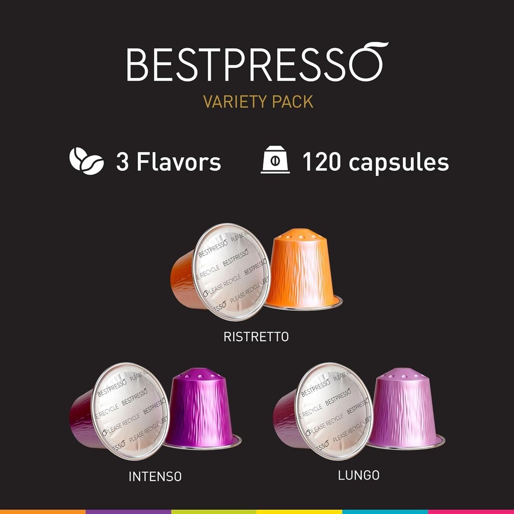 Bestpresso Coffee For Nespresso Original Machine 120 20 Count (Pack of 6) Description Features: Get a kick out of the distinctive flavor and creamy body of authentic Italian espresso. Kosher certification: this product is certified kosher by the orthodox union. Coffee capsules compatible with Nespresso Original coffee machines High quality 100% natural & unique espresso in convenient Nespresso compatible pods 6 boxes, containing 20 capsules each, 120 capsules total No preservatives, no sugar or flavoring added, Over 50% Rainforest Alliance Certified Sustainable coffee in support of small coffee producers. Product from Spain Product Details: Product Dimensions : 10.7 x 10 x 5.3 inches; 2 Pounds Item model number : BST06106 Manufacturer : Bestpresso Units : 120 Count Brand: Bestpresso Item Form: Capsule Flavor: intense variety pack Caffeine Content Description: Decaffeinated Roast Level: Dark Roast Handling We will ship all orders within 1 business day of payment. Delivery We Do Not Ship Outside of the Continental US. Return Policy All items qualify for returns within 30 days of receipt. Buyer is responsible for return shipping on any item that is not damaged. Feedback We take our reputation seriously, we buy and sell online, so we understand the value of trust. If you are unsatisfied with your order, please contact us and we will work with you to resolve it to your satisfaction.