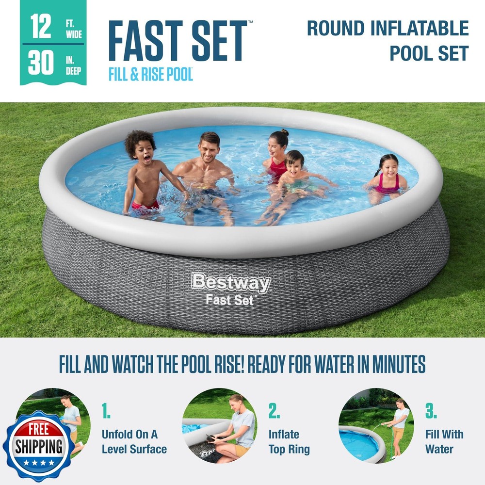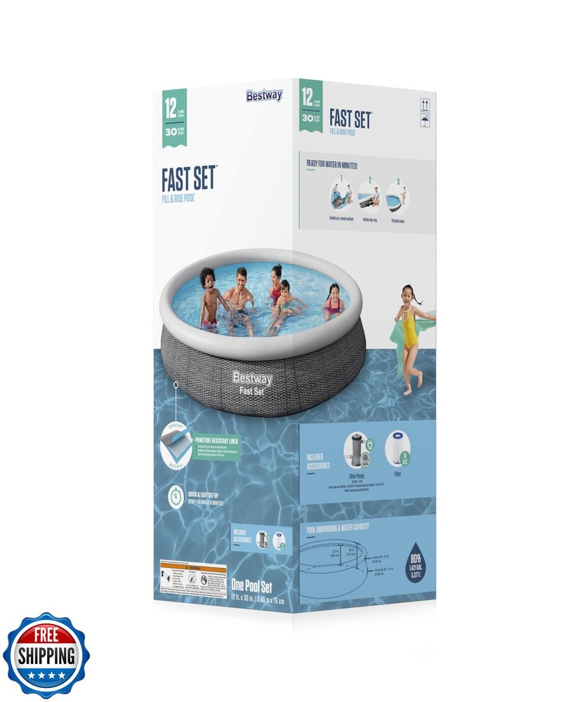 Bestway Fast Set Inflatable Pool Set (12' x 30") | Rattan Print | Round Above Ground Pool | Includes Filter Pump and Repair Patch Features ENDLESS SUMMER FUN: Kids and adults of all ages can enjoy swimming and splashing in Bestway's Fast Set Above Ground Pool. It's the ultimate pool for backyard convenience with minimal setup. Great for families with younger children. MADE TO LAST: The sturdy, 3-layer DuraPlus liner is reinforced for strength and is 85% more puncture-resistant than PVC. Use this pool summer after summer. The rattan style print brings a classy look and feel to your backyard. EASY TO ASSEMBLE: Just select a level surface, inflate the top ring, fill the pool with water and you'll be splashing around in no time. This pool set also includes a 530 gallon filter pump and a repair patch kit. FRESH AND CLEAN WATER: This pool set includes a 530 gallon filter pump and filter cartridge to maintain the pool water's cleanliness. This pool's water capacity (Recommended 80% full) is 1,421 gallons. DRAINS QUICKLY: At the end of the season, closing the pool is a breeze. A built-in flow control drain valve attaches to a garden hose to drain away water. Shipping Free & Fast Shipping: We offer free shipping to most of the USA with a normal delivery time of 3-7 days. However, due to the current situation, additional delivery time (up to 3 weeks) may be required for some items. Alternative Carriers: We may use alternative carriers (e.g., USPS, FedEx, UPS) to ensure your package arrives safely and on time. Due to the use of multiple carriers, we are unable to provide a tracking number automatically. Handling Time: Orders are processed and shipped within 1-2 business days of receiving cleared payment. Shipping Restrictions: Shipping to Alaska, Hawaii, Puerto Rico, Guam, and other US territories may incur shipping charges or delivery restrictions. Please contact us before ordering, or your order can be refunded/cancelled. State Restrictions: Certain items may not be shipped to California due to state regulations. Contact for Tracking Updates: If you require tracking updates or have any concerns about the delivery of your order, please feel free to contact us, and we will be happy to assist you. Return Policy 30-Day Hassle-Free Returns: If you are not completely satisfied with your purchase, you can return the item for free within 30 days of receiving it for a full refund or exchange. Easy Return Process: Contact us, and we will provide you with a prepaid return shipping label and detailed instructions. No Restocking Fee: There are no restocking fees for returns. However, the buyer is responsible for return shipping costs if the return is not due to a seller"s error. Refund Processing: Refunds will be processed within 1 business day of receiving the returned item in its original condition. Feedback Your feedback is extremely important to us. We strive to provide the best products and customer service possible. If you are satisfied with your purchase, please take a moment to leave us a positive review. If you have any concerns or issues with your order, please contact us before leaving negative feedback. We are committed to resolving any problems and ensuring your satisfaction. Contact Us If you have any questions or concerns, please feel free to reach out to our customer support team. You can contact us through the eBay messaging system. We are available Monday to Friday, 9:00 am to 5:00 pm EST, and we will do our best to respond to your inquiry within 24 hours. Thank you for supporting our small family business!
