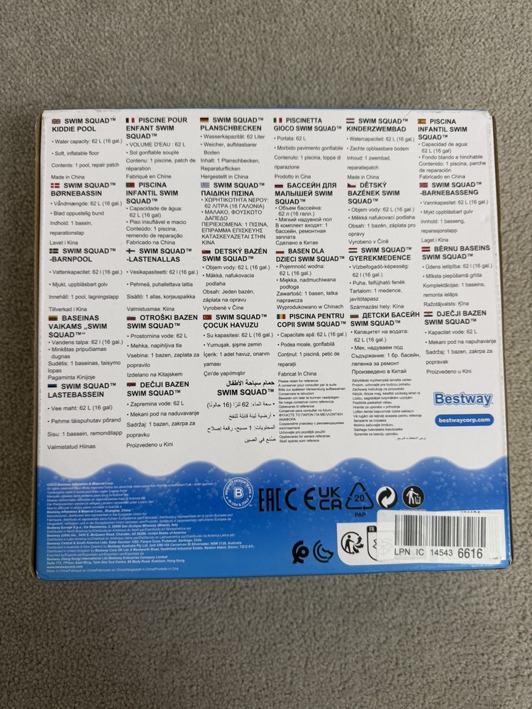 The Bestway Swim Squad™ Kiddie Pool is a colourful inflatable paddling pool designed for toddlers and young children to enjoy safe water play during warm weather. Compact and easy to set up, it’s ideal for gardens, patios, or outdoor summer fun. ⸻ Key Features • Official Bestway Swim Squad™ kiddie pool • Bright, child-friendly multi-colour design • Soft inflatable floor for comfort • Water capacity: 62 L (16 gal.) • Size: 1.02 m x 25 cm (40" x 10") • Age recommendation: 2+ years • Quick and easy inflation • Ideal for garden summer play ⸻ What’s Included • 1 × Inflatable kiddie pool • Repair patch • Original retail box 2601-517-ST-S