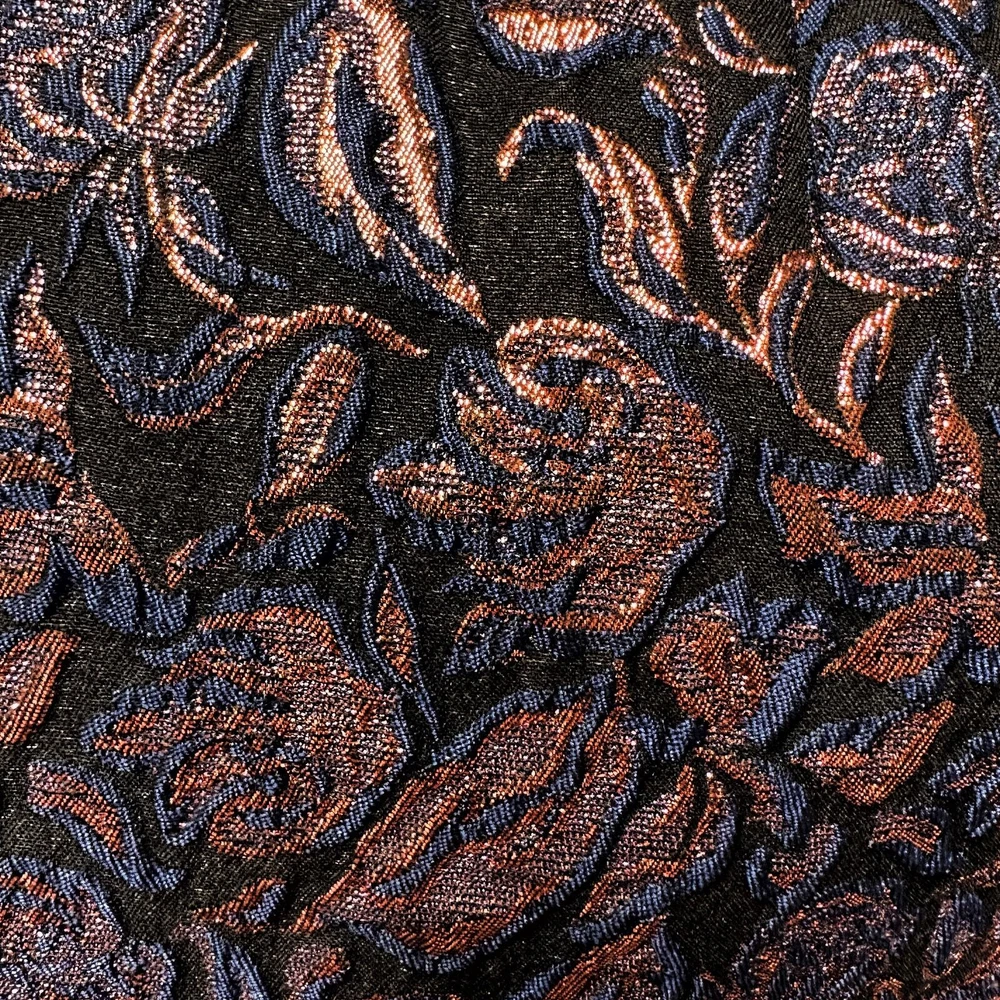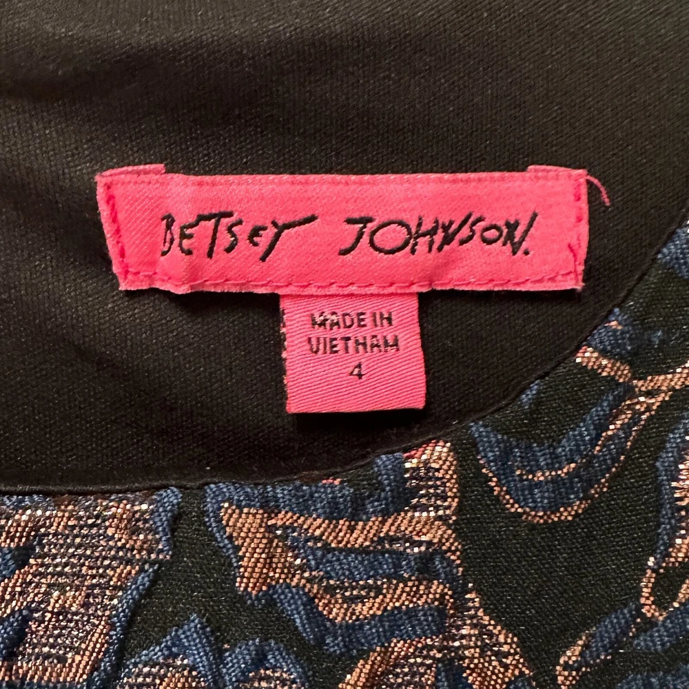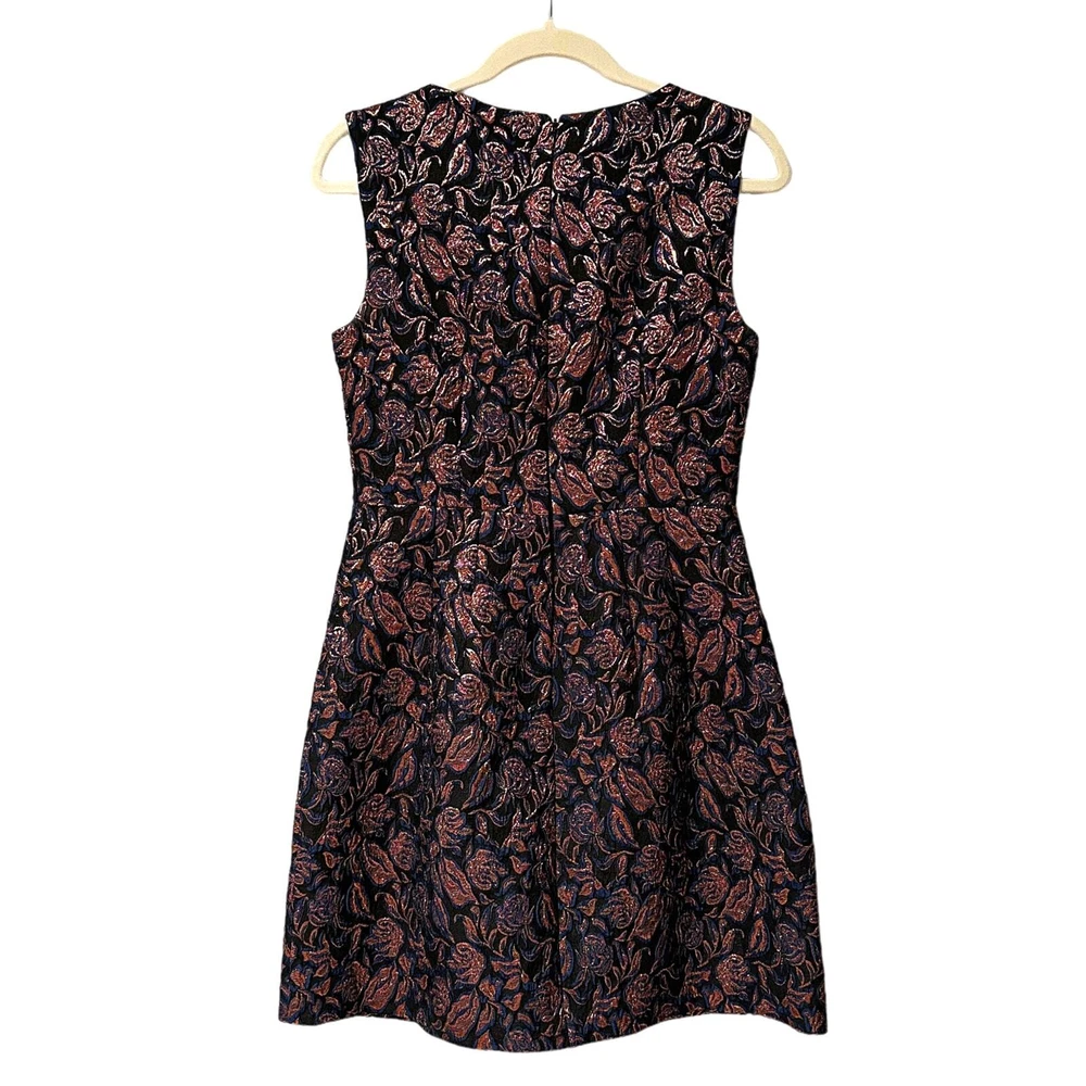 Sumptuous texture, a sophisticated color combination, all in a classic silhouette—what's not to love? - Metallic floral pattern - Boat neckline - Wide straps (bra friendly!) - Defined waist - Straight skirt - Hits above the knee - Fully lined - 57% polyester / 34% cotton / 7% metallic / 2% spandex - Size 4 Excellent condition, no flaws to note!