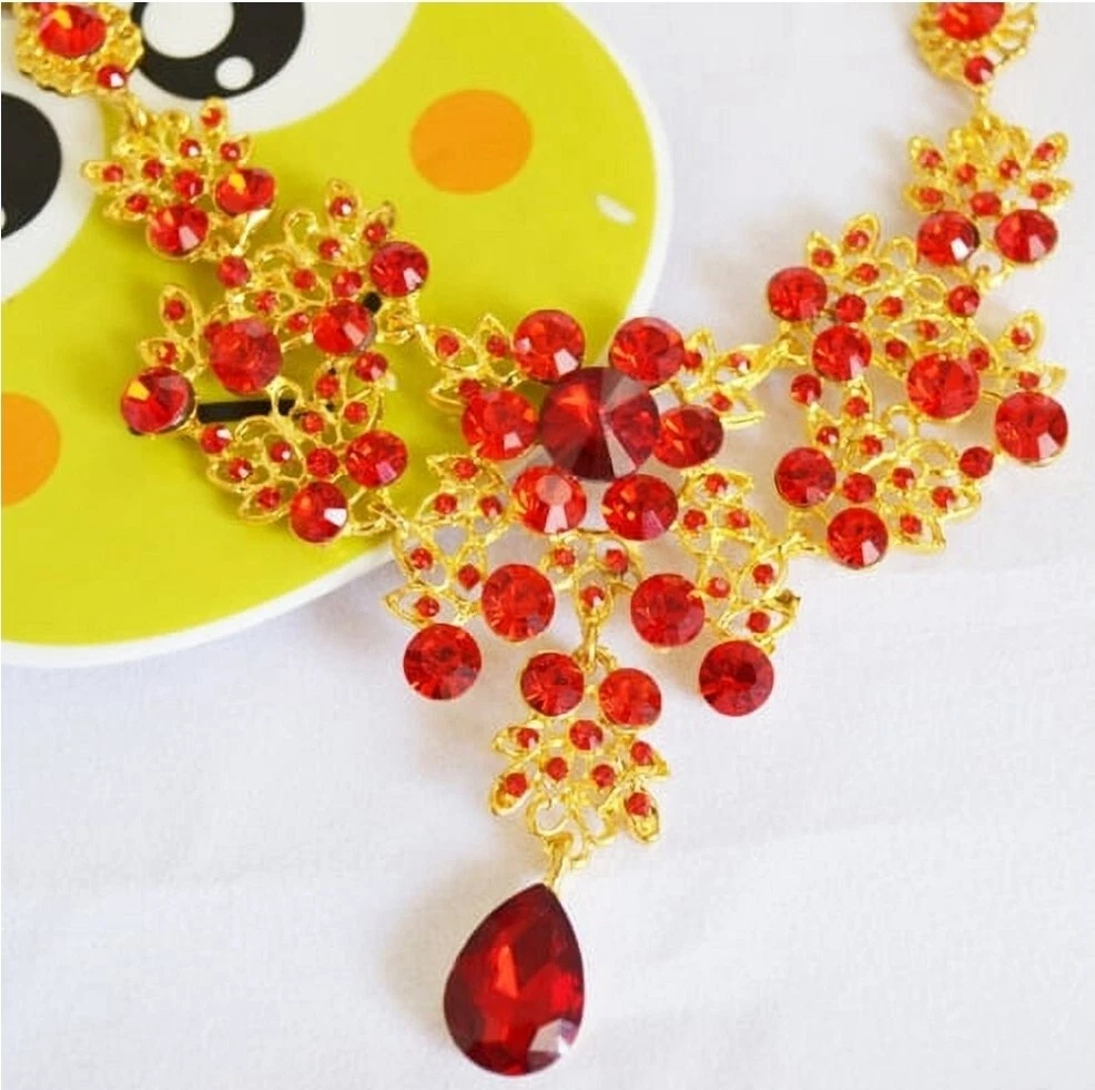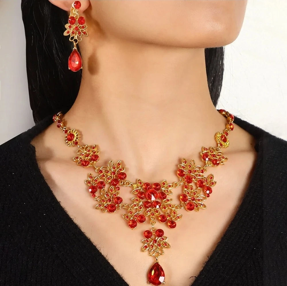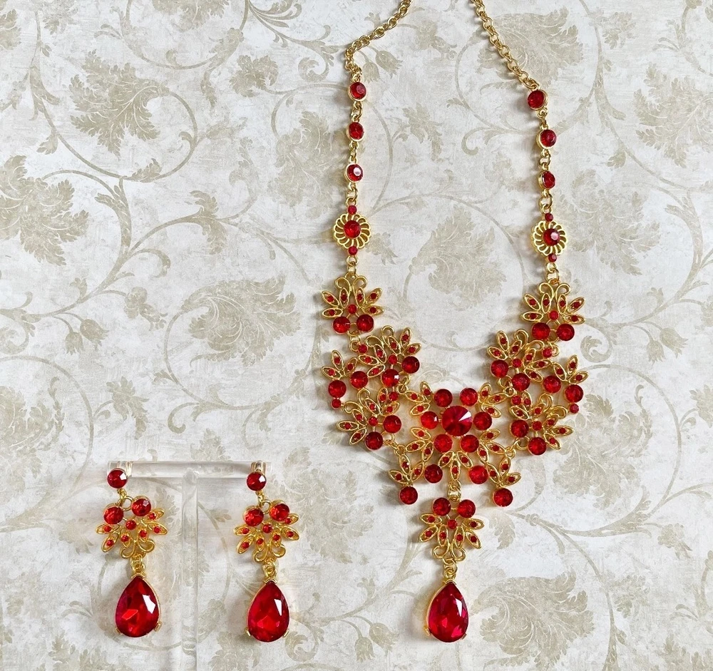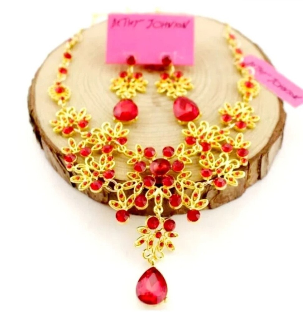 Elevate your jewelry collection with this stunning Betsey Johnson Gold Red Crystal Floral Necklace Earring Set. The set includes a beautiful round-shaped necklace and matching earrings, adorned with vibrant red crystals and rhinestones. The yellow gold-plated metal adds an extra touch of elegance to the set, making it perfect for any occasion. The necklace and earrings are of excellent cut, showcasing a brilliant and sparkling finish. The set brand Betsey Johnson. It is a perfect gift for your loved ones or a lovely treat for yourself.