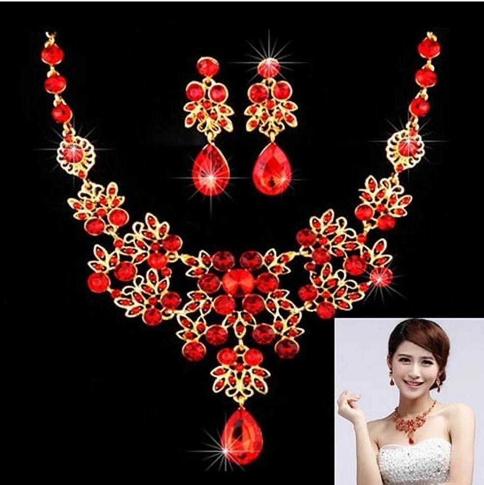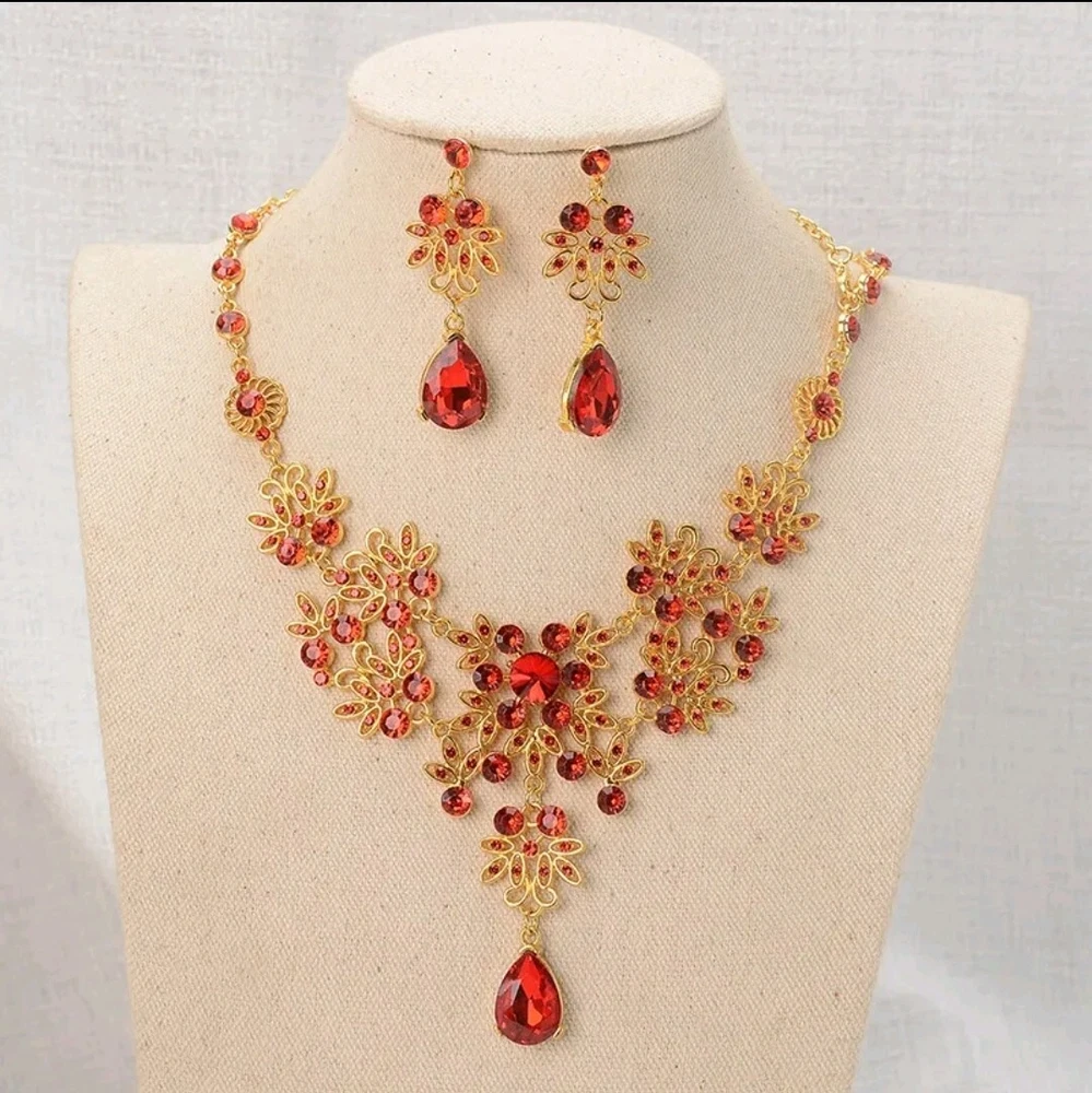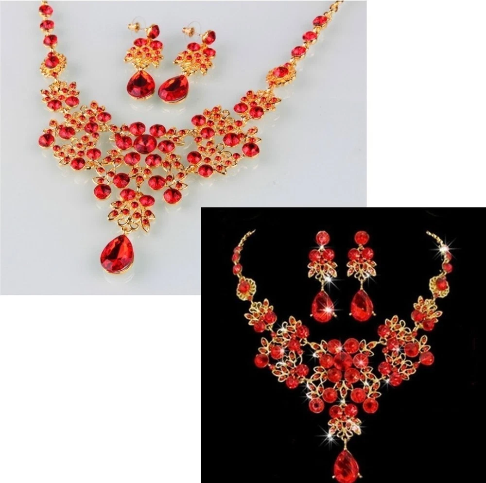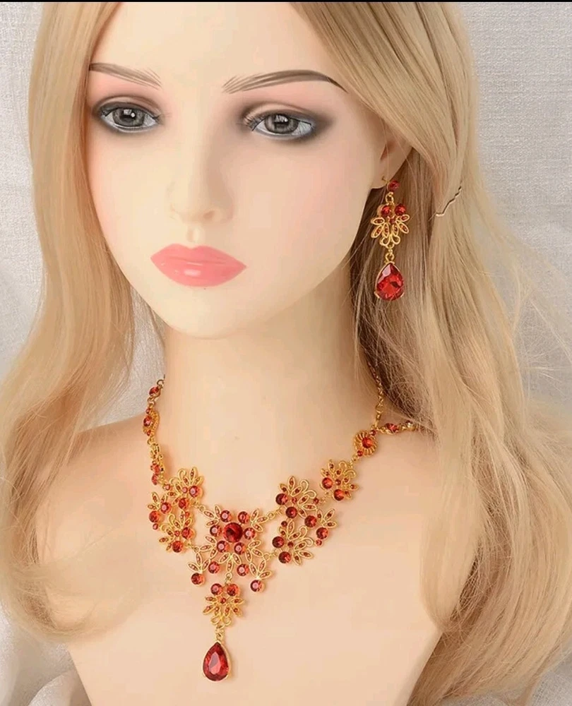 Elevate your jewelry collection with this stunning Betsey Johnson Gold Red Crystal Floral Necklace Earring Set. The set includes a beautiful round-shaped necklace and matching earrings, adorned with vibrant red crystals and rhinestones. The yellow gold-plated metal adds an extra touch of elegance to the set, making it perfect for any occasion. The necklace and earrings are of excellent cut, showcasing a brilliant and sparkling finish. The set brand Betsey Johnson. It is a perfect gift for your loved ones or a lovely treat for yourself.